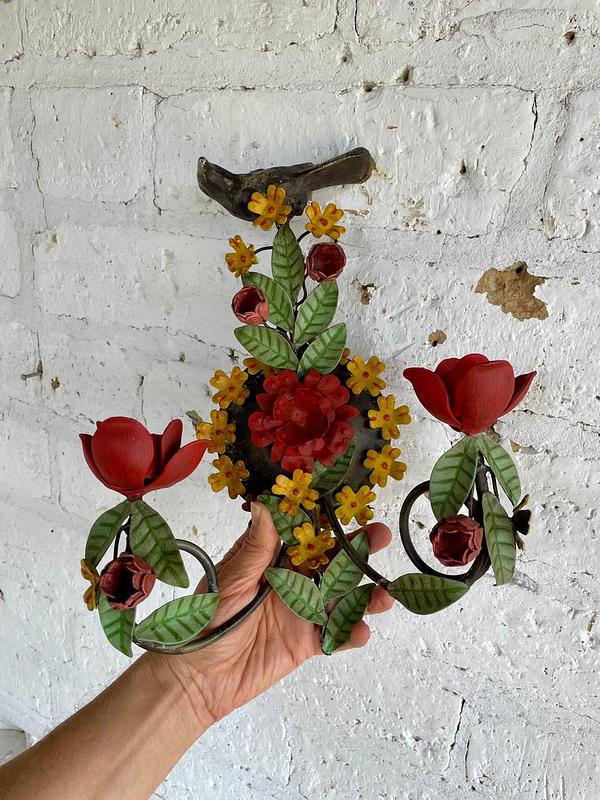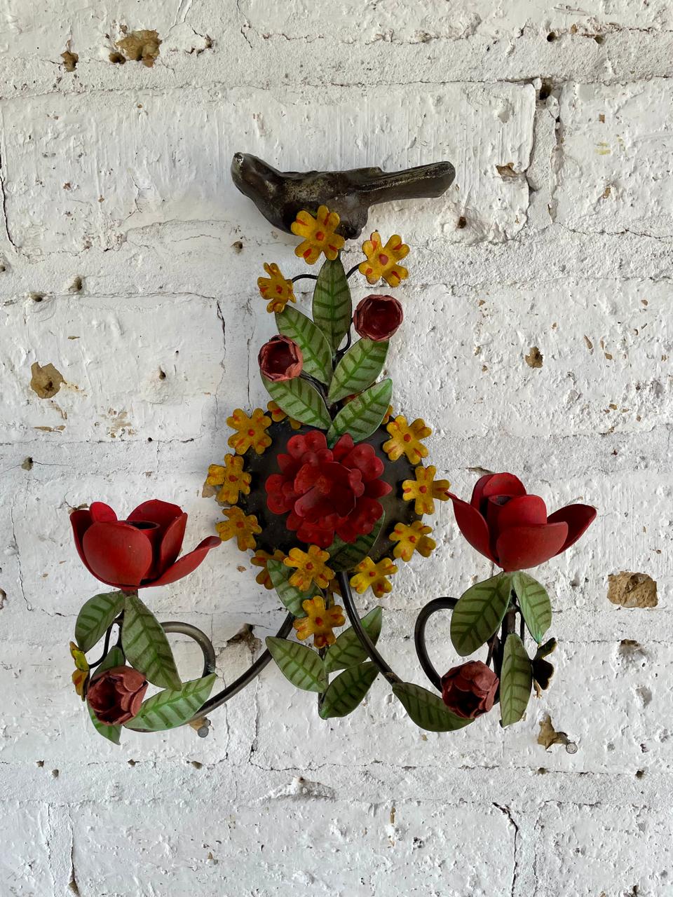 Candelabro artesanal de pared elaborado en lámina metálica gruesa con espacio para dos velas, la parte superior está decorado con un pájaro en hierro fundido.