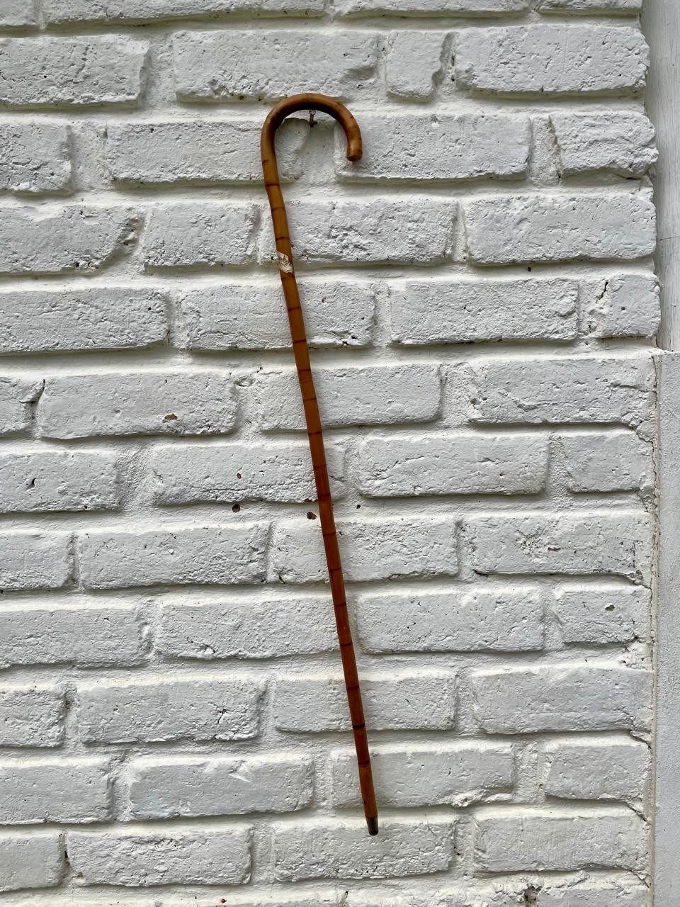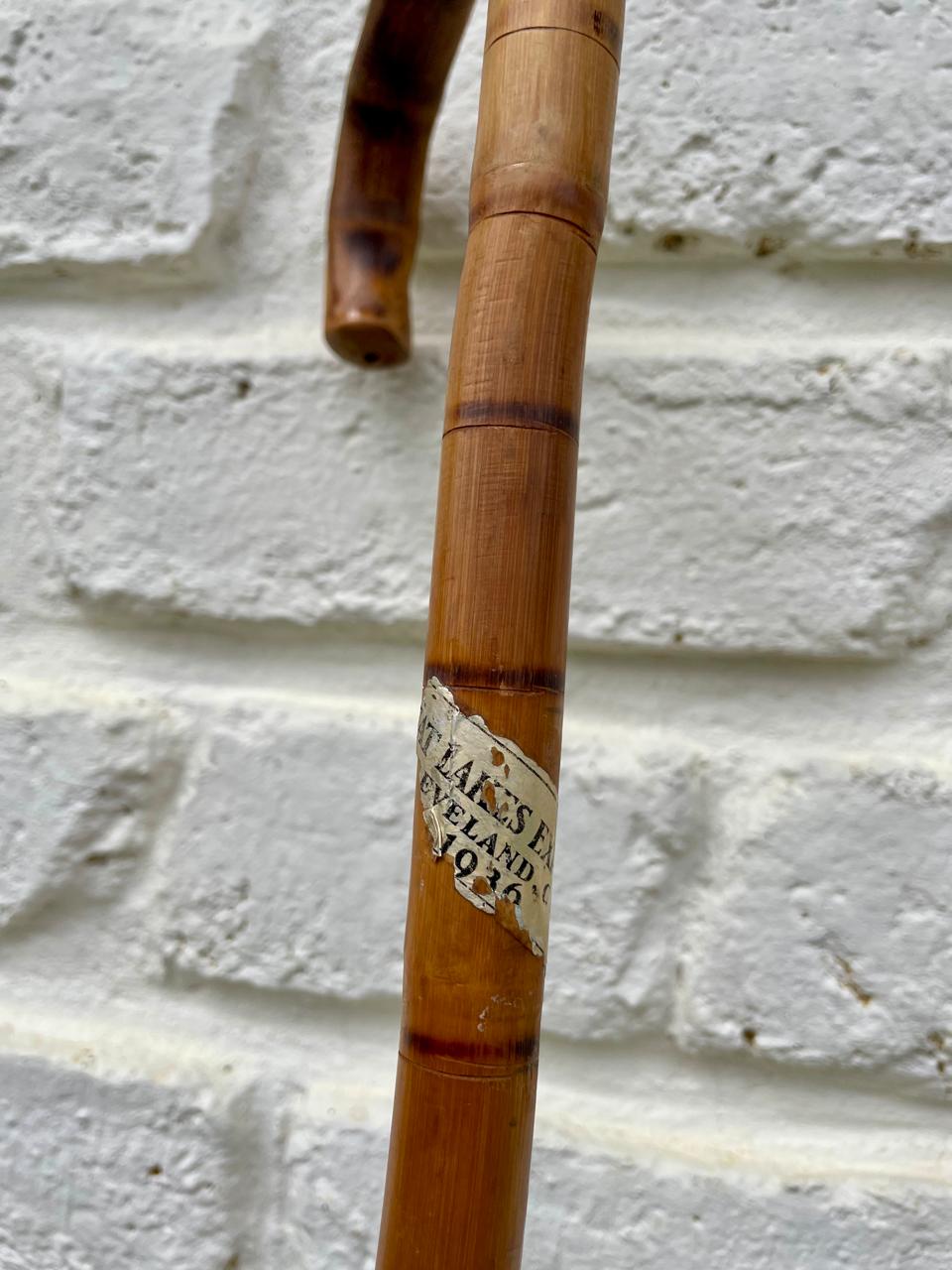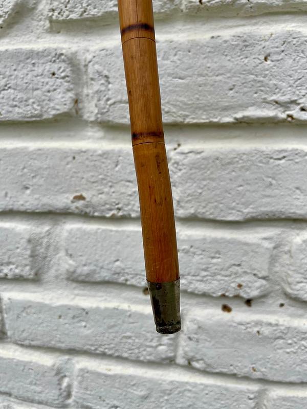 Bastón antiguo de bambú, con mango curvado y punta metálica, presenta desgastes en el barníz por el uso.