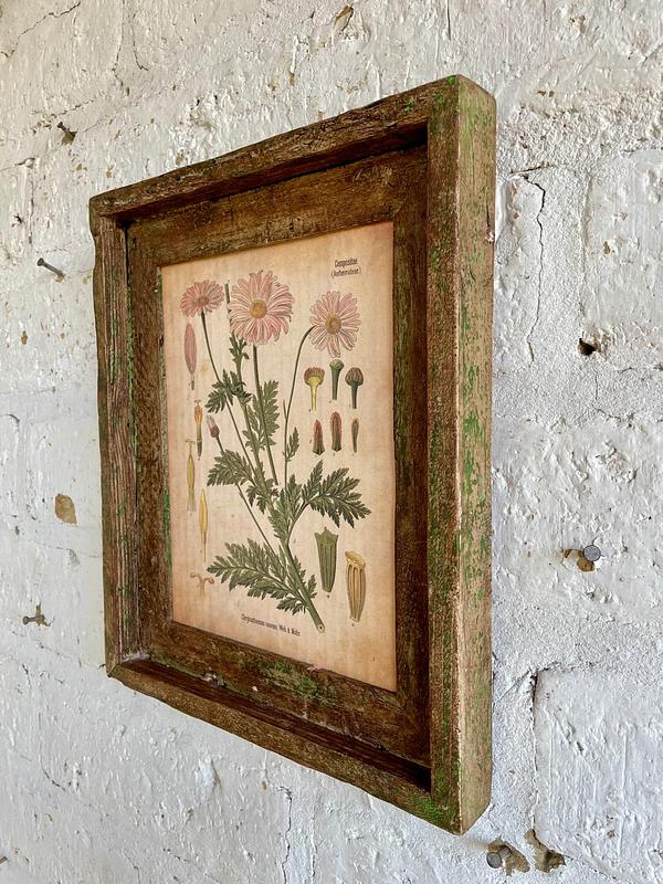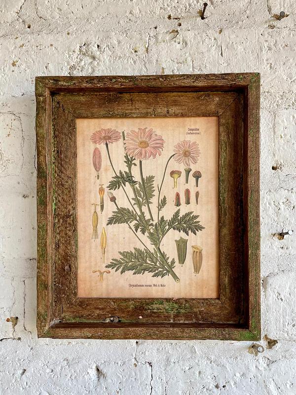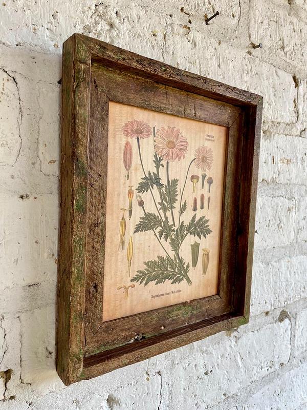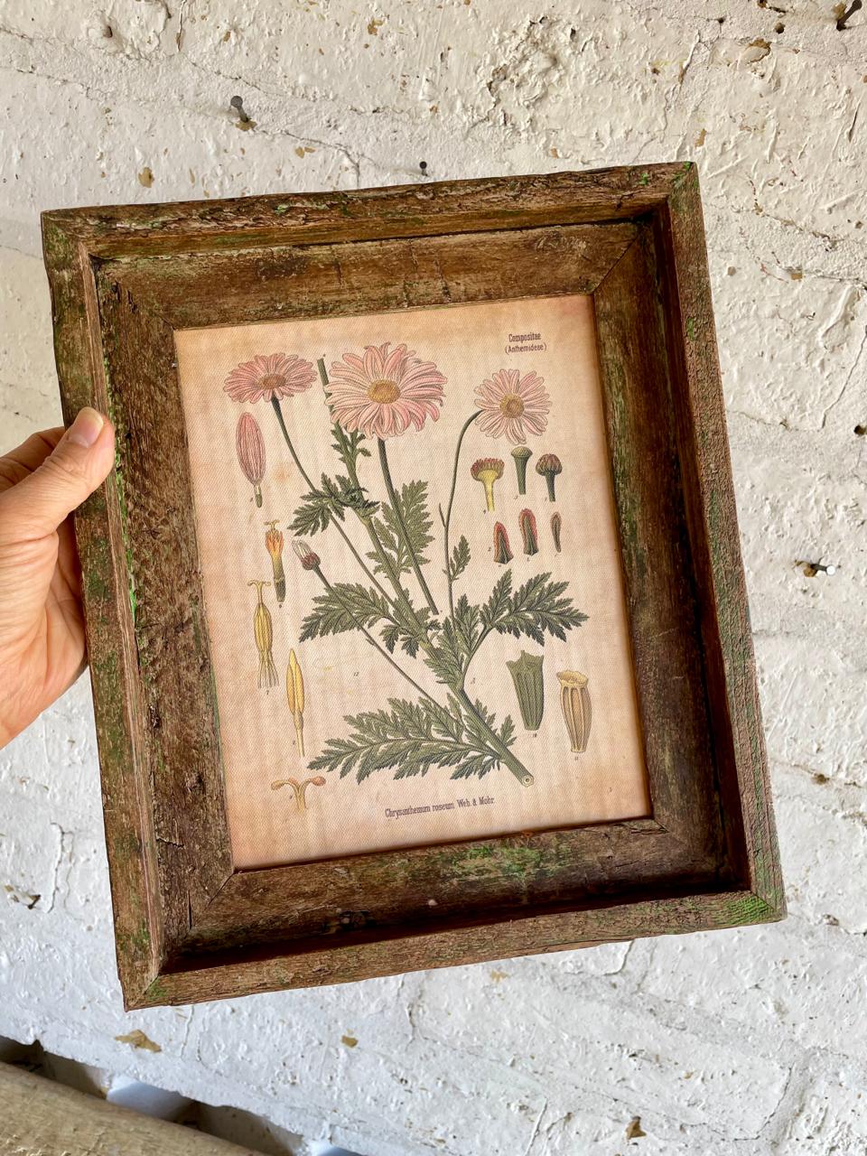 Lámina impresa en lona sintética enmarcada con moldura de madera rústica, elaborada en el taller de la tienda. La lámina es una copia del dibujo chrysanthemum roseum del Atlas de plantas medicinales publicado en 1887 por el alemán Hermann Adolph Köhler. El marco de madera rústica decorada con pintura desgastada ha sido una elección acertada para resaltar la reproducción de un dibujo antiguo.