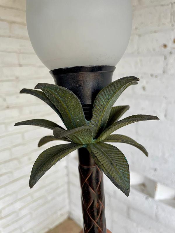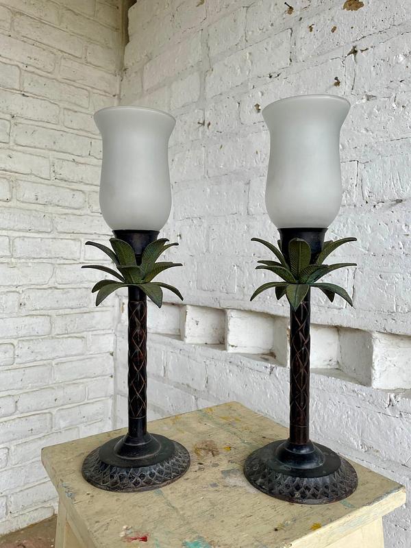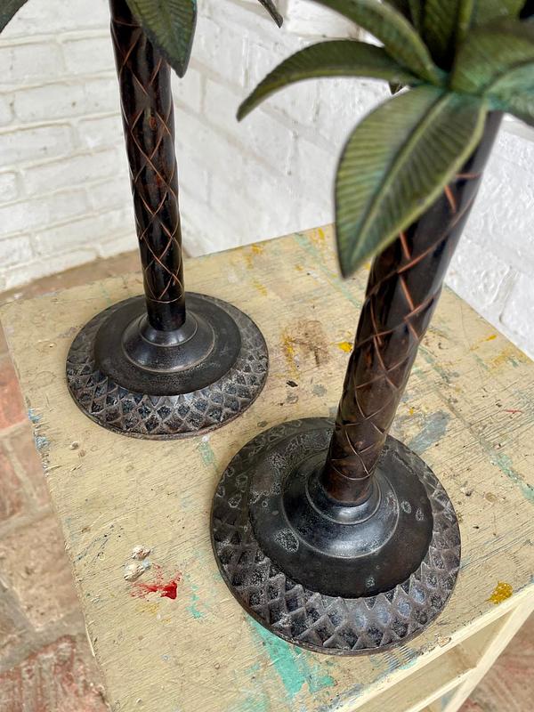 Pareja de candelabros con forma de palmera, la  base está elaborada en lámina metálica gruesa y las hojas en hierro fundido, los briseros son de vidrio lechoso. Fabricados en India en los años setenta, se encuentran en buen estado.