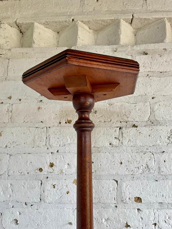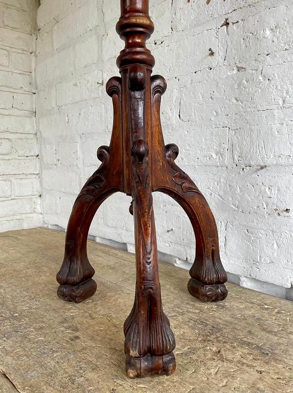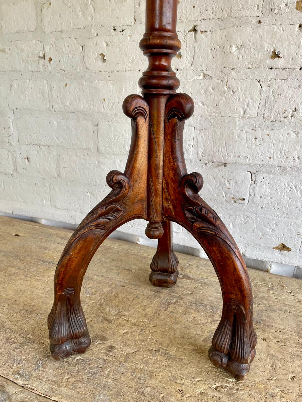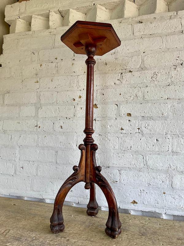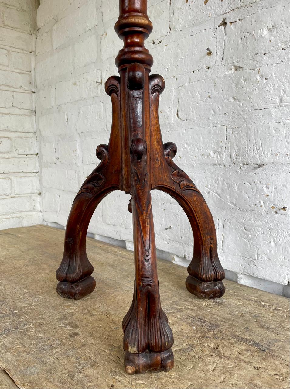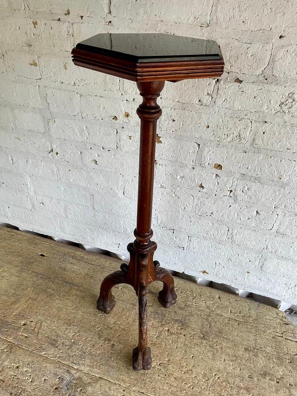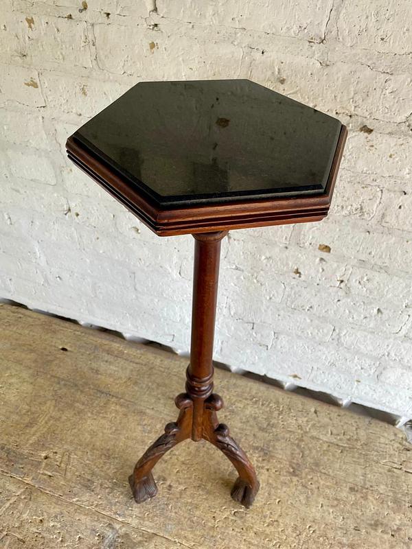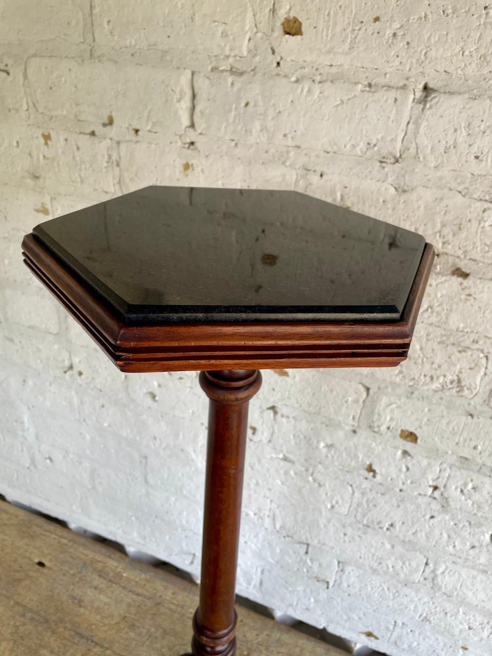Mesa alta en madera de cedro tallada la superficie es un hexágono de granito negro, la base remata sobre 3 patas. Se encuentra en buen estado.