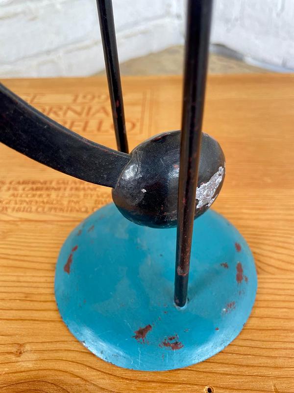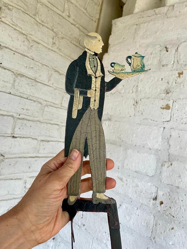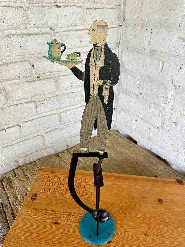 Figura de mayordomo en lámina metálica gruesa decorada con pintura desgastada dando apariencia antigua. La figura se balancea por el contrapeso del péndulo sobre el punto de apoyo, demostrando el principio del equlibrio estable. Elaborado en Indonesia en los años ochenta recreando un juguete antiguo. Se encuetra en buen estado con algunos desgastes en la pintura por el uso y el paso del tiempo.