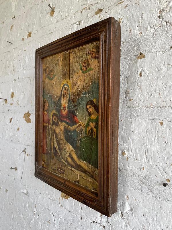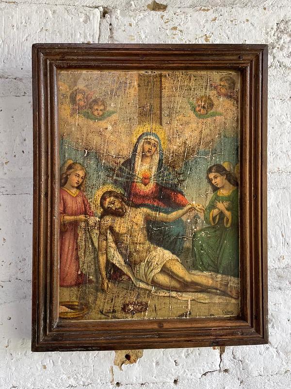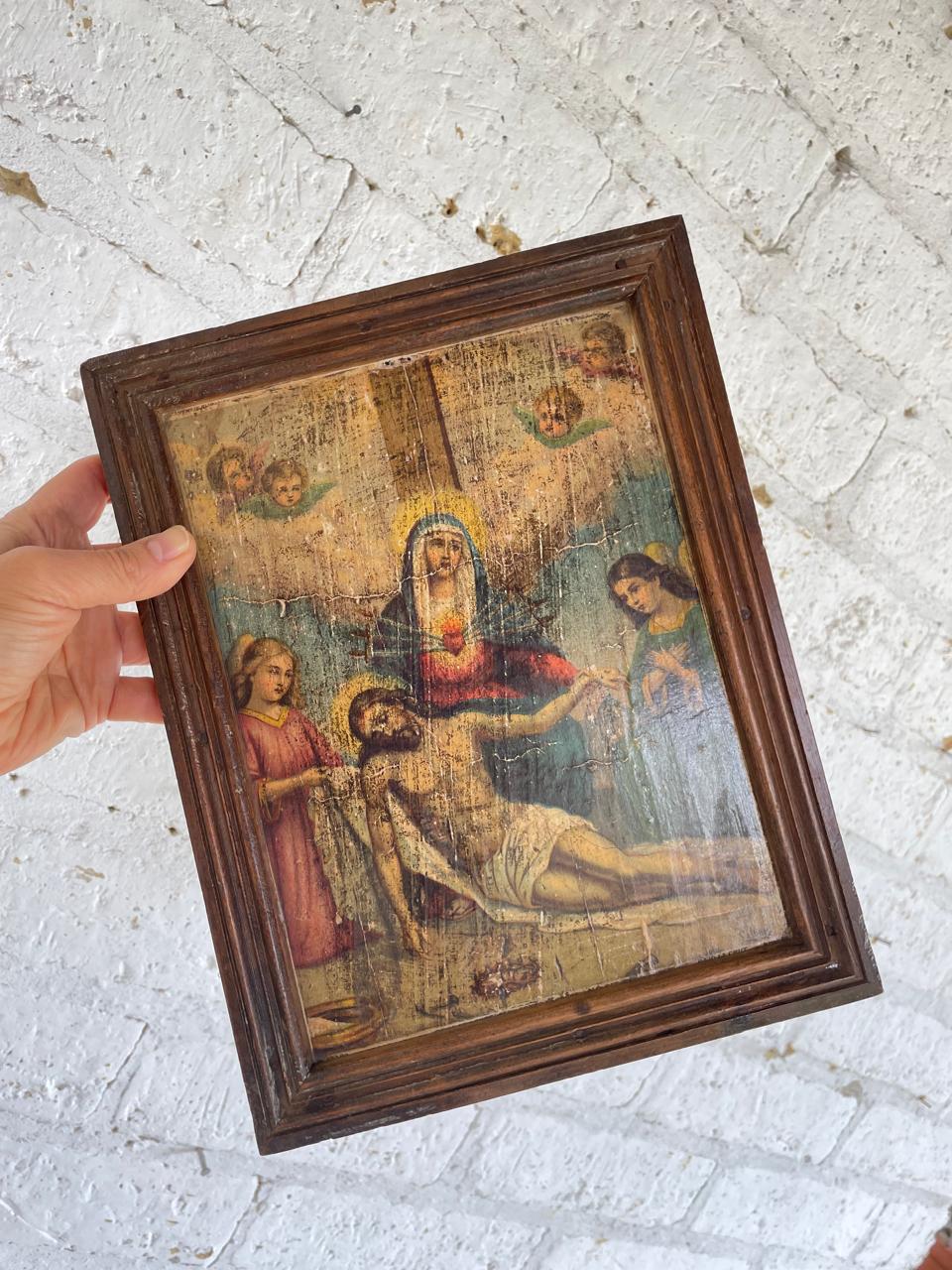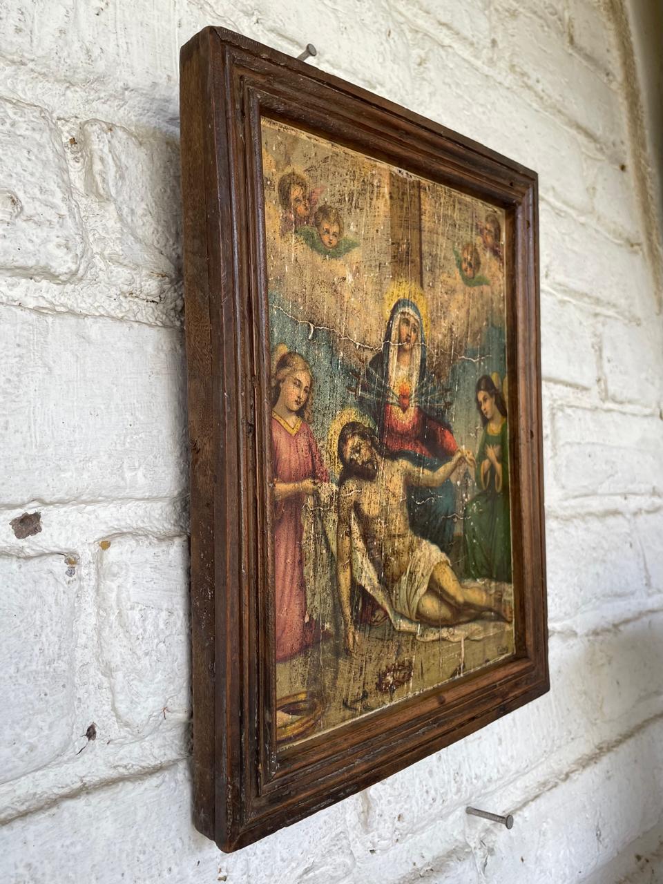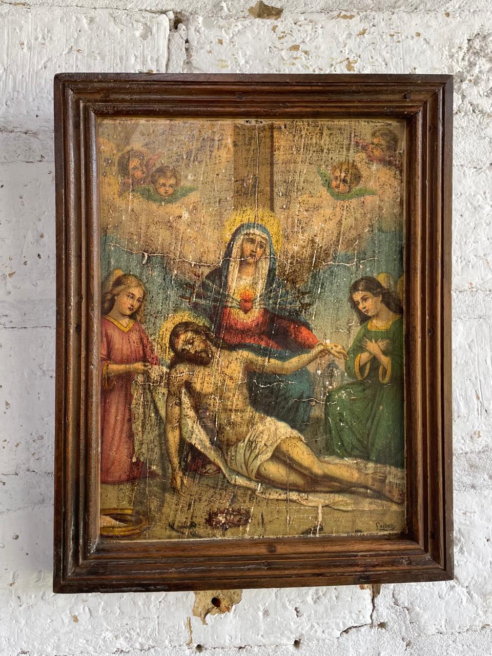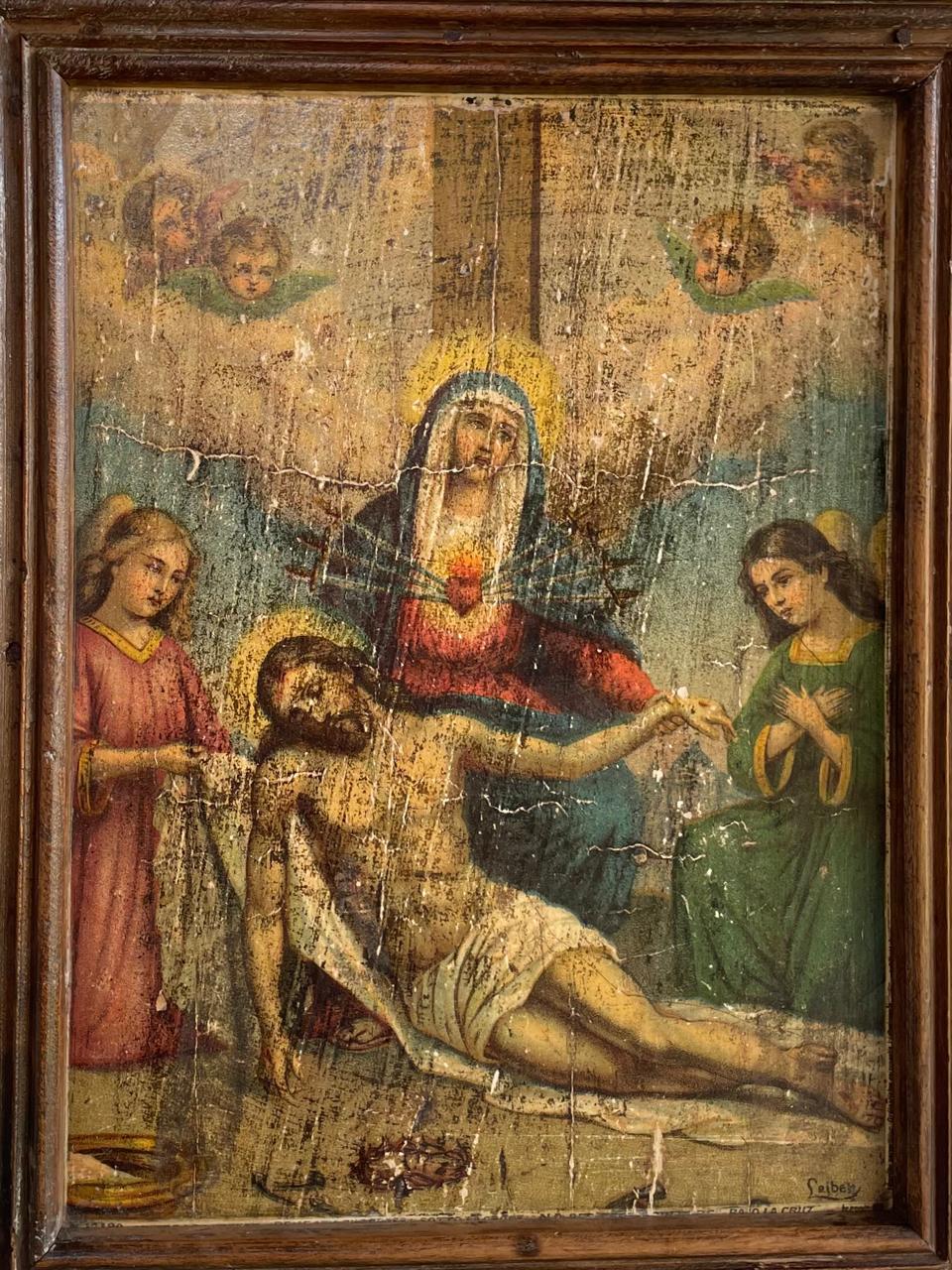Cuadro de la Decimotercera Estación del Vía Crucis, perteneció a una capilla campesina de una antigua hacienda en la zona rural de Sáchica en Boyacá, esta región tiene una fuerte tradición en la conmemoración del Vía Crucis, con diversas manifestaciones artísticas y procesiones religiosas. Las obras de arte devocionales en estas capillas eran elaboradas por artistas intuitivos como aporte a la tradición católica. La lámina impresa en cartón grueso, con marquillas de haber sido elaborada en europa se pegó sobre una tabla rústica emarcada con moldura de madera. La lámina, aunque conservada, presenta signos evidentes de deterioro y antigüedad (craquelado, manchas y desgaste). La madera con golpes y endiduras se encuentra libre de termitas