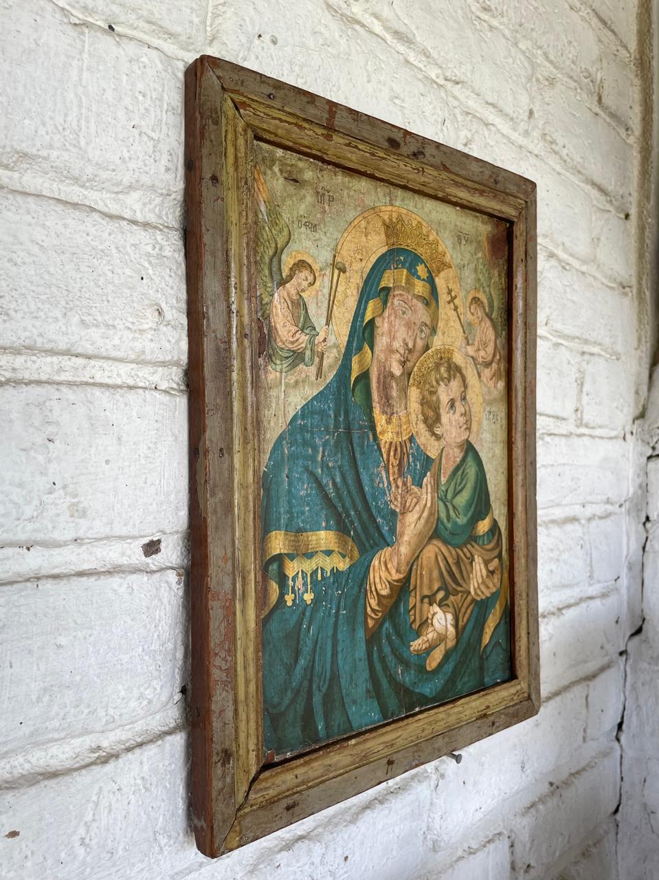 Cuadro elaborado por campesinos Boyacenses en los años 50, sobre tabla rústica está pegada la lámina religiosa importada, aquirida por locales en la Basilca de Chiquinquira. Una moldura artesanal hace las veces de marco a la tabla base. Iconografía del arte popular religioso de la región Andina de Colombia, elaborada con sencillez y rusticidad se ha conservado por varias generaciones como signo de fe. Los colores de la lámina se han desvanecido presentando manchas, desgastes y rasgaduras. La madera está libre de termitas.