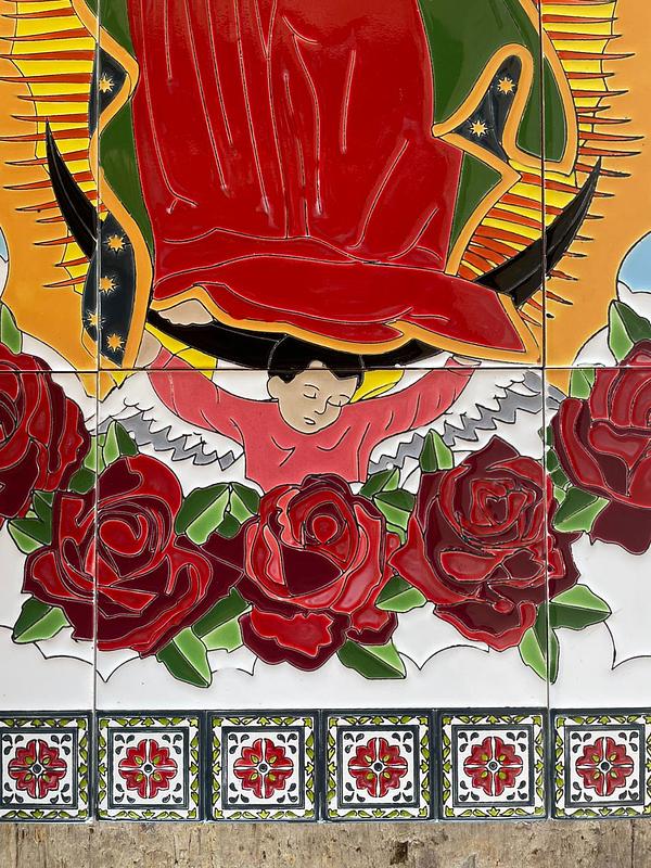 Imagen pintada a mano sobre baldosa y quemada a alta temperatura. Apta para exteriores. Con barnices de calidad para garantizar su exposición a la intemperie, sol, lluvia, etc., sin desteñirse. Colores garantizados de por vida. Ideal para empotrar en la pared, decorar fachadas y portales. Elaborada en 12 baldosas de 20 x 20 cm cada una.