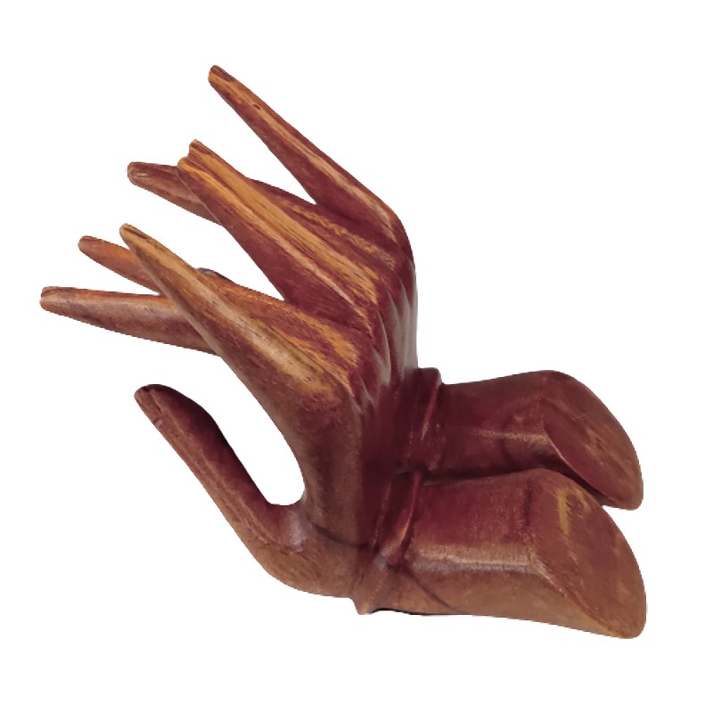 Manos talladas artesanalmente en madera. Puede utilizarse como exhibidor de tajetas.