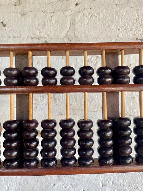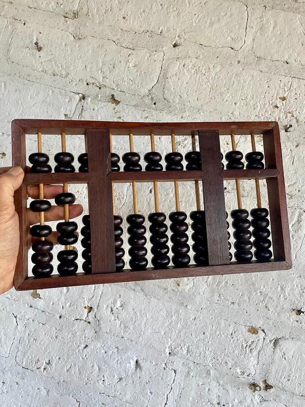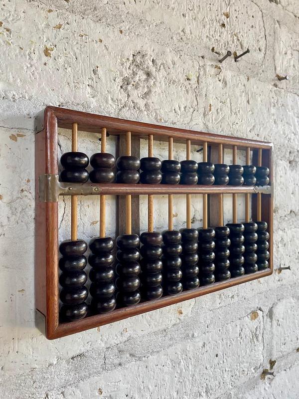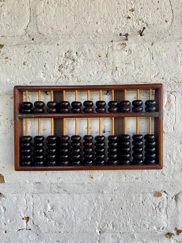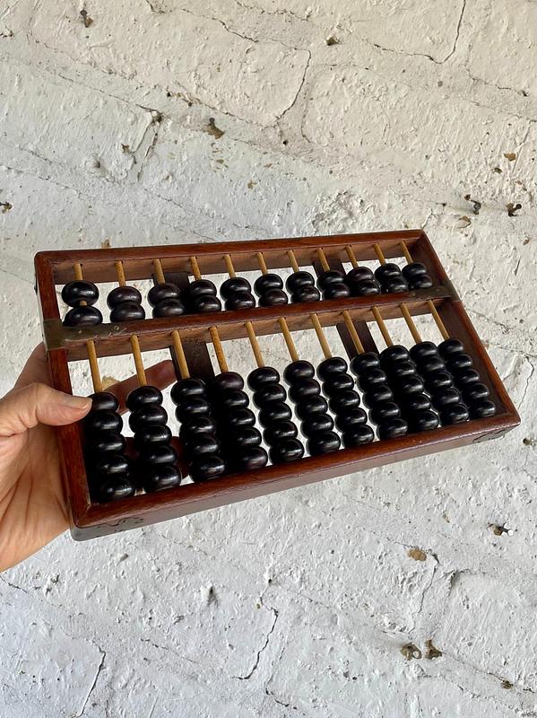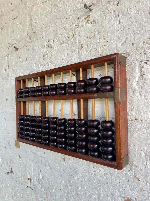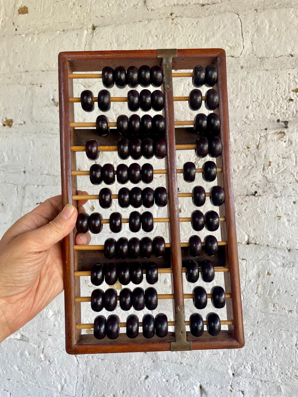 Abaco con marco, 11 varillas y cuentas de madera, los refuerzos de las esquinas son de lámina de bronce. Elaborado en China en los años ochenta.