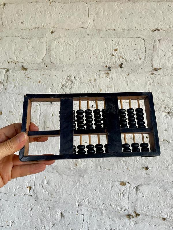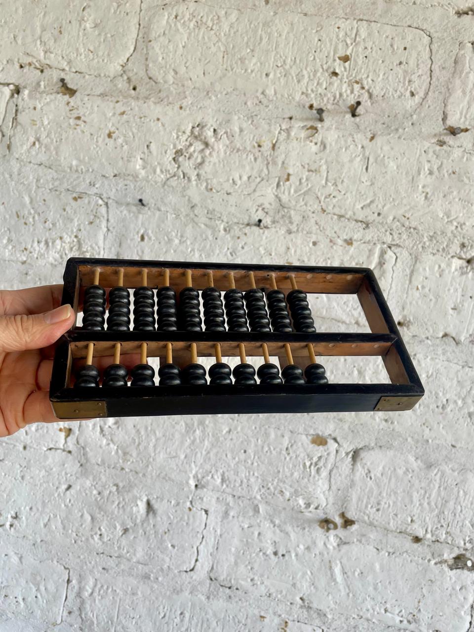 Abaco con marco, 10 varillas y cuentas de madera, los refuerzos en las esquinas son en lámina de bronce. Este ábaco originalmente era de 13 varillas, le faltan 3 varillas. Elaborado en China en los años ochenta.