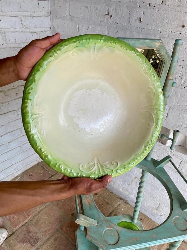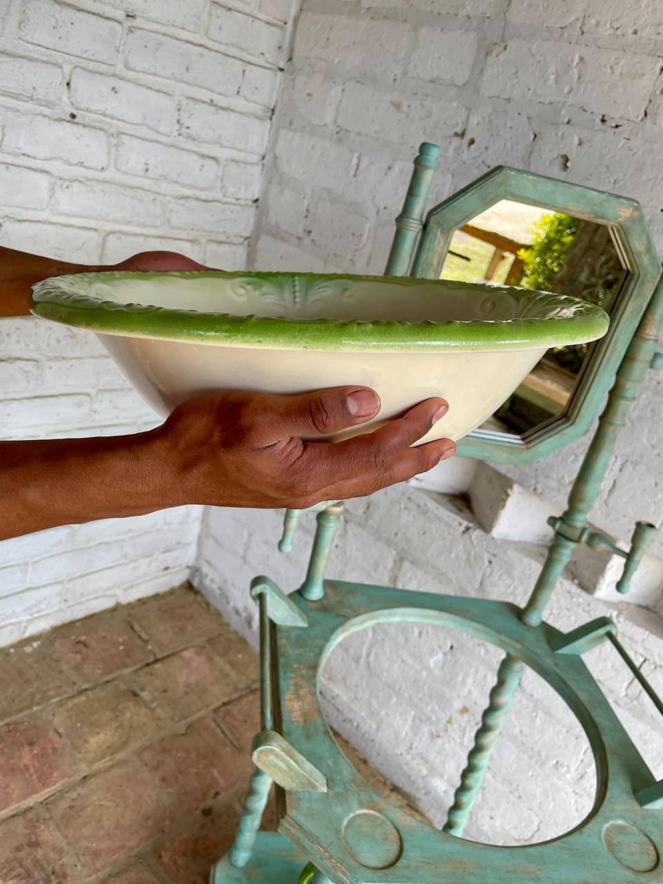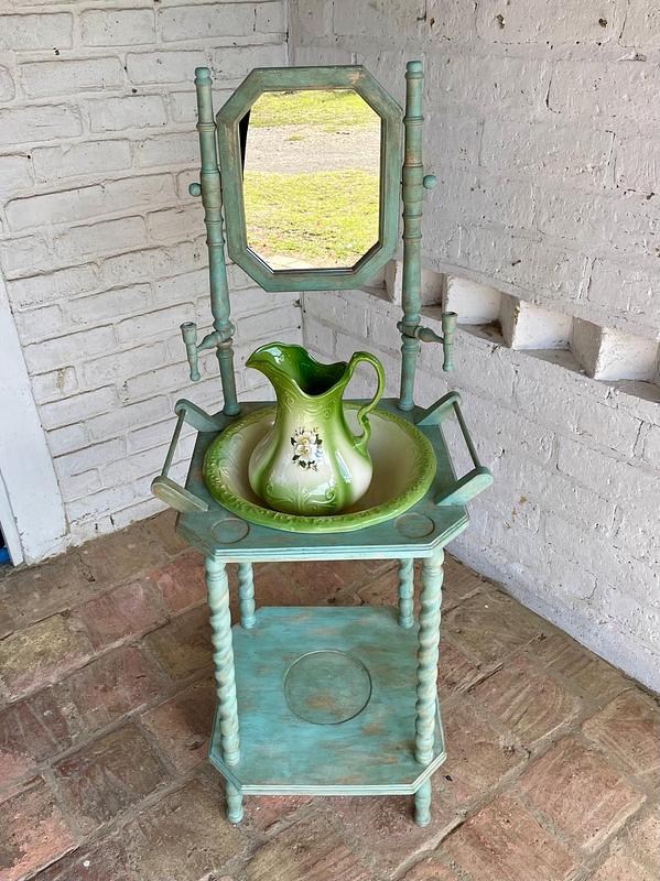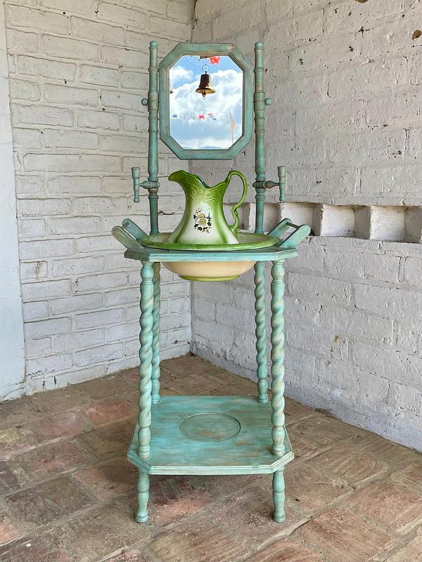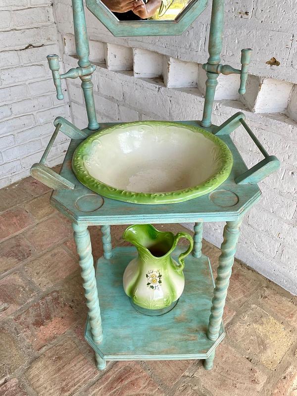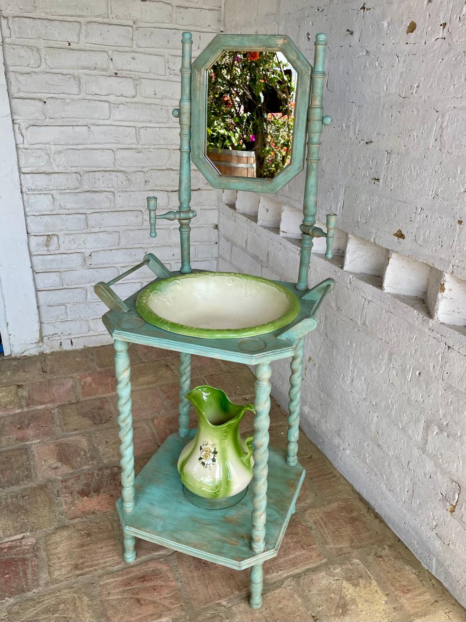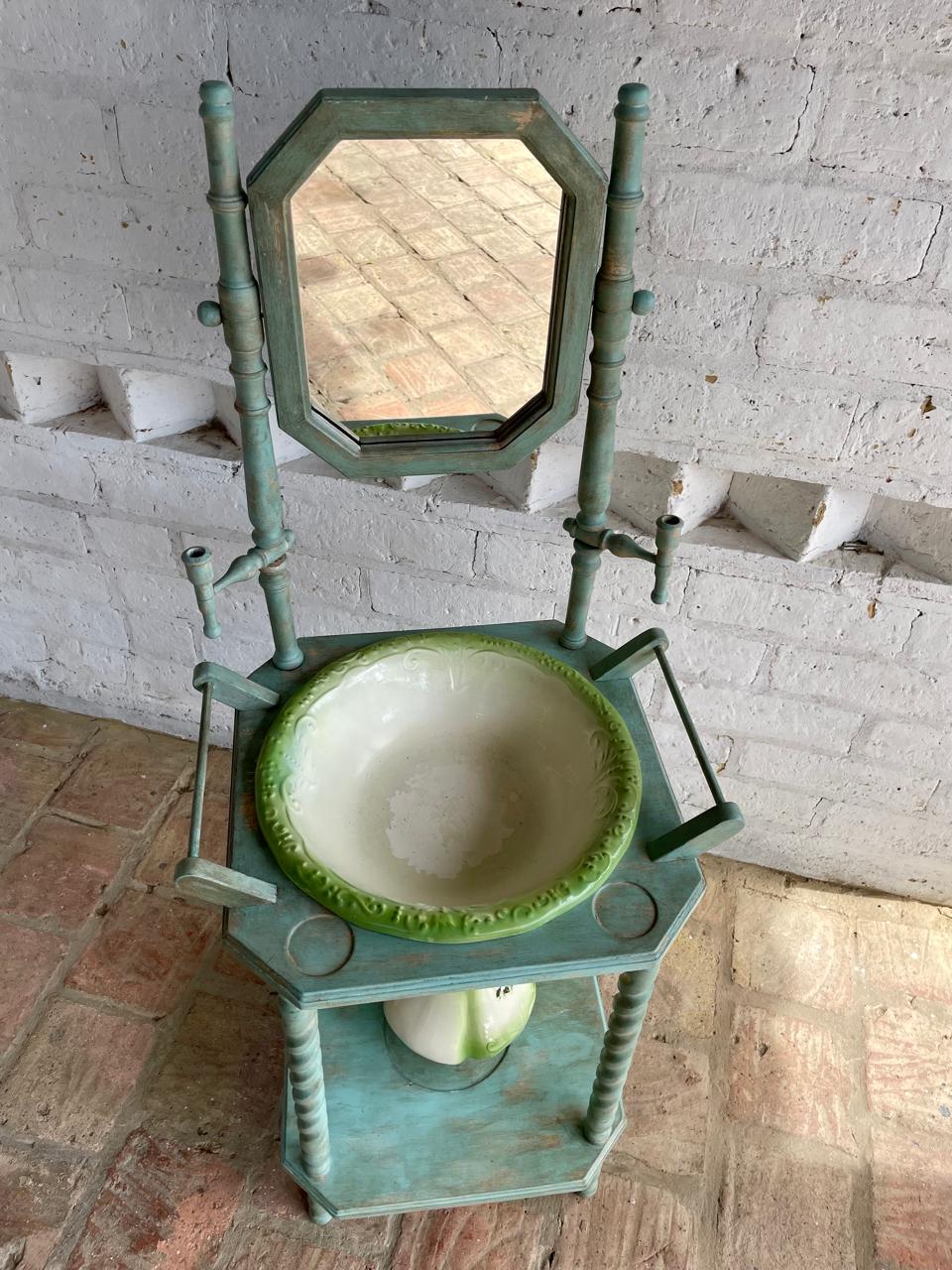 Soporte para lavabo de madera vintage con espejo, candelabros, cuenco y jarra. Tiene un candelabro a cada lado en la parte superior y soportes para toallas. Incluye un platón y una jarra de porcelana en buen estado con desgastes en la pintura.