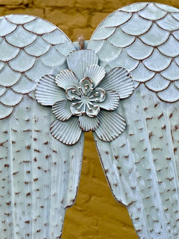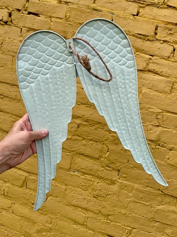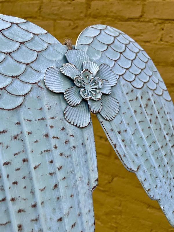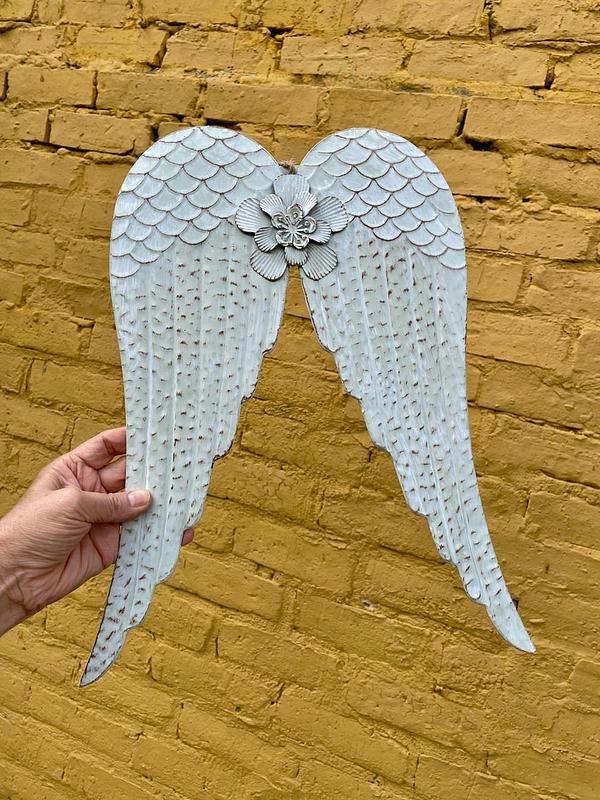 Alas artesanales elaboradas en lámina metálica gruesa repujada, decoradas con pintura blanca desgastada con arapiencia envejecida.