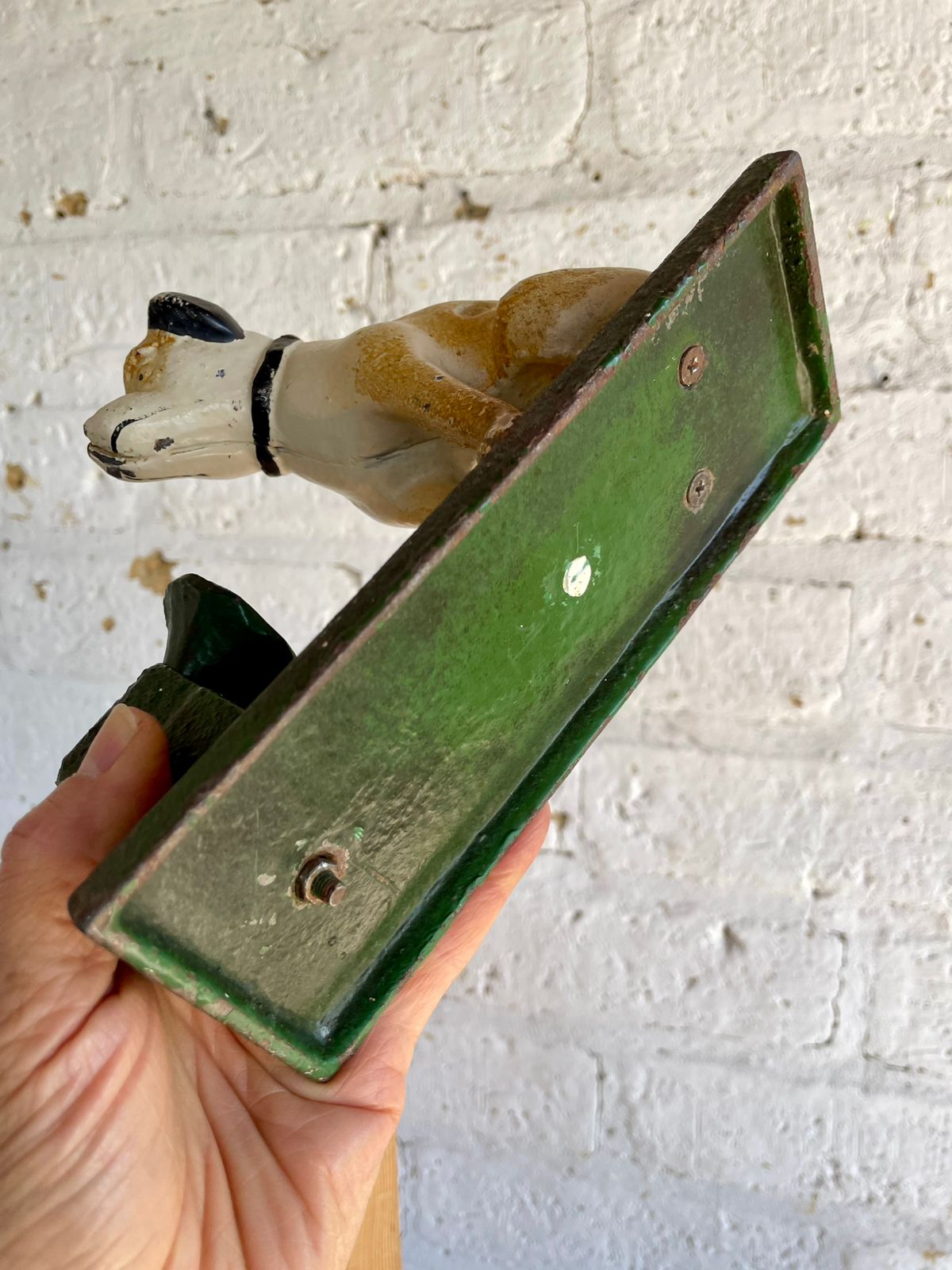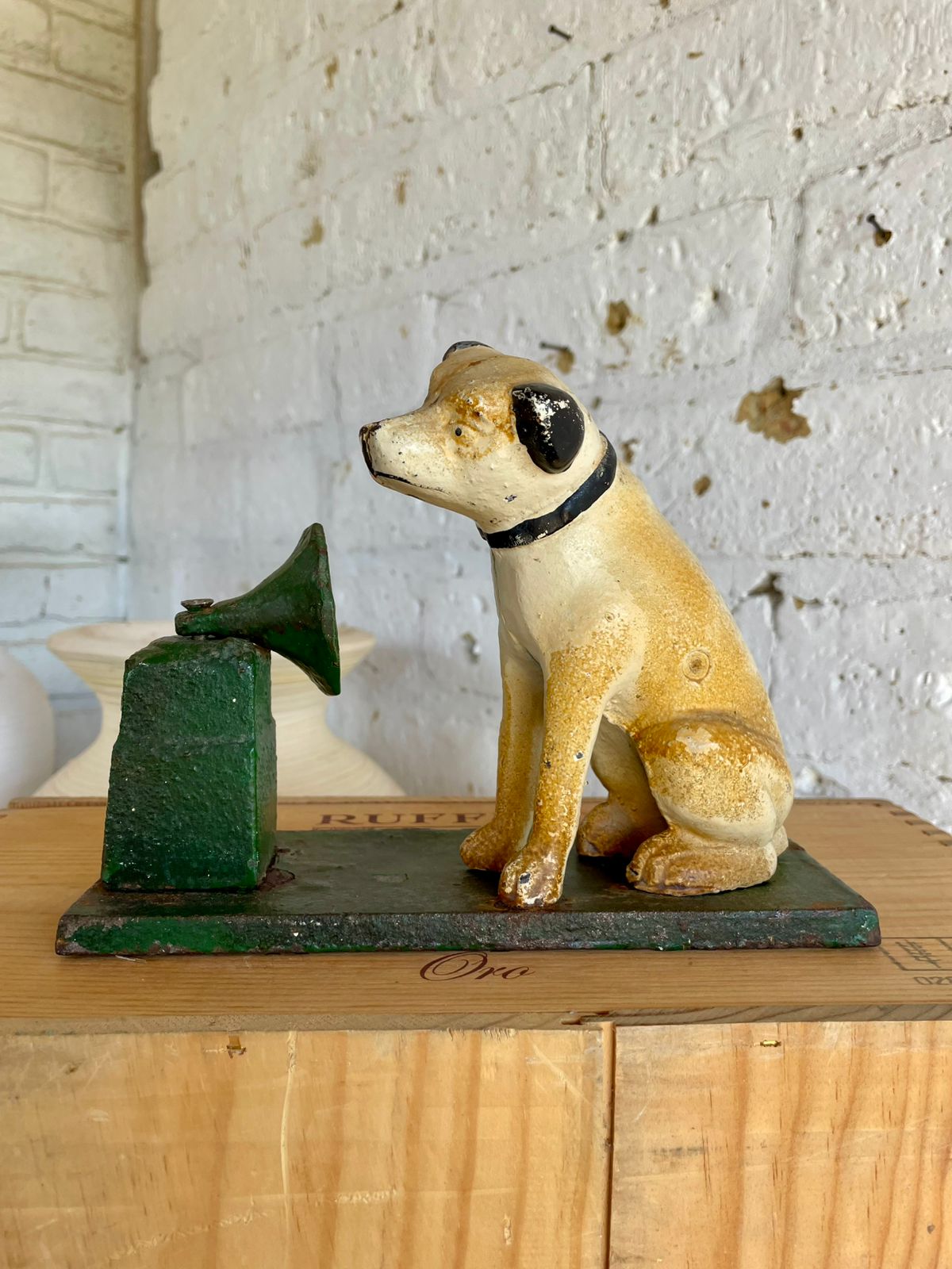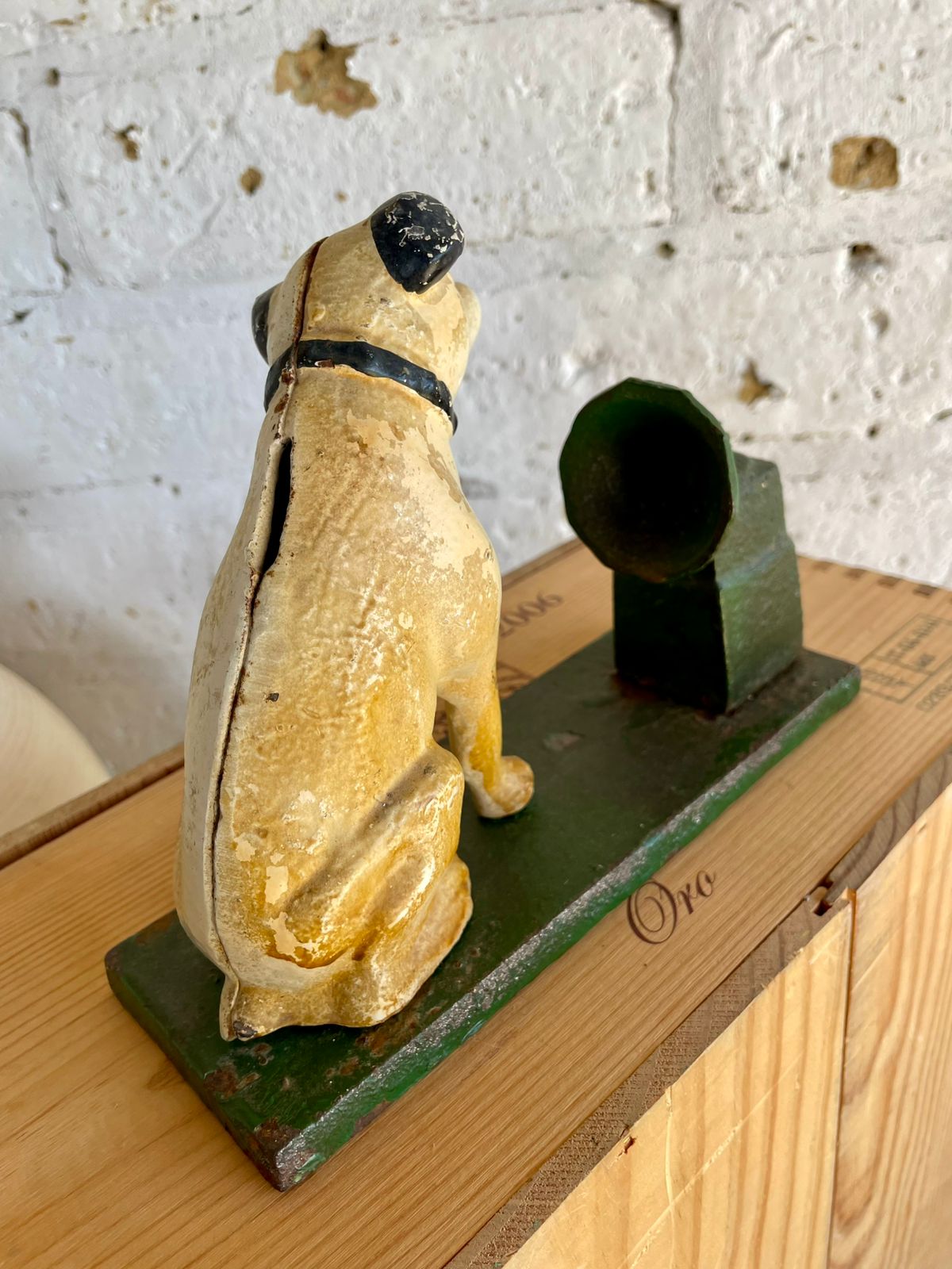 Figura del perro Nipper en hierro fundido de los años 80, se encuentra en buen estado con desgastes en la pintura.