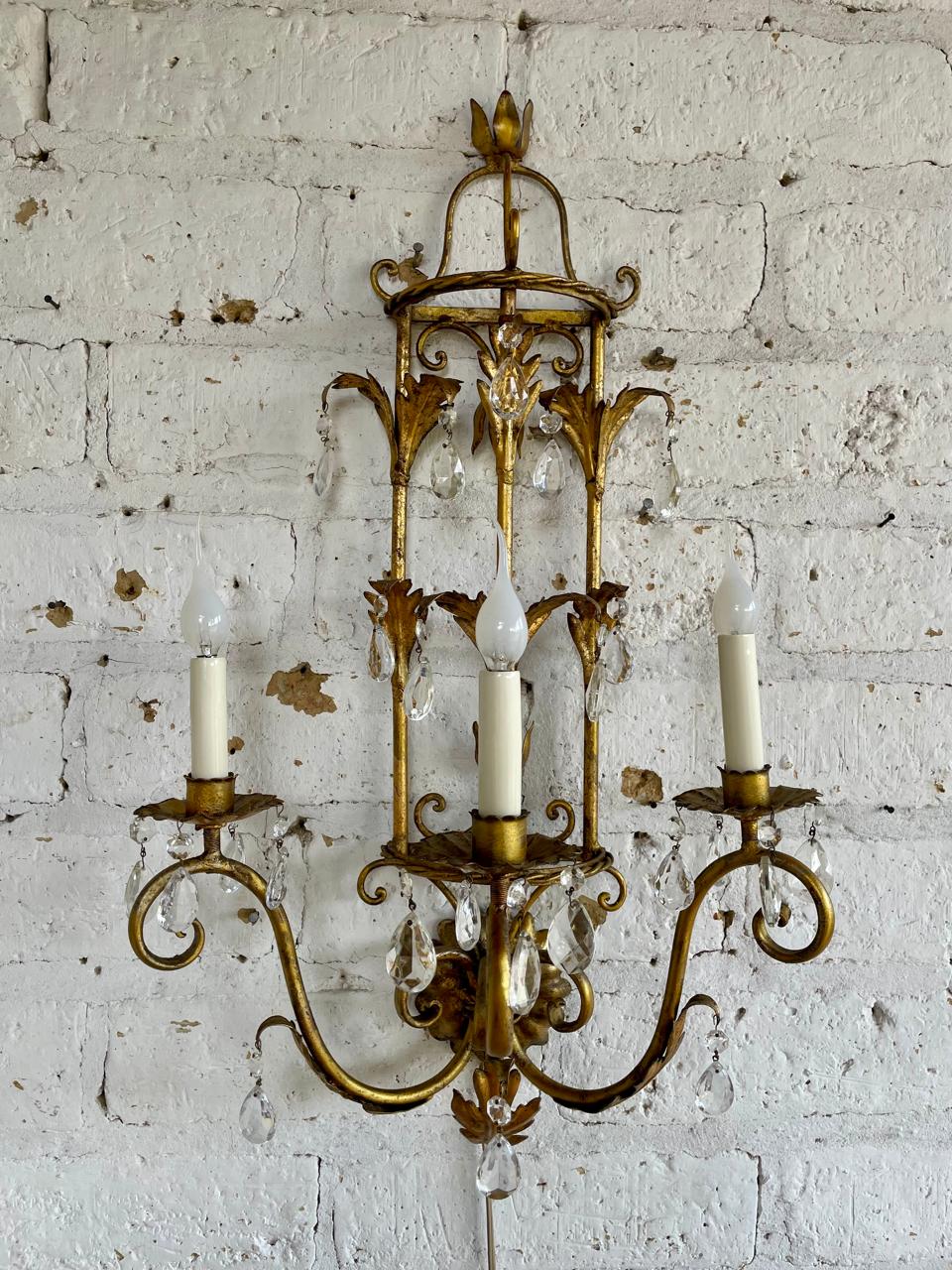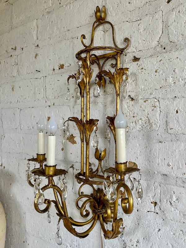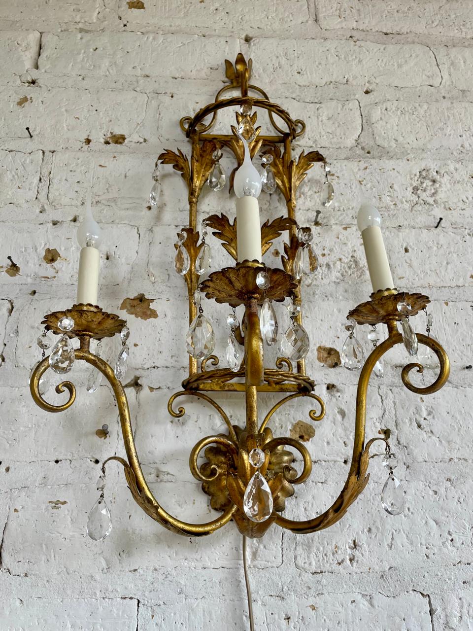 Lámpara florentina metálica de los años setenta, aplique de pared vintage de 3 brazos con porta lámpara tipo candelabro y prismas de cristal. Decorada con hojas de acanto en lámina metálica gruesa cubiertas con pintura dorada desgastada. Se encuentra en buen estado, el sistema eléctrico funciona perfectamente.