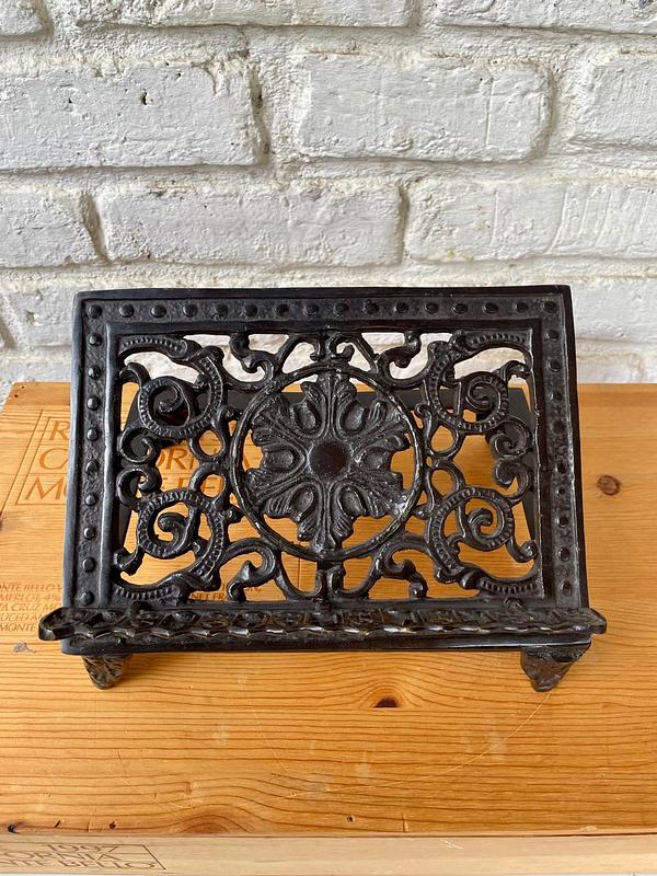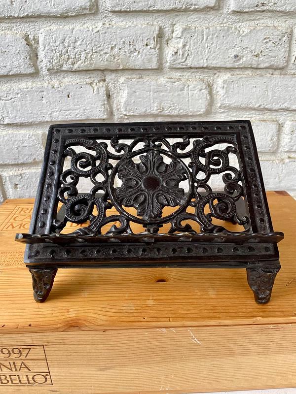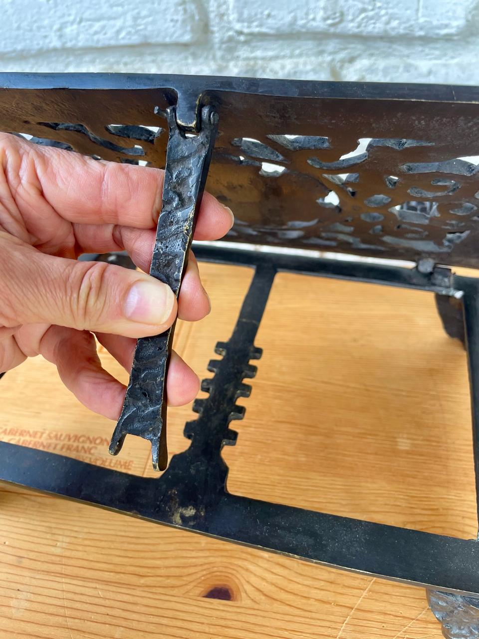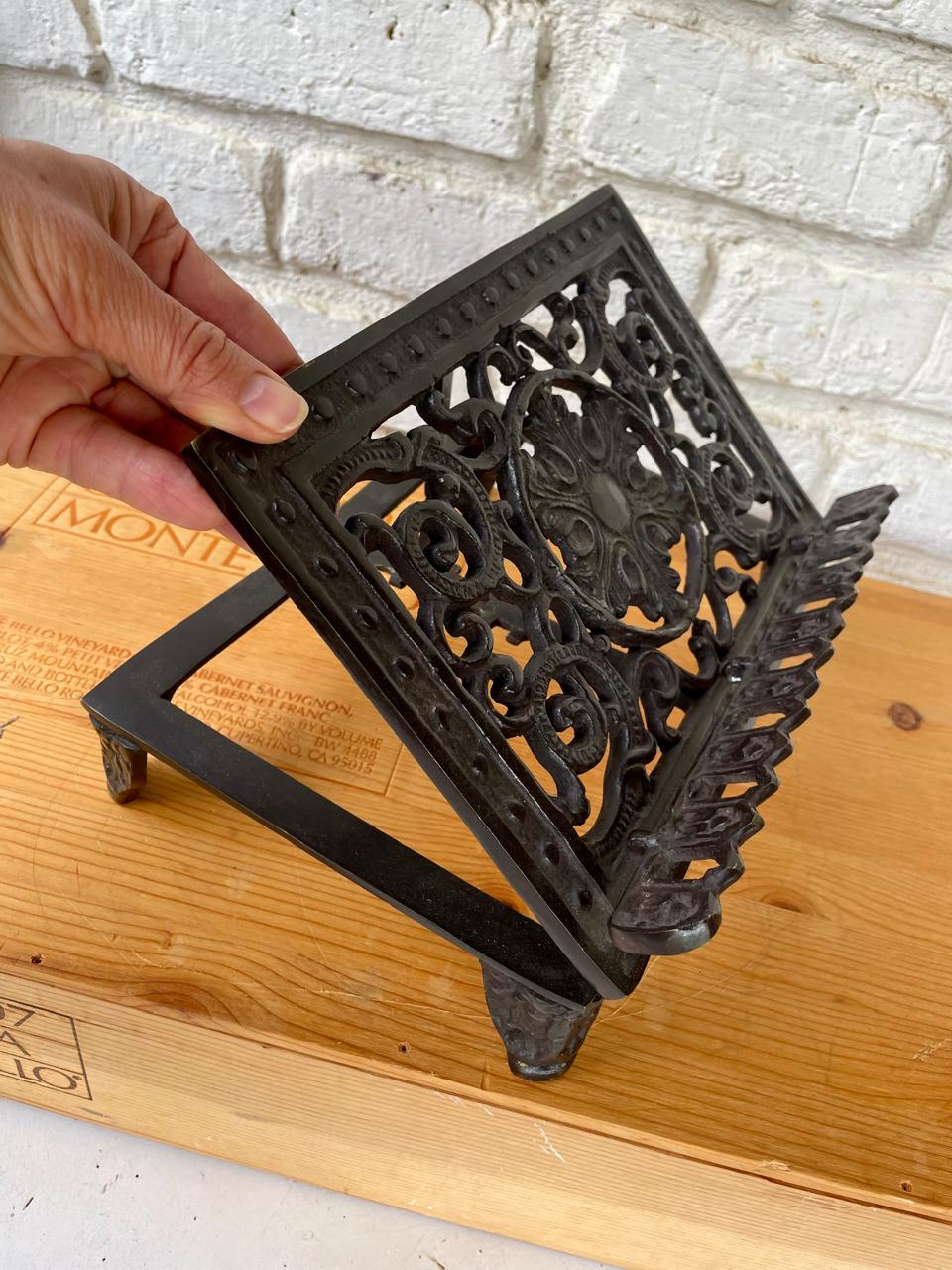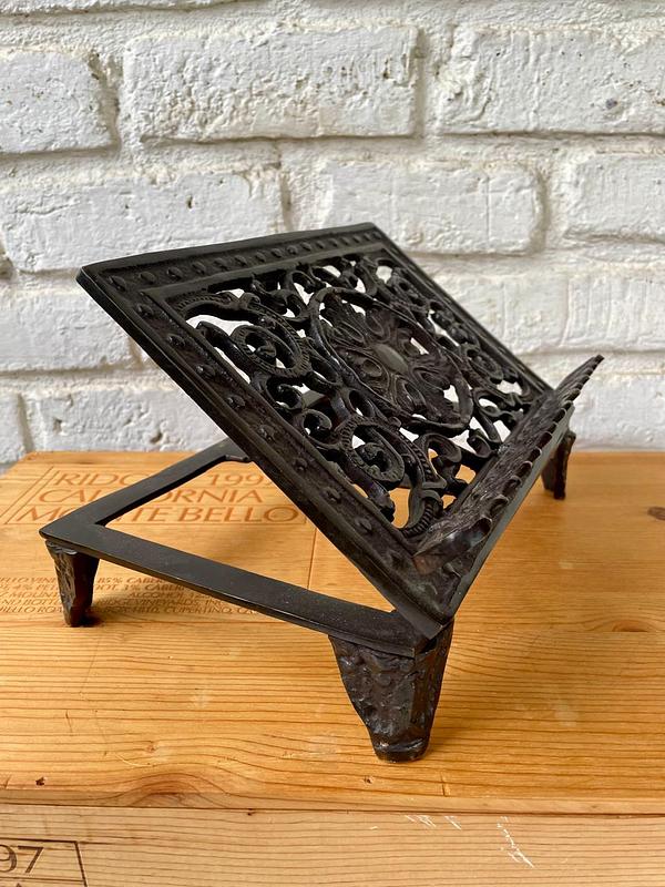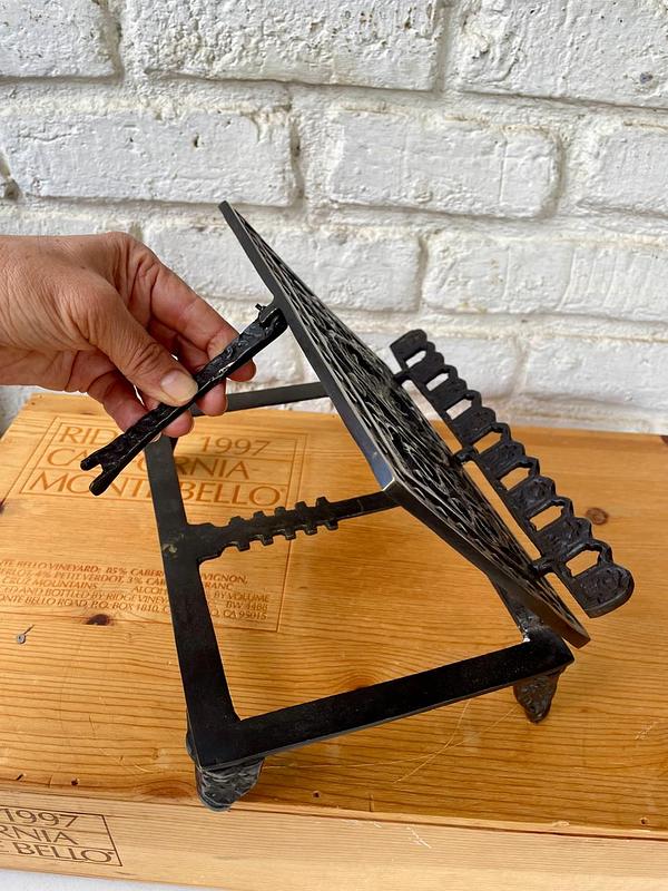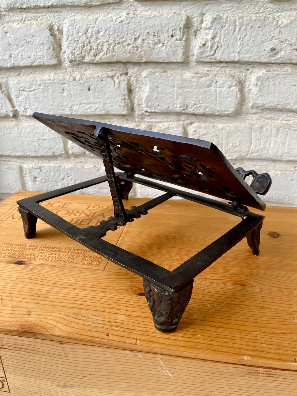 Atril plegable de sobremesa para libros en bronce fundido, la base tiene un soporte que permite graduar el ángulo de inclinación de la bandeja que soporta el libro. Se puede utilizar para sostener libros, partituras o recetas, proporcionando una superficie de lectura cómoda y estable.