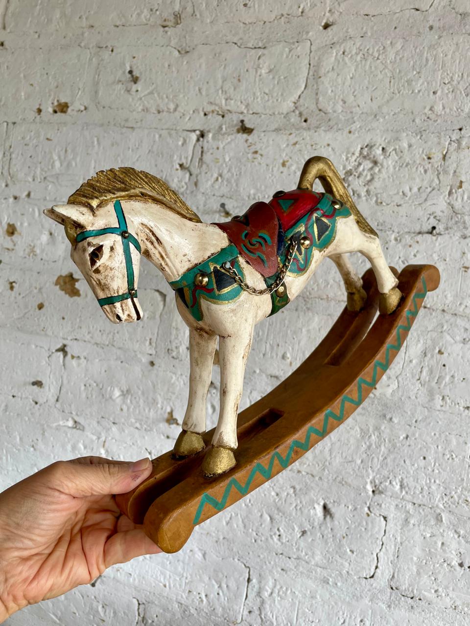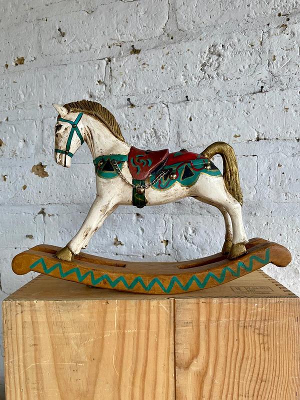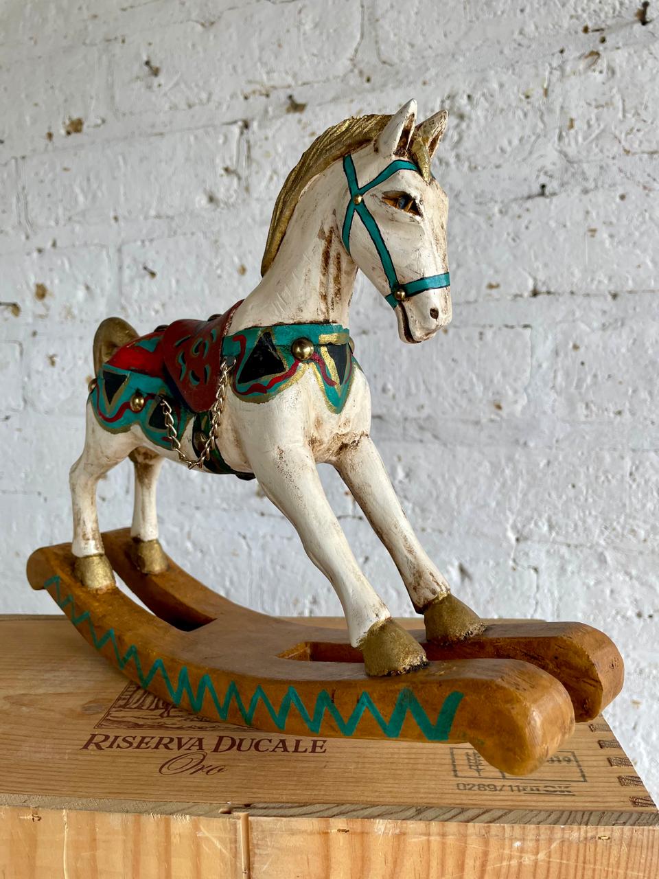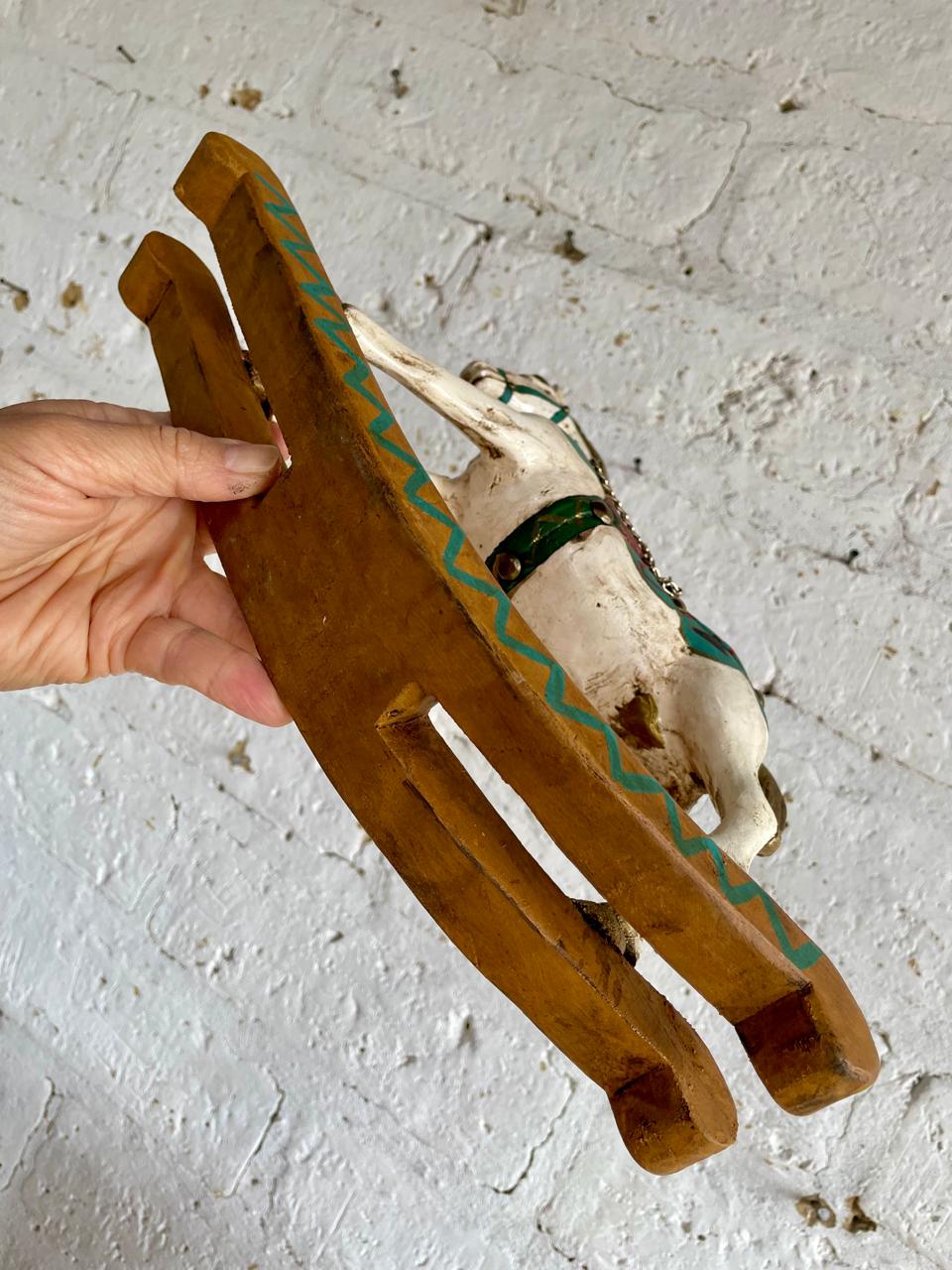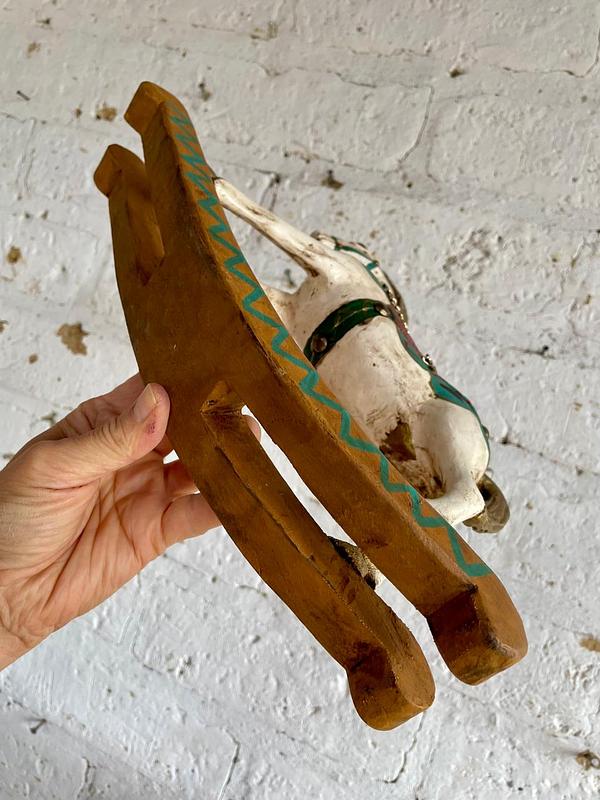 Caballo artesanal tallado en madera decorado con taches y cadenas metálicas. Se encuentra en buen estado.
