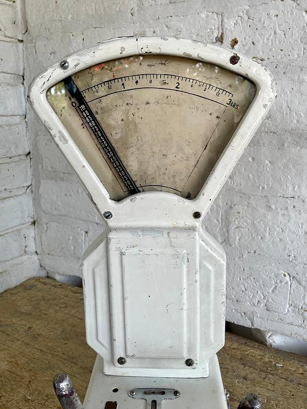 Antigua báscula de tienda de fabricación Estadounidense de la primera mitad del S XX. con capacidad para pesar hasta 3 libras. Tiene un tablero por cada cara con manecillas que marcan el peso. La base es en hierro fundido, el platón de lámina metálica gruesa y la superficie es esmaltada presenta algunas raspaduras. La impresión de las escalas del peso en los tableros metálicos se encuentra borrosa. El sistema de manecillas funcinonan marcando el peso del objeto que se deposite en el platón.