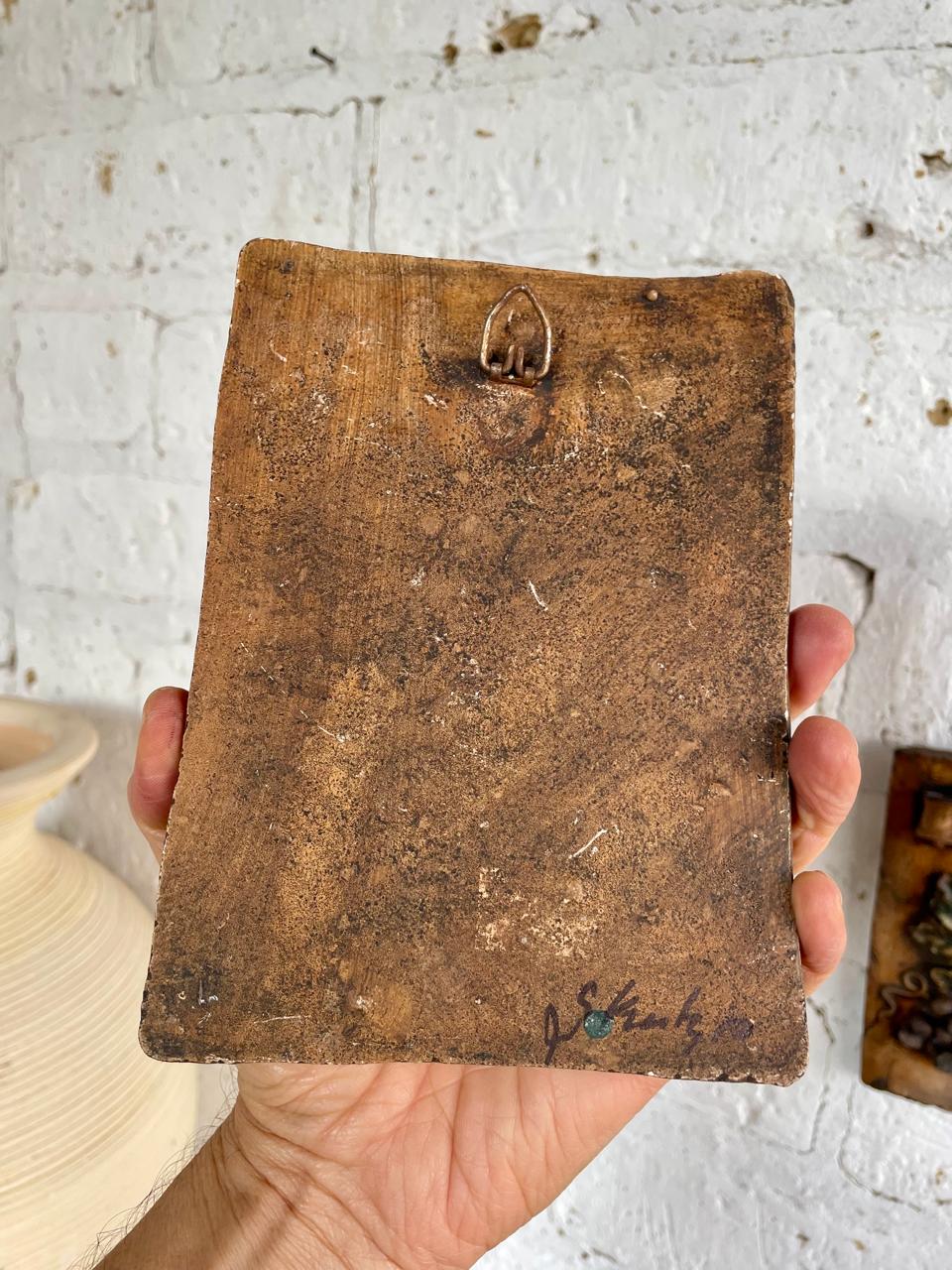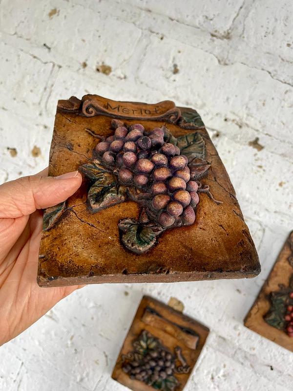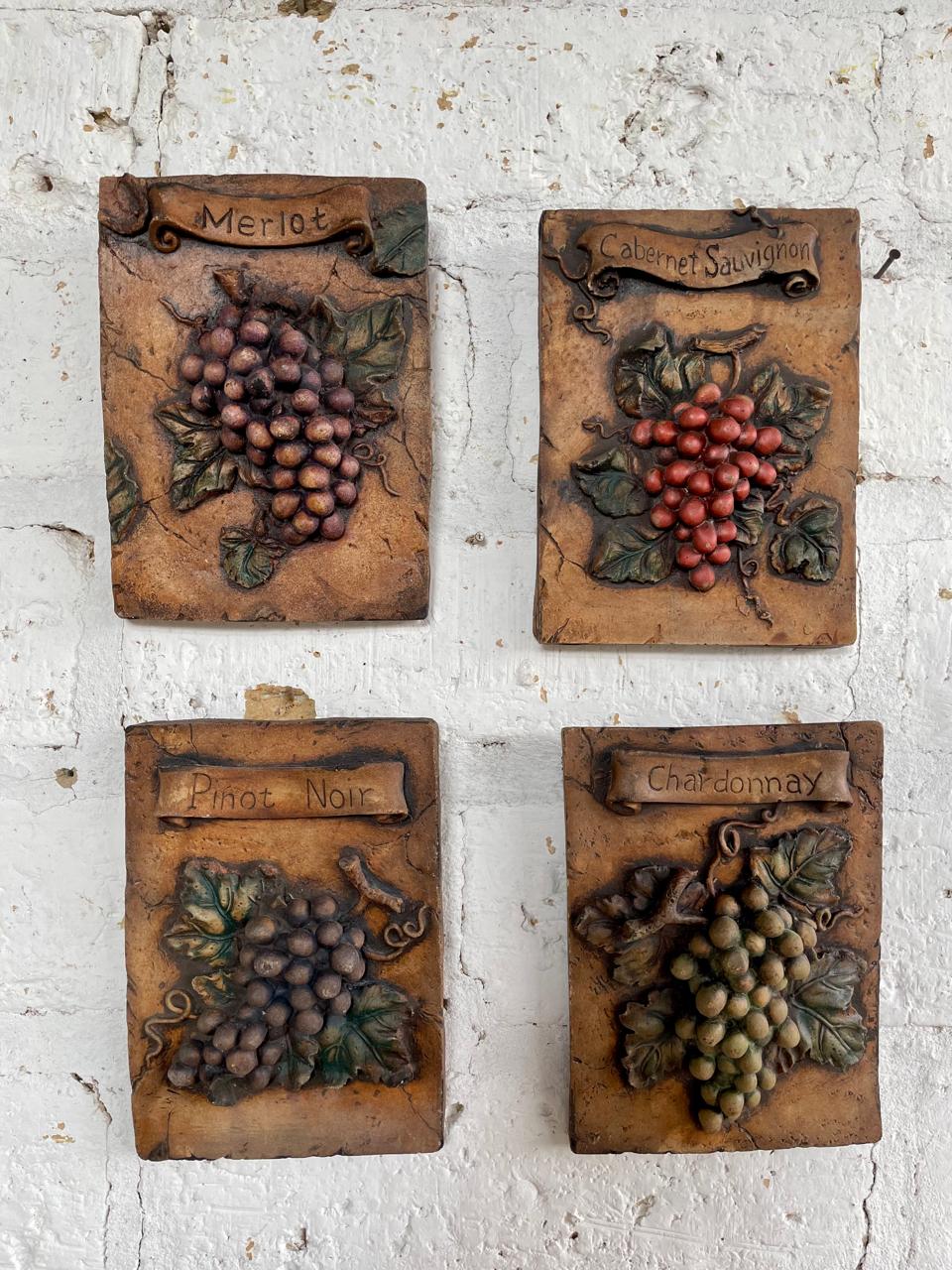Cuatro cuadros con motivos de uvas en alto relieve elaborados en resina con apariencia de cerámica rústica envejecida. Presentan pequeños desgastes en la pintura.