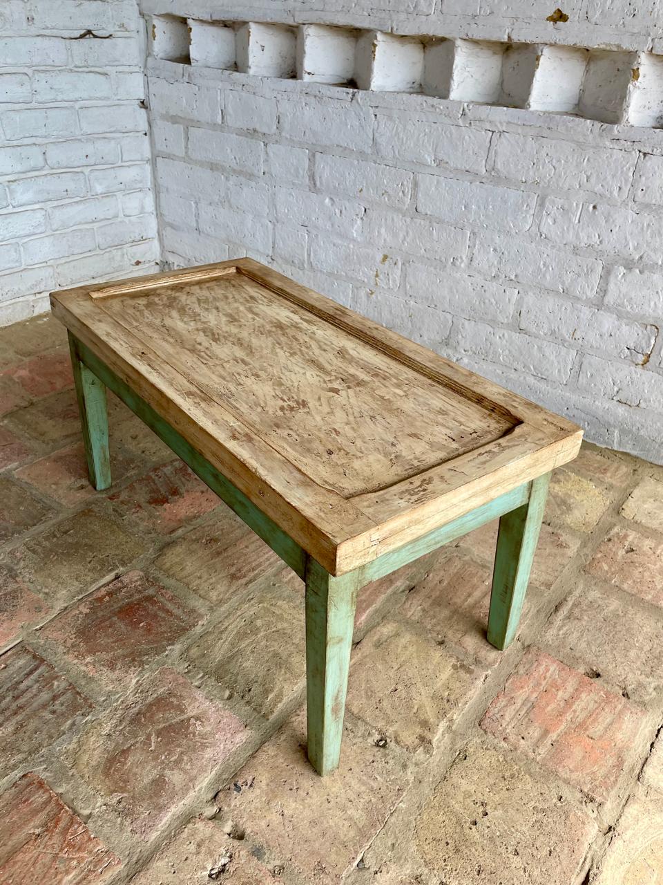 Una ventana en madera maciza de una casa antigua se utilizó para asiento de esta banca, las patas tambén se fabricaron con madera antigua recuperada. Se puede utilizar como banca o como mesa.
