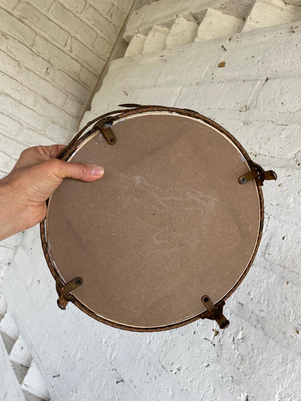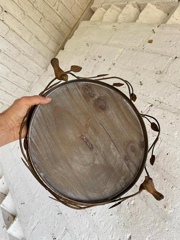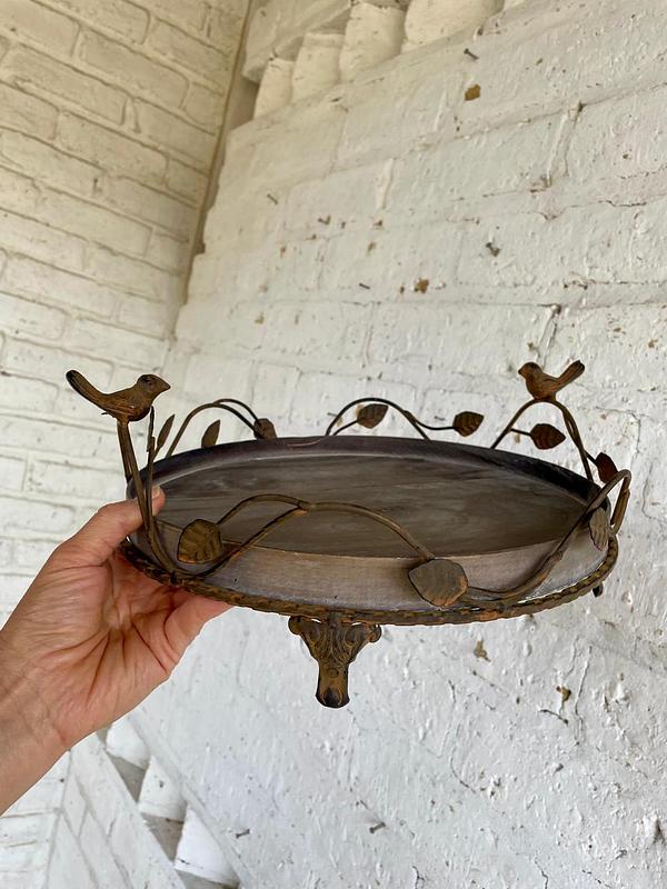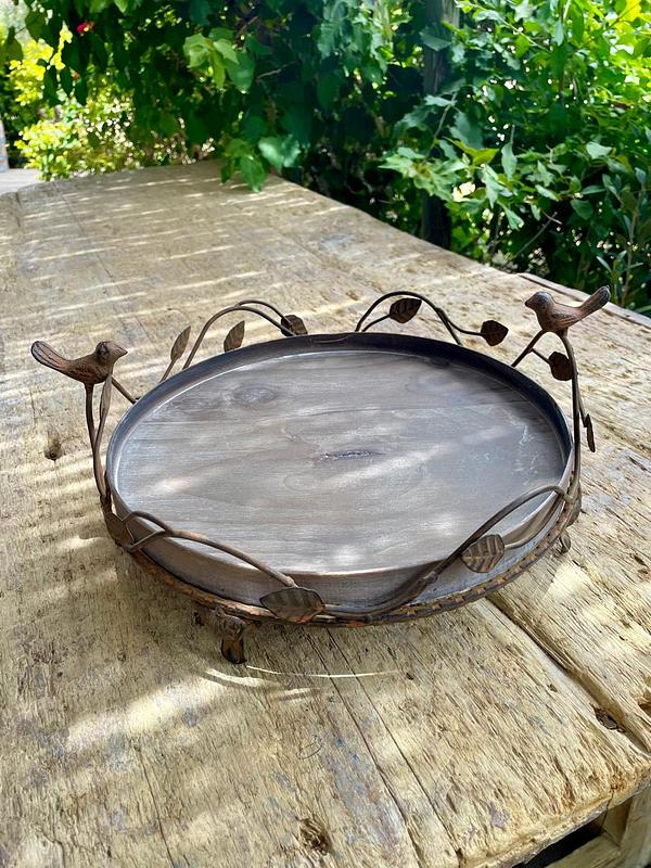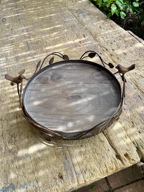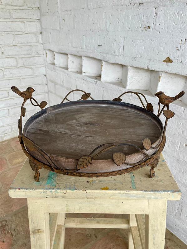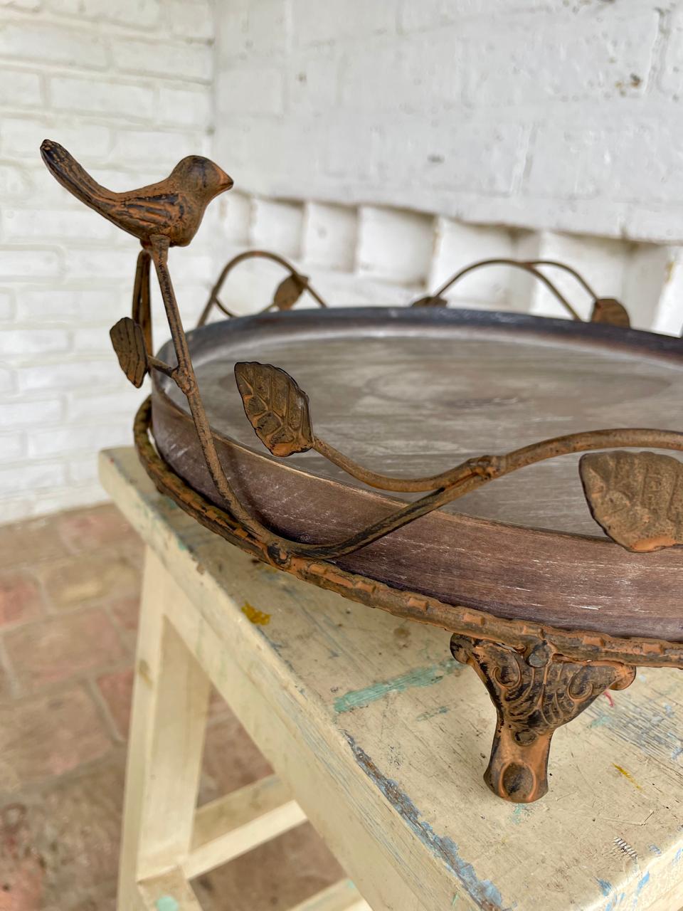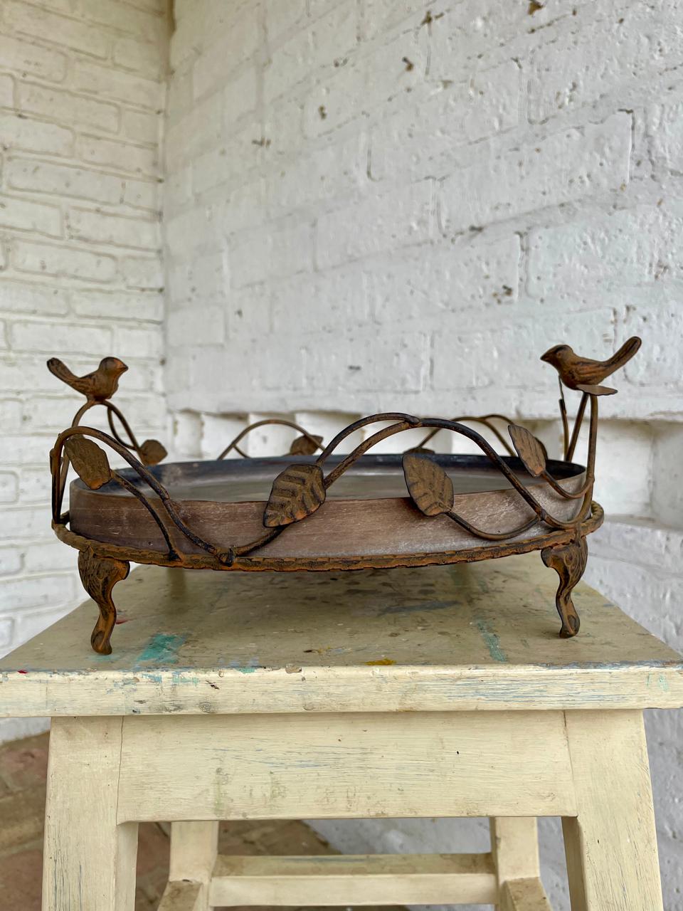 Bandeja de borde y patas metálicas con dos pajaritos decorada en óxido dando apariencia envejecida, la superficie es en madera.