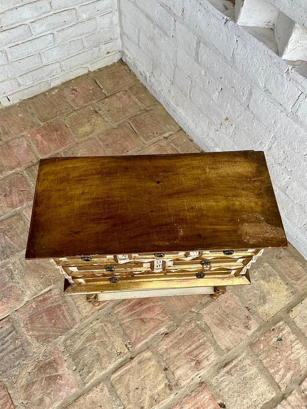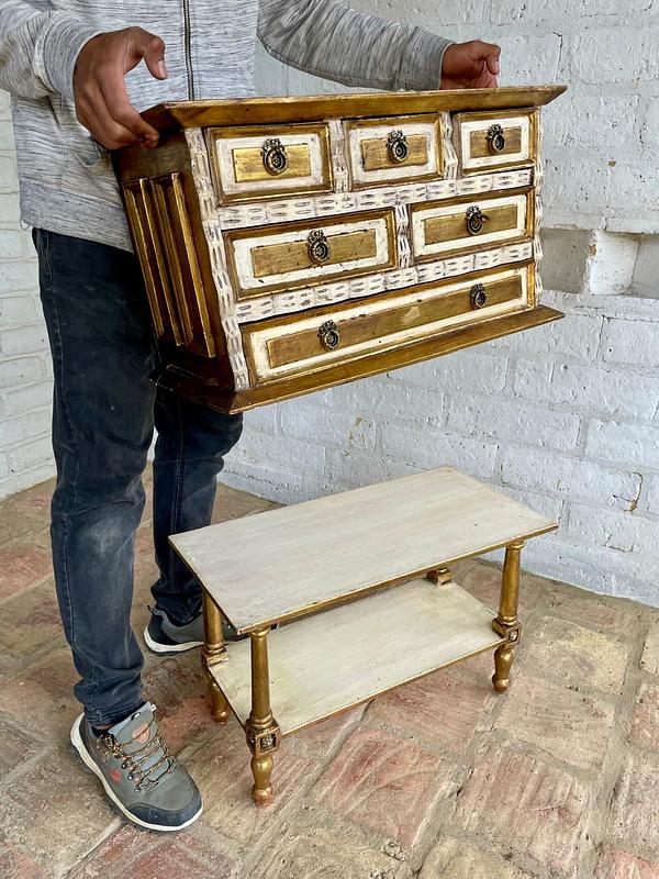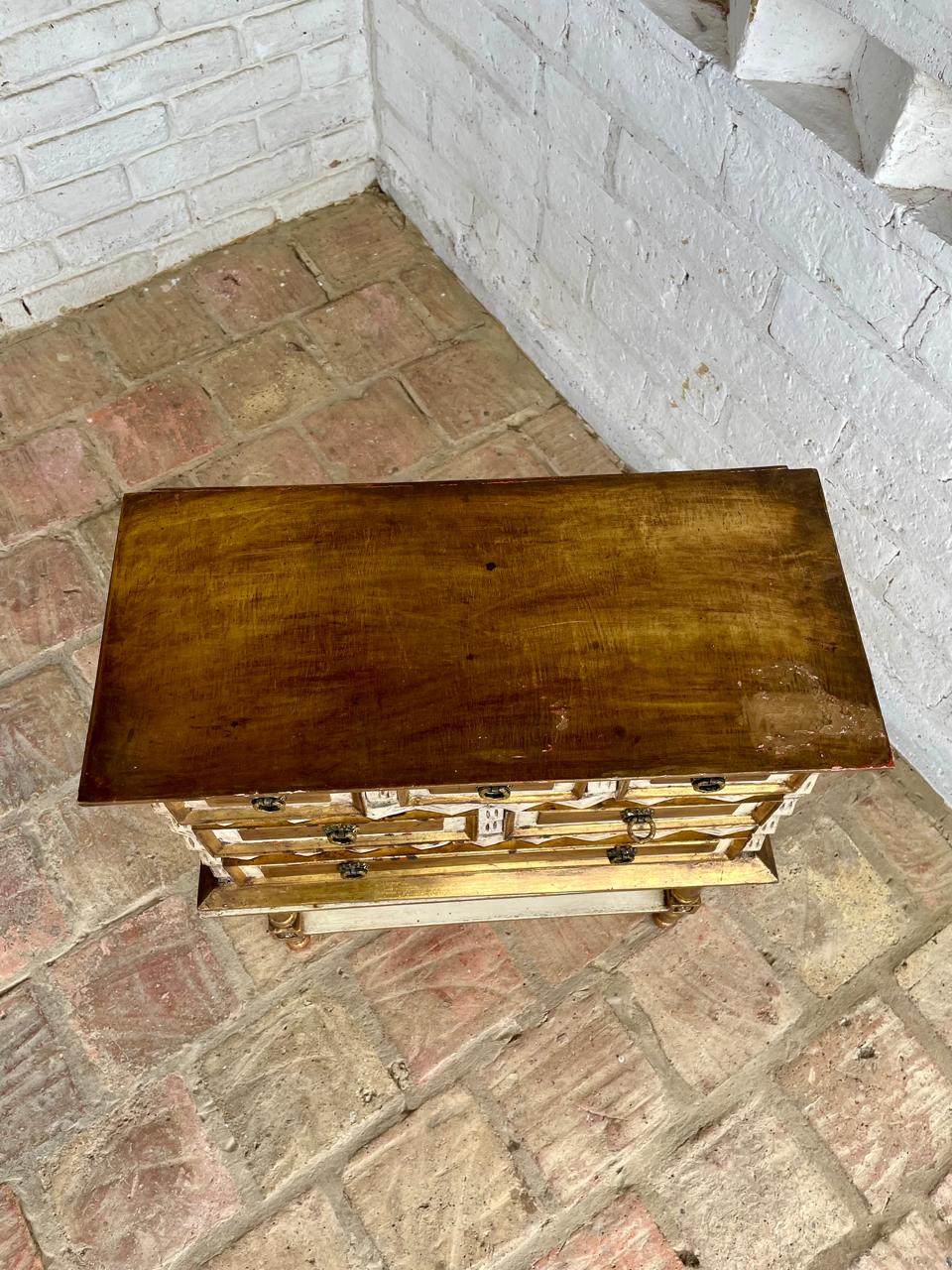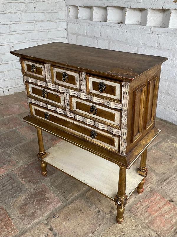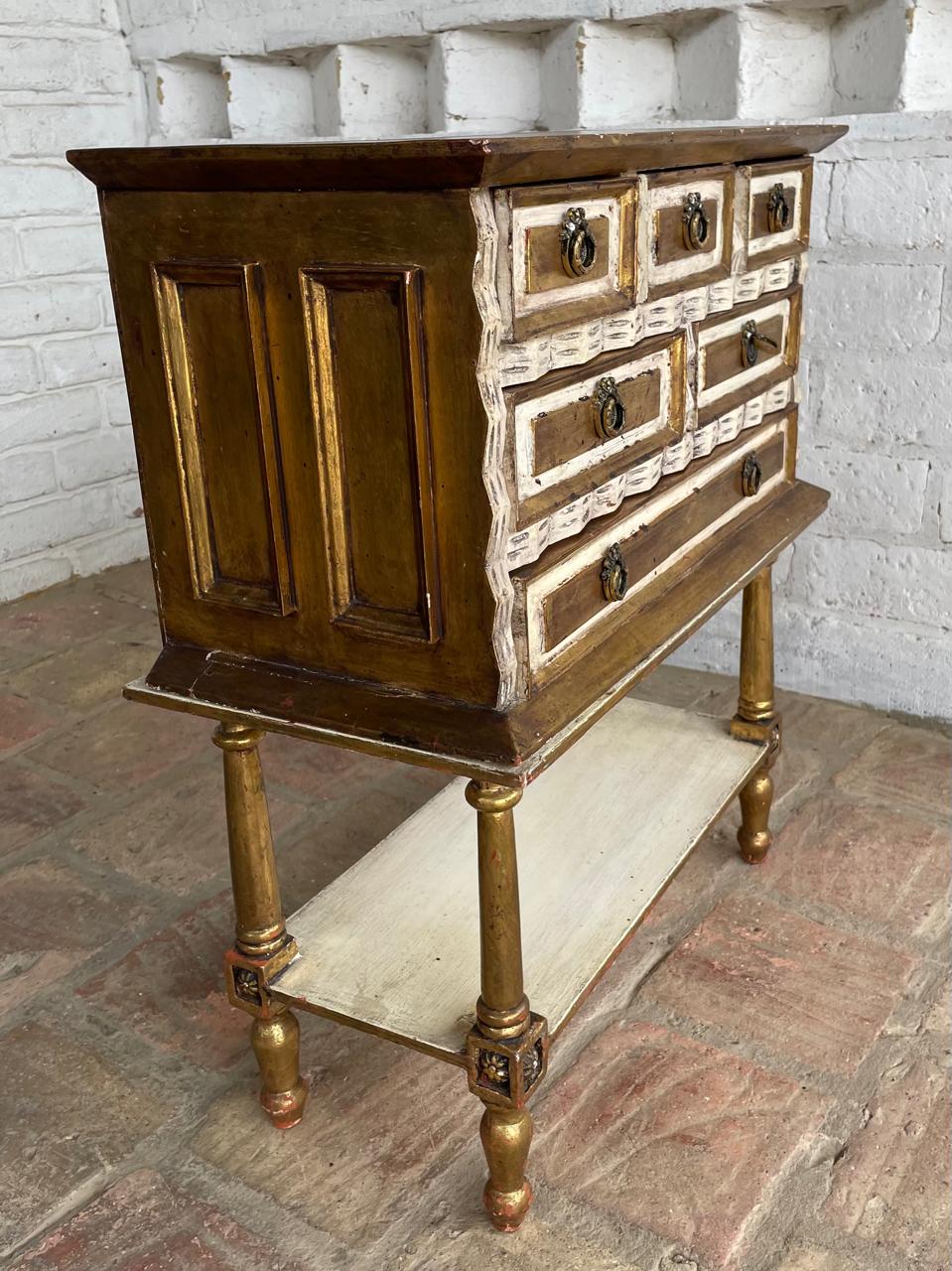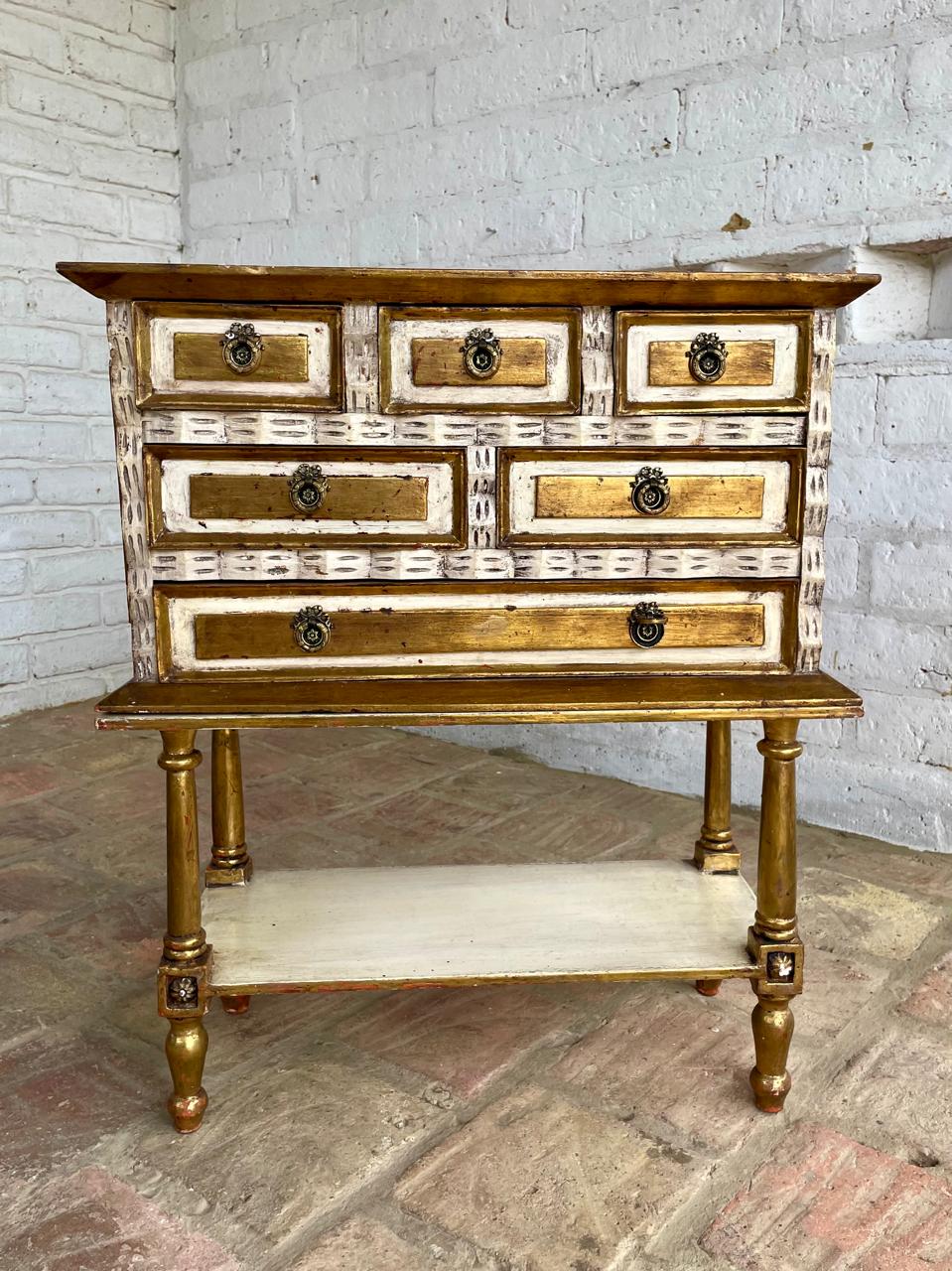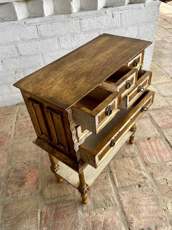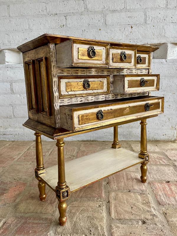 Cajonero de madera elaborado artesanalmete en Italia, la madera tallada está decorada en dorado y blanco, los cajones tienen jaladores de bronce. El cajonero se puede separar de la mesa base. La madera se encuentra en buen estado, el color dorado presenta algunas rayaduras y desgastes.