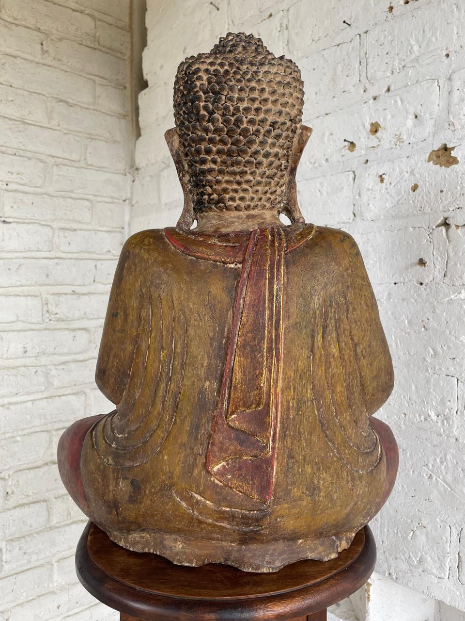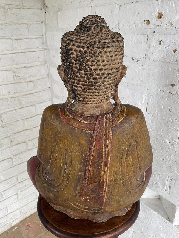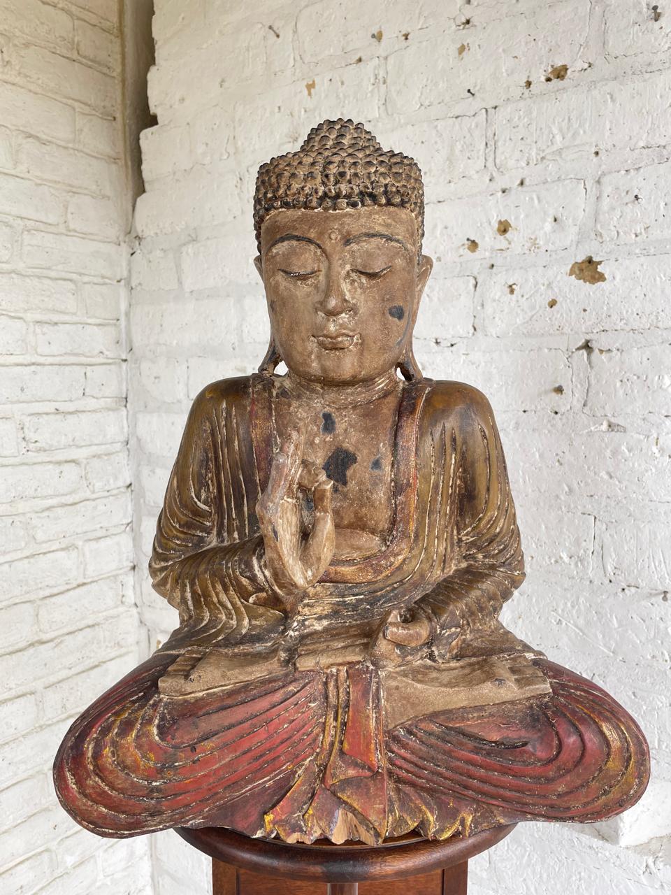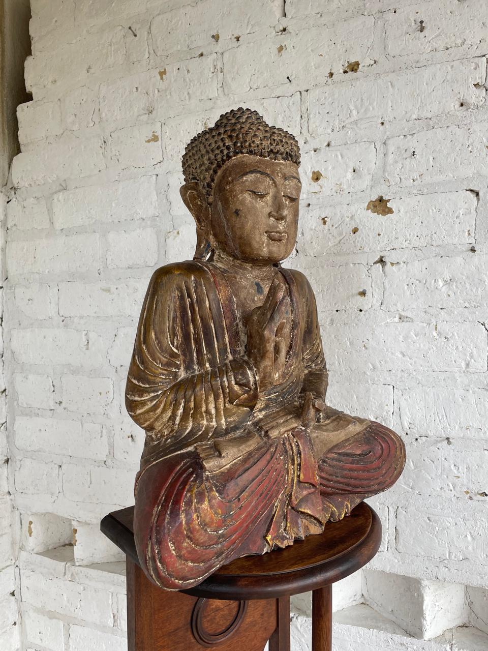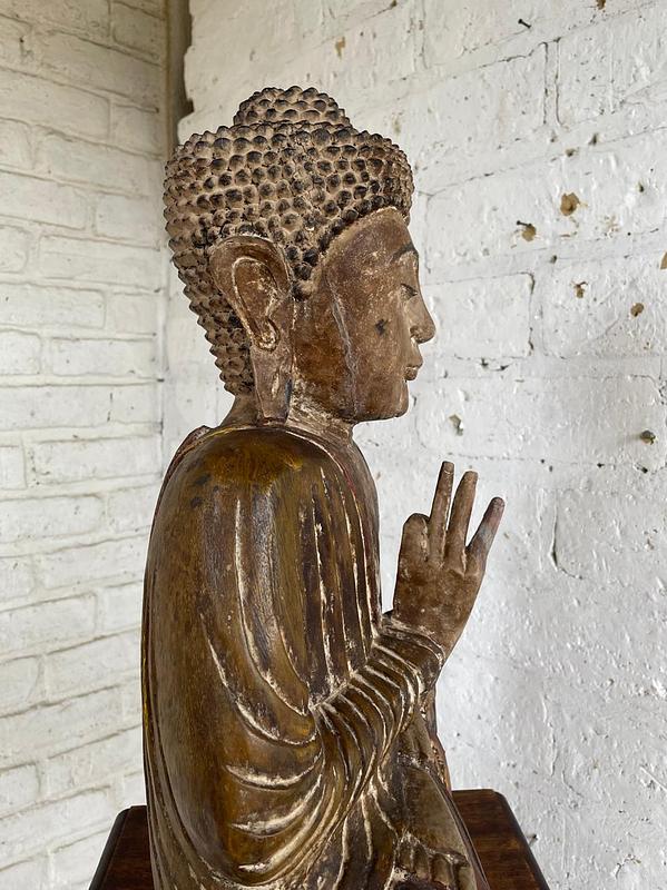 Serena y evocadora escultura de Buda sedente tallada a mano de origen asiático de finales del S XIX e inicios del S XX, esta estatua captura la gracia intemporal y la profundidad espiritual de la iconografía budista. Se representa a Buda en Abhaya mudra el gesto de la meditación que significa protección, paz y seguridad. La superficie conserva restos de su laca original y rastros de pigmentos rojo y amarillo, junto con un sutil dorado que ha envejecido con gracia a lo largo de los años. Una pátina desgastada por el uso y el paso del tiempo, incluida una expresiva grieta facial, realzando la presencia espiritual e histórica de la escultura. Tine todo el deterioro conservando la esencia original: trasmitir calma y serenidad a lo largo del tiempo.