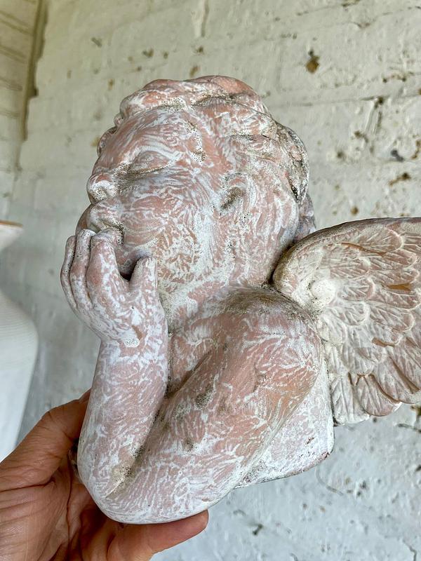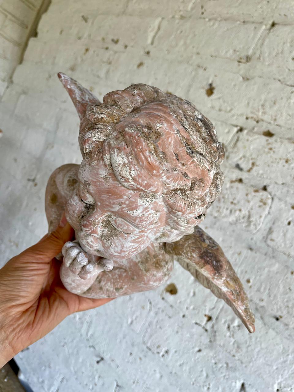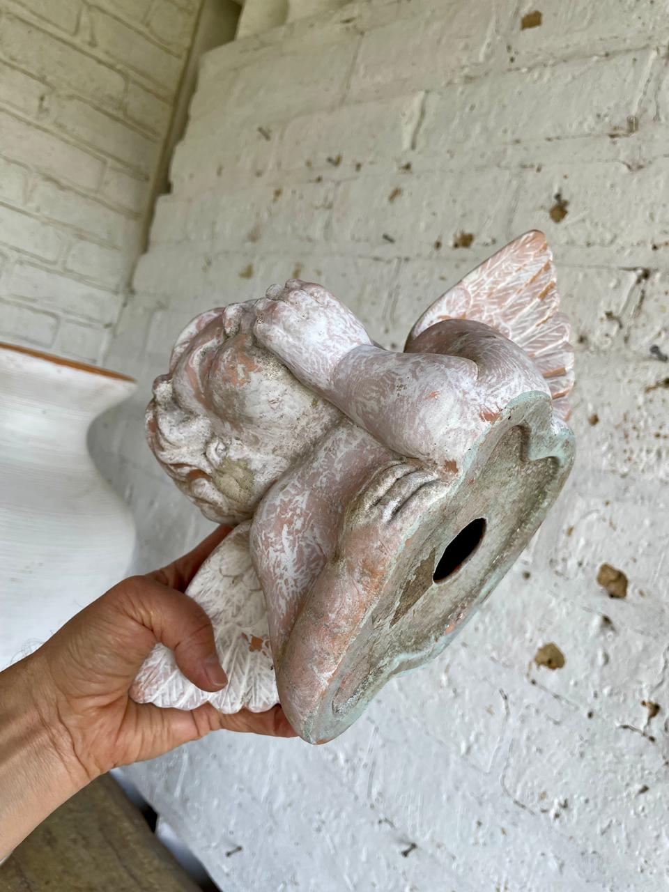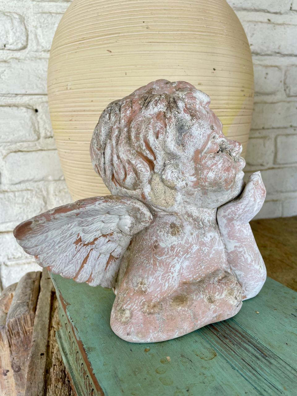 Figura réplica en terracota de uno de los querubines que aparecen en la parte inferior del cuadro "La Madonna Sixtina" del artista renacentista Rafael. Decorado con pintura desgastada con apariencia envejecida. Se encuentra en buen estado.