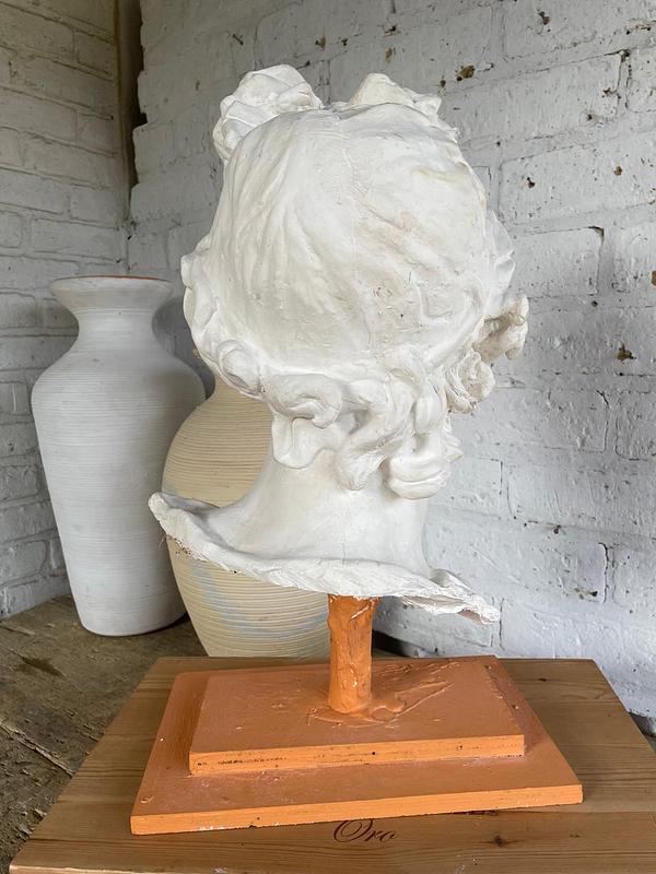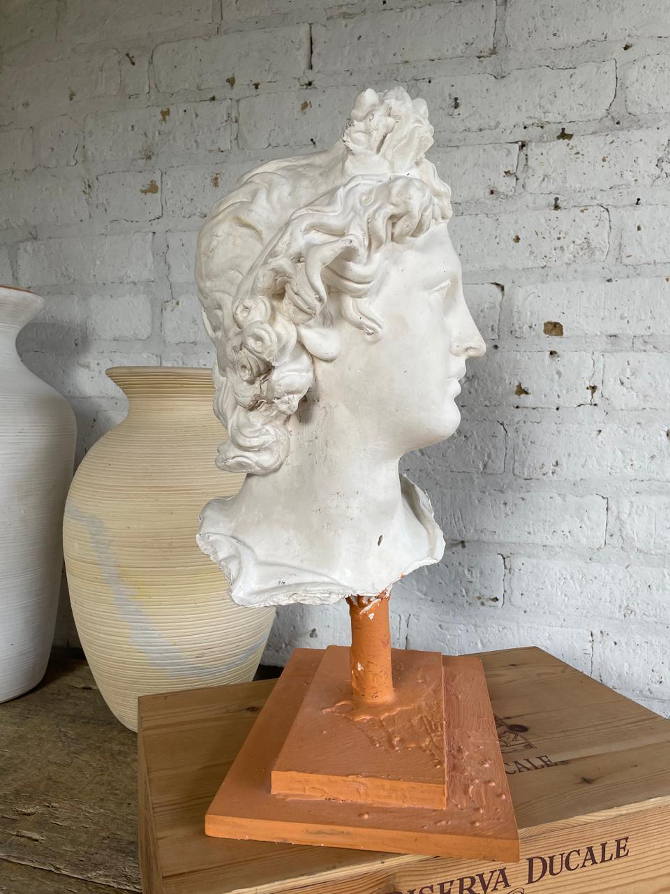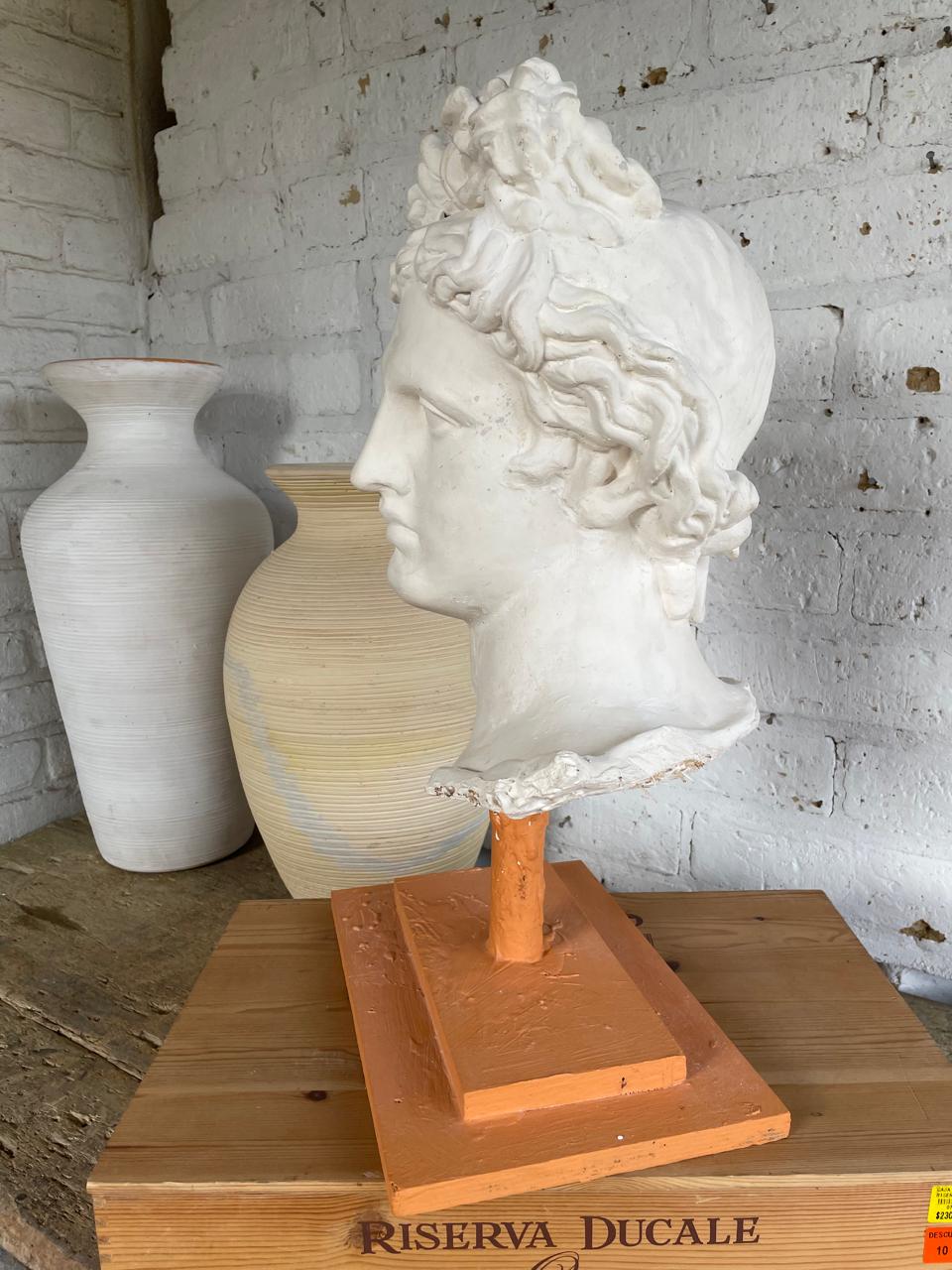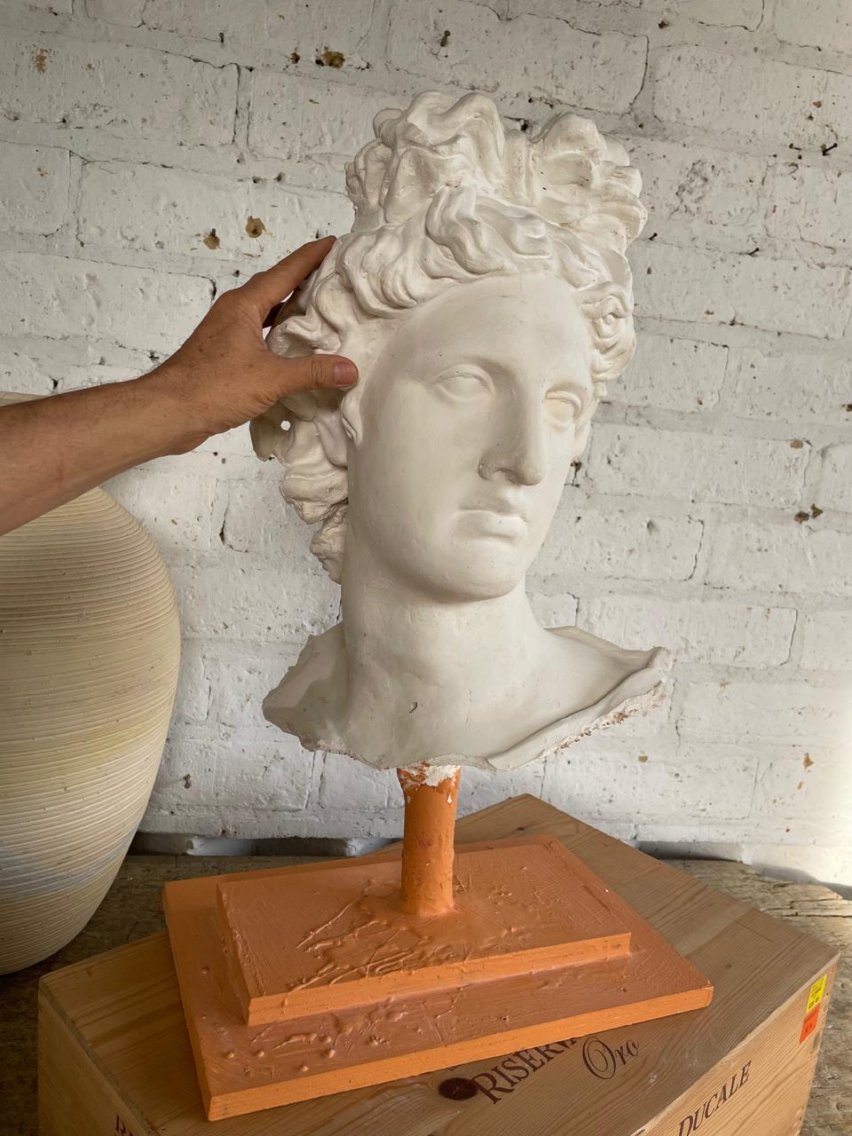 Réplica en yeso de la cabeza del Dios griego Apolo, el original de mármol se encuentra en el Vaticano. Elaborada recientemente por artistas locales de manera artesanal. La base es de madera.