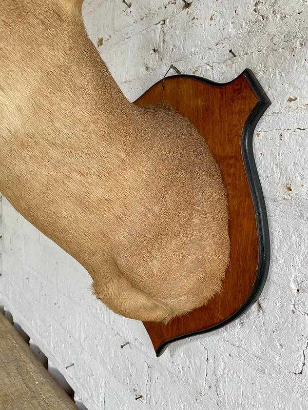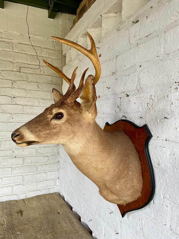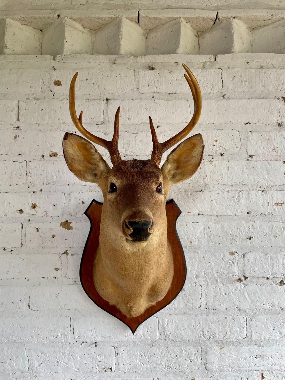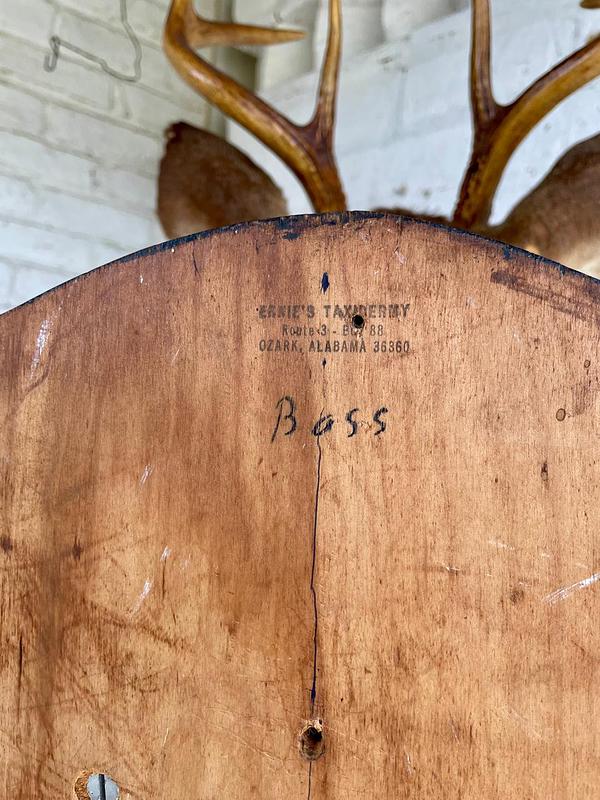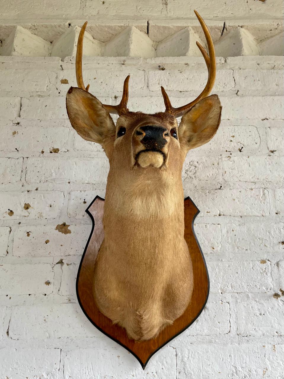 Taxidermia de gran tamaño de una cabeza de venado cola blanca elaborada en Ozark, Alabama USA por Ernie´s Taxidermy, montada sobre un escudo de madera a manera de base para colgar. El proceso de taxidermia se realiza por expertos de manera profesional en los Estados Unidos cumpliendo normas establecidas por las autoridades, inician curtiendo las pieles para luego ser montadas sobre un maniquí sintético a la medida, este procedimiento garantiza la conservación del animal por muchos años. Las astas naturales se conservan y los ojos son reemplazados por ojos de vidrio dándole viveza y naturalidad a la pieza buscando un aspecto natural y realista. De esta manera crean piezas de gran belleza que se exiben en museos de historia natural o como decoración en cabañas y casas rústicas campestres.