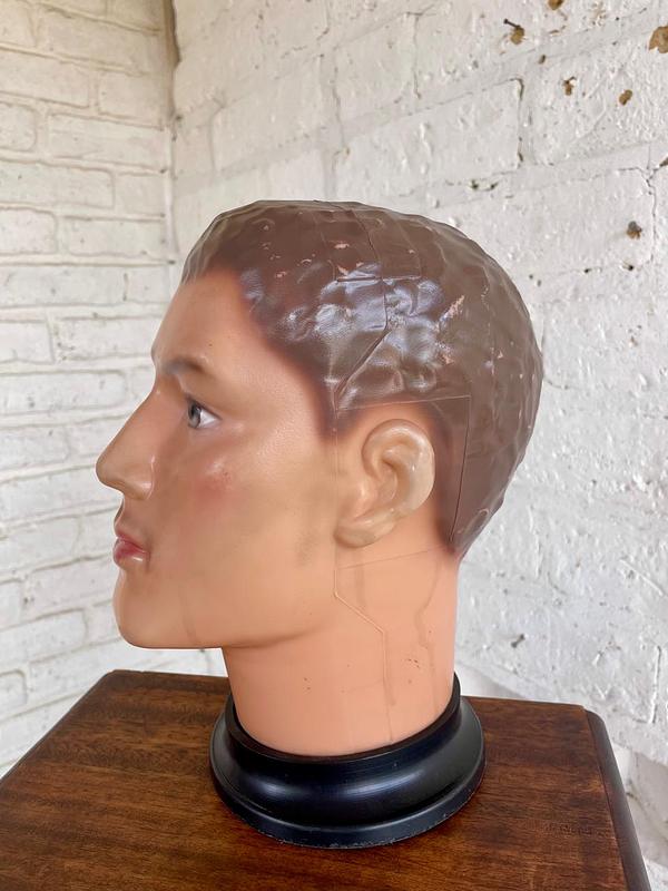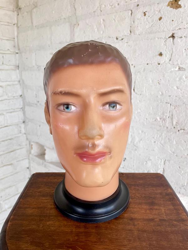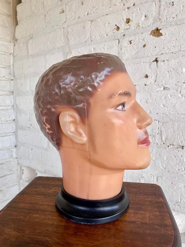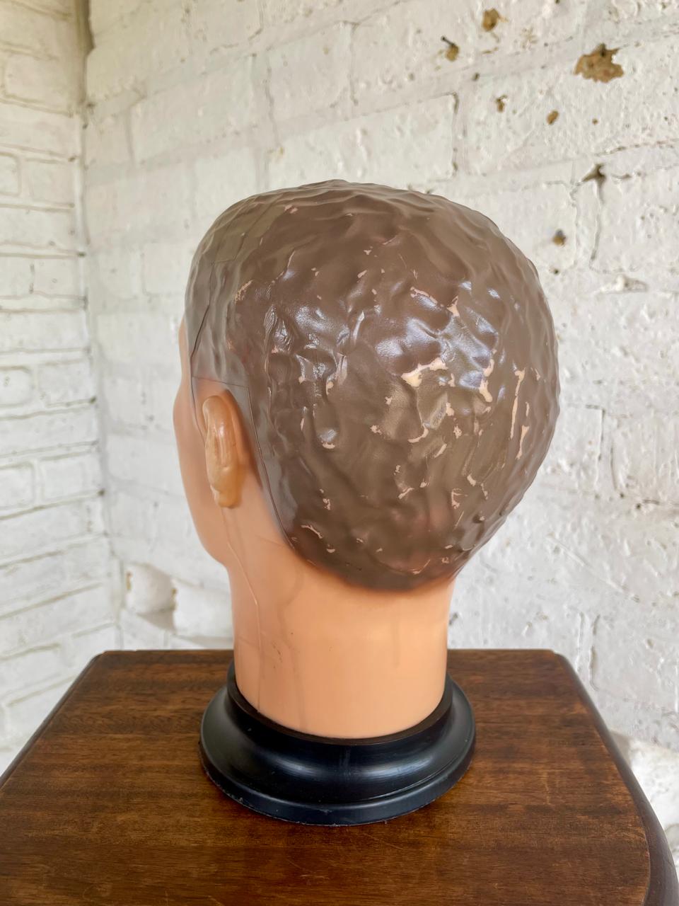 Cabeza de maniquí fabricada en los años ochenta elaborada en plástico. Se encuentra en buen estado.