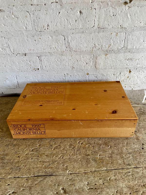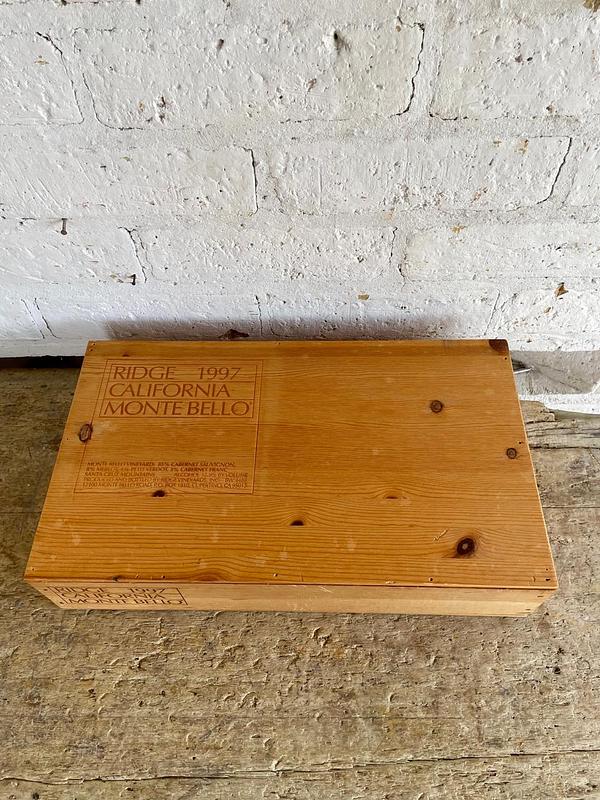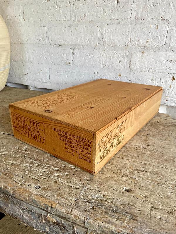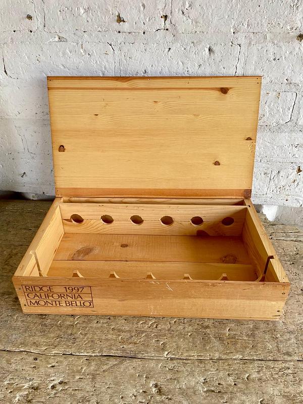 Caja vacía en madera de pino elaborada en California para 6 botellas de vino del viñedo Monte Bello. Tiene desgastes en la madera por el uso y el paso del tiempo.