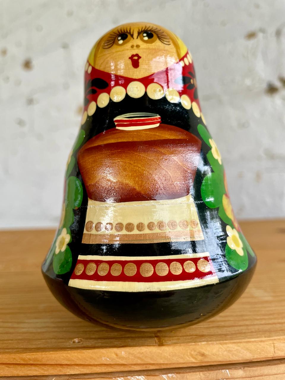Muñeca rusa Roly Poly elaborada en madera y decorada a mano al estilo de las matrioskas. Su base semiesférica y un peso interno la hacen regresar a su posición vertical después de ser empujada mientras suena una campanilla escondida en su interior. Se encuentra en buen estado.