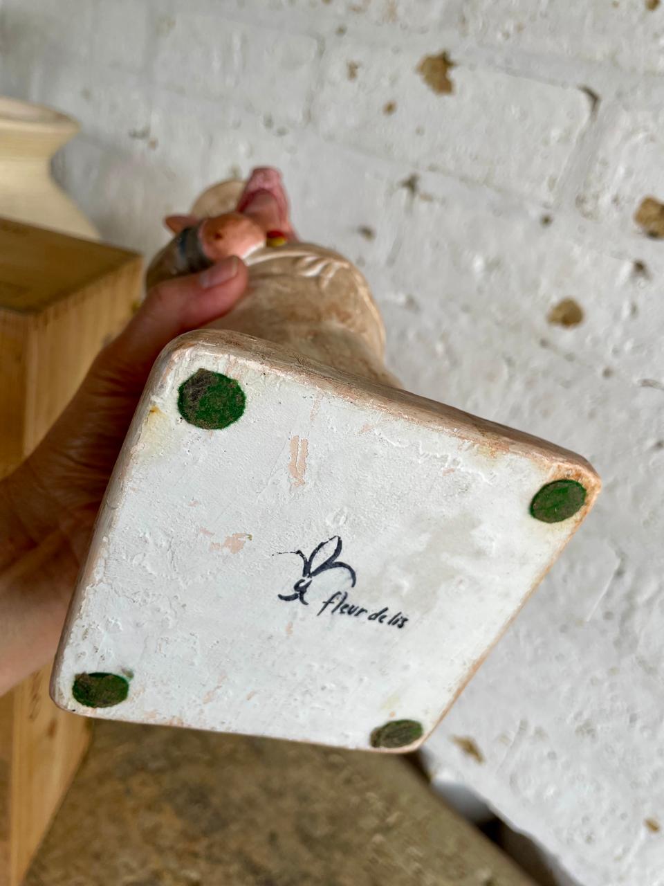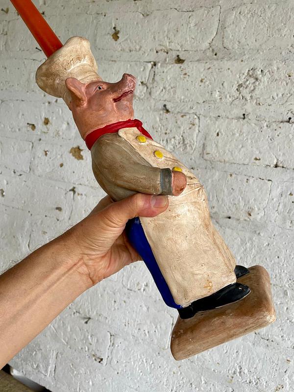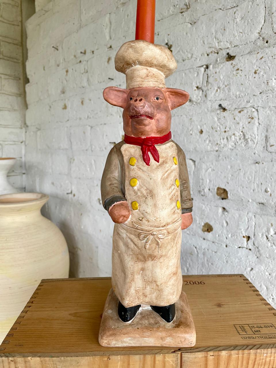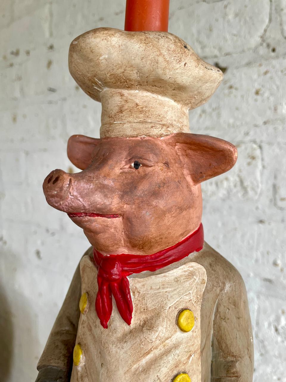 Figura francesa de cociero de mediados de los años noventa, representa a un cerdo chef con soporte en el gorro para una vela a manera de candelabro, capturando el espíritu lúdico de las tiendas de alimentación y cafeterías tradicionales francesas. La cerámica se ha modelado artesanalmente y se ha pintado a mano resaltando los rasgos humanos en la figura del cerdo . La superficie presenta un suave desgaste propio de la edad, que realza su auténtico carácter vintage sin restarle fuerza visual. Diseñada como pieza de exposición decorativa, esta figura escultórica constituye un llamativo punto focal en un escaparate, comedor, cocina o interior comercial. El cocinero está en excelentes condiciones acordes con la edad y el uso y sigue siendo robusto y visualmente impactante. La base tiene el sello "Fleur de Lis"