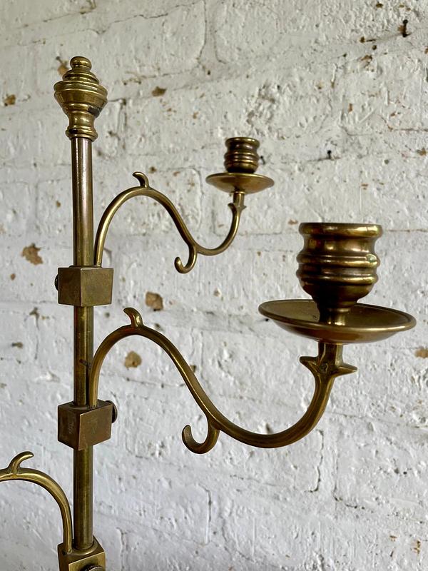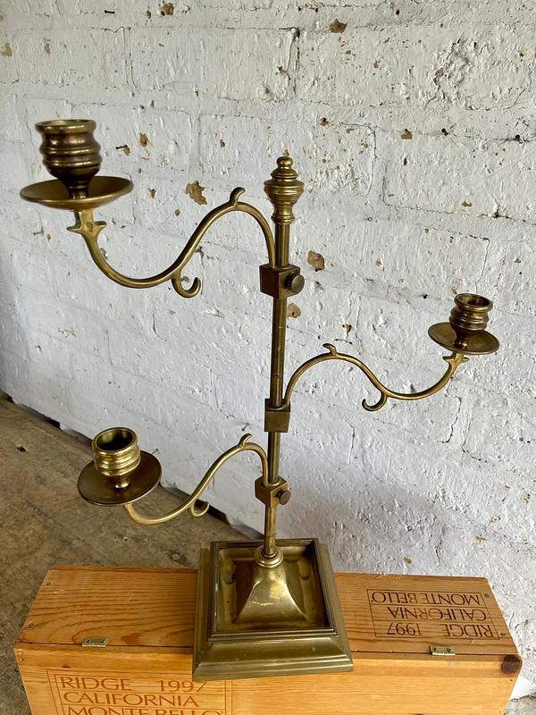 Candelabro de bronce fundido fabricado en India a mediados del S XX. Con tres brazos ajustables que se extienden desde una columna central, lo que permite girarlos alrededor de la columna y graduar su altura mediante tornillos. Cuenta con una base pesada y estable, decoradada con una moldura del mismo material. Puede usarse como pieza decorativa de escritorio o mesa. Se encuentra en buen estado. MEDIDAS: Alto 56 cm. Distancia entre 2 brazos 40 cm. Base 17 x 17 cm. Diámetro soporte de vela 3 cm.