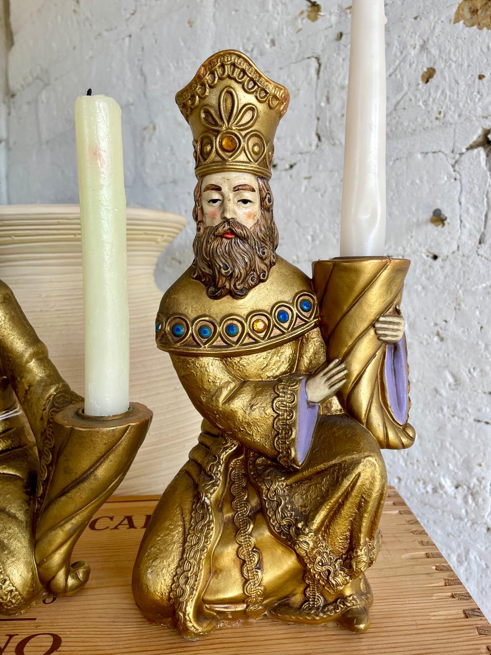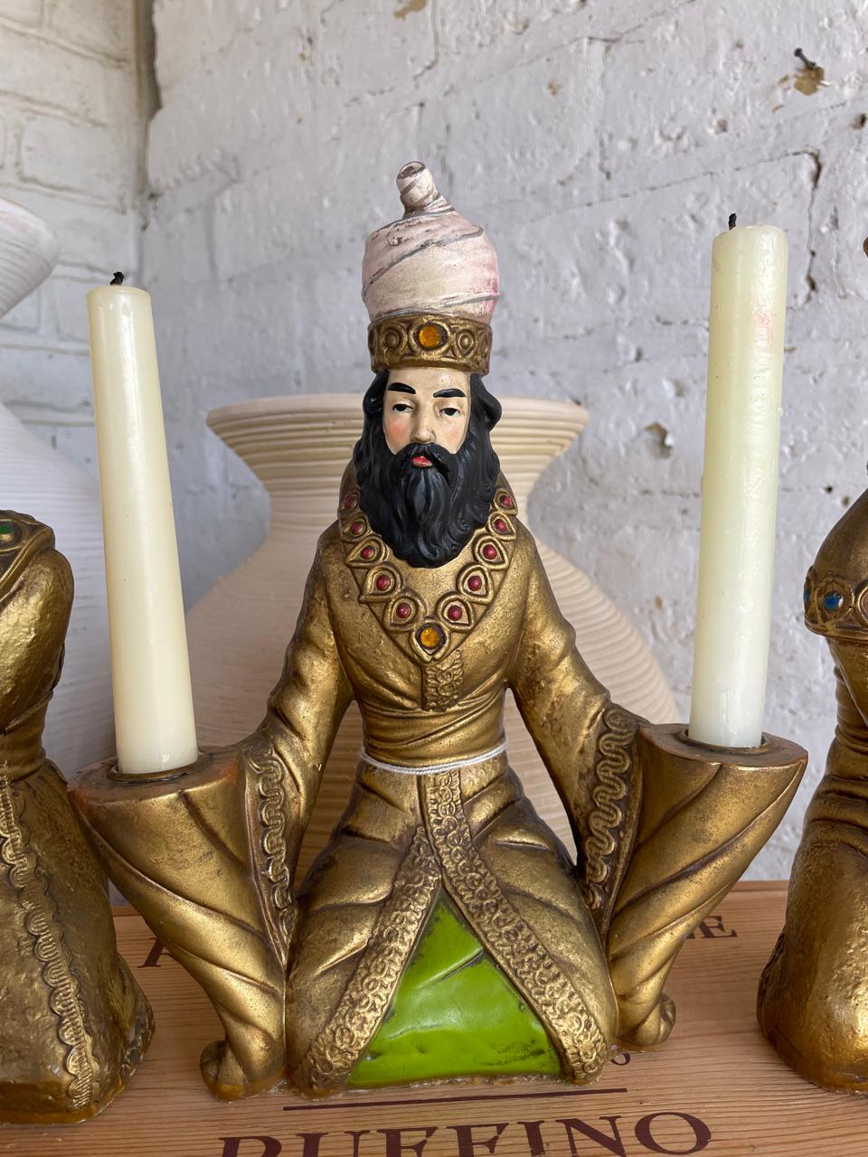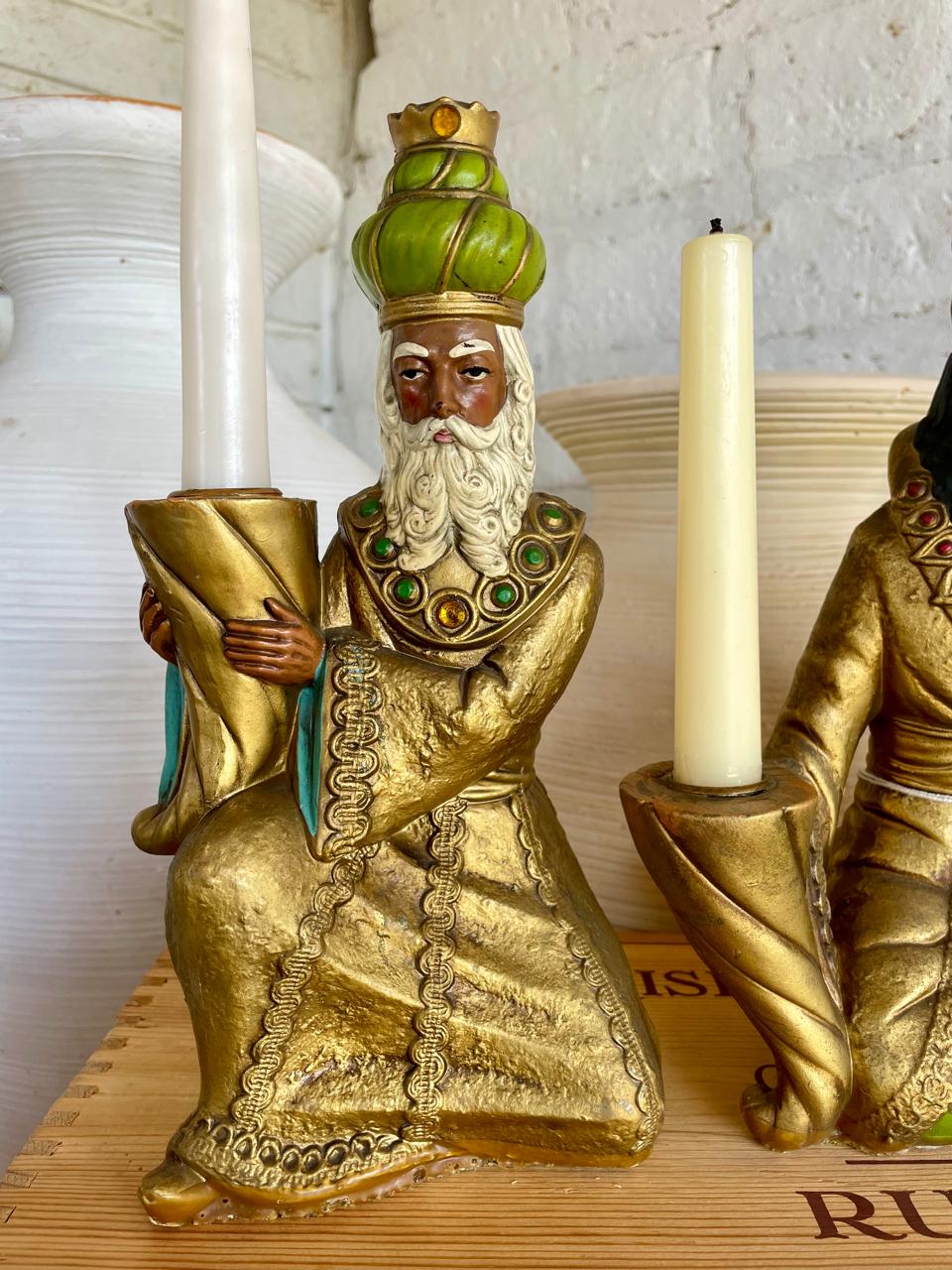 Candelabros de los 3 reyes magos elaborados en la década de los ochenta en resina de alta resistencia por la marca Kurt Adler, USA 1980. Tienen desgastes por el uso.