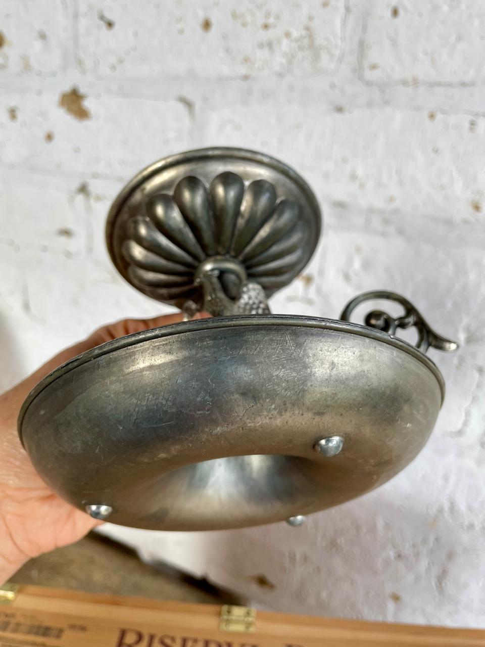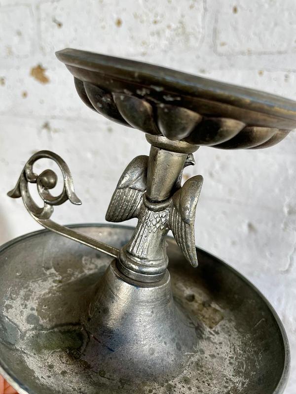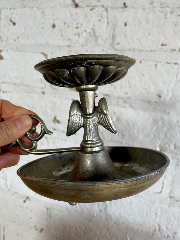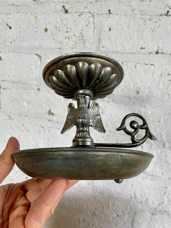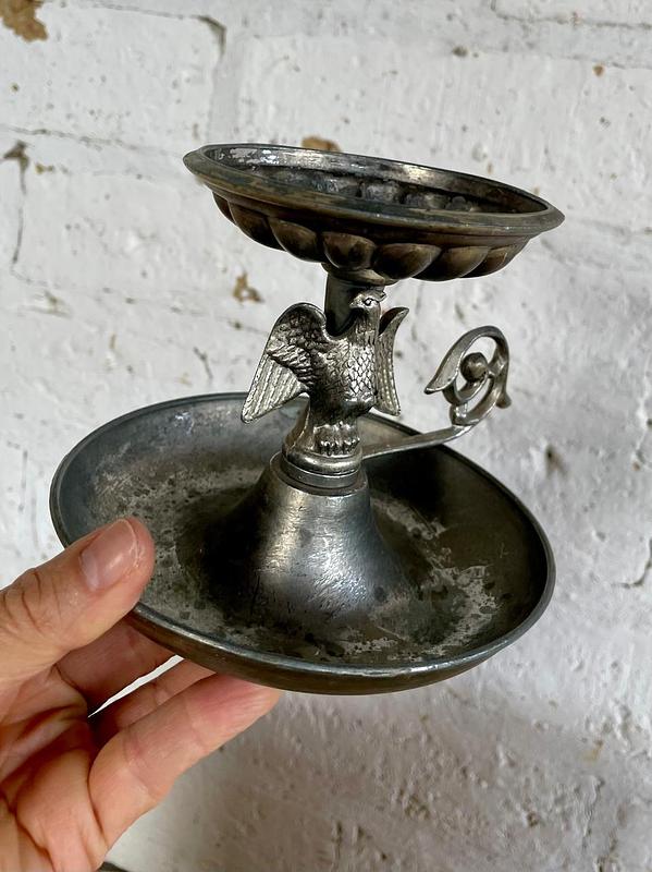 Candelero para velón, elaborado en peltre (aleación de estaño y otros metales), que le otorga ese tono grisáceo y mate característico, fabricado en los Estados Unidos en la primera mitad del S XX. Decorado con la figura del águila americana con las alas desplegadas en el soporte central y un plato de goteo en la base. De estilo colonial o federal, muy popular en la decoración patriótica estadounidense de mediados del siglo XX. Presenta señales y desgaste logrados por el paso del tiempo y el uso.
