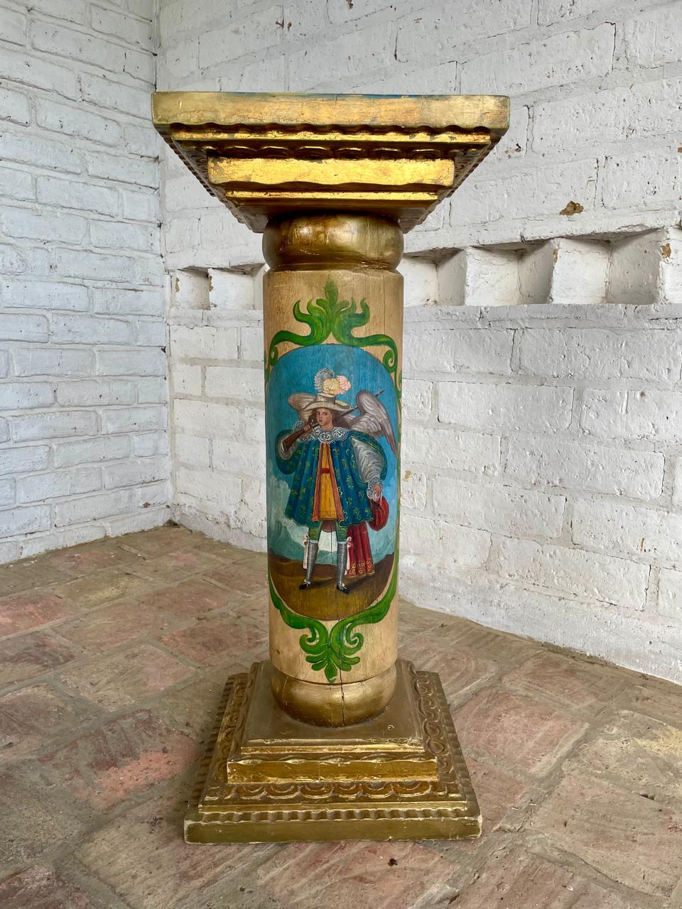 Columna colonial de madera maciza con base y capitel cuadrados con moldura dorada, la sección central cilindirca está decorada con la pintura de dos ángeles arcabuceros, un tema icónico del arte barroco andino que reemplaza la espada tradicional de los ángeles, por un arcabuz, antigua arma de fuego del S XV, iconografía desarrollada durante el periodo colonial español en America del Sur. Los ángeles lleva un atuendo militar de gala español, con una casaca (chaqueta), gregüescos (calzones) y medias, además de un sombrero chambergo adornado con plumas. La madera es pesada y se encuentra en buen estado libre de termitas.