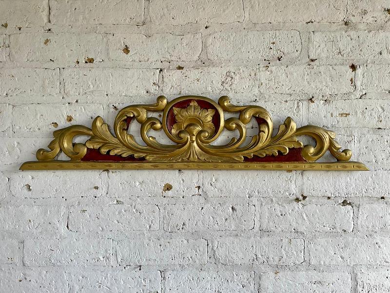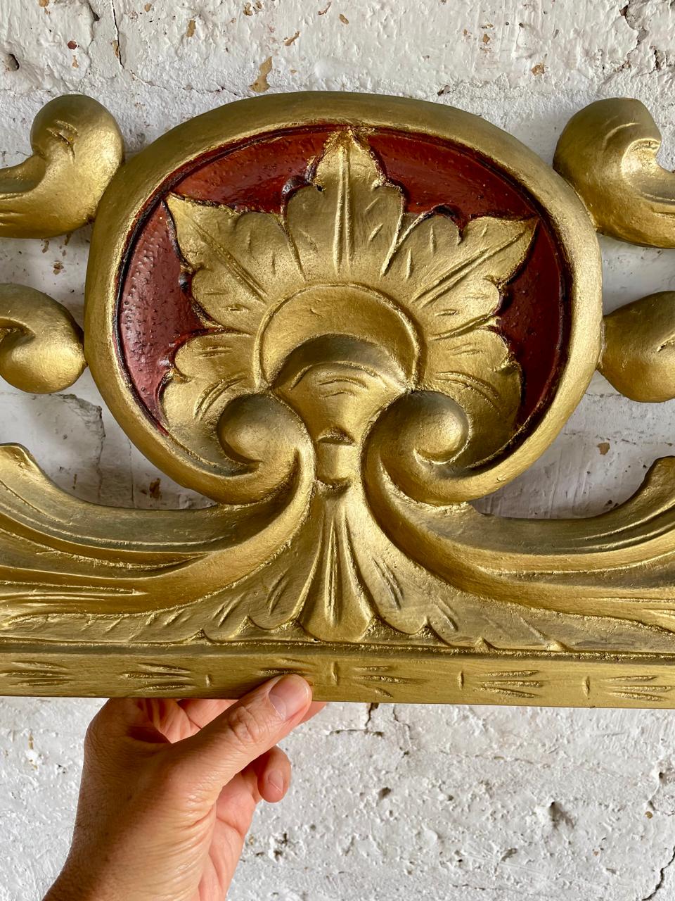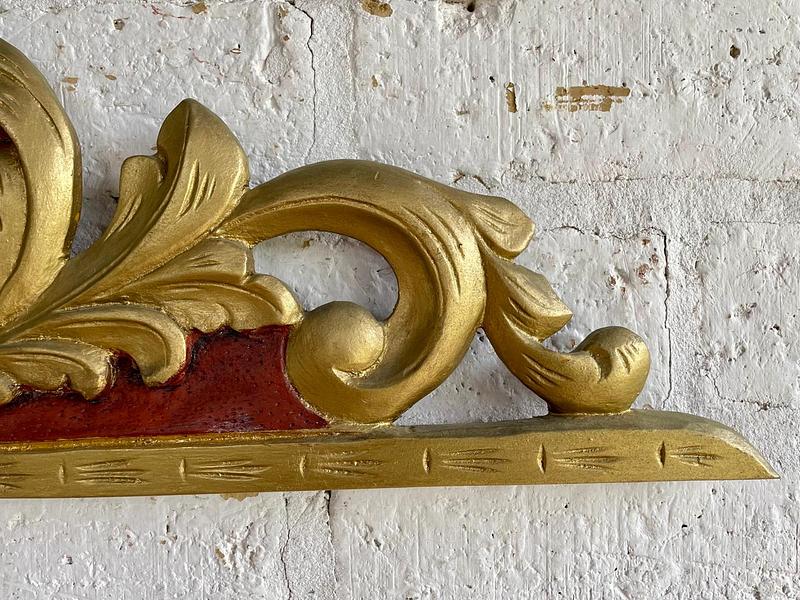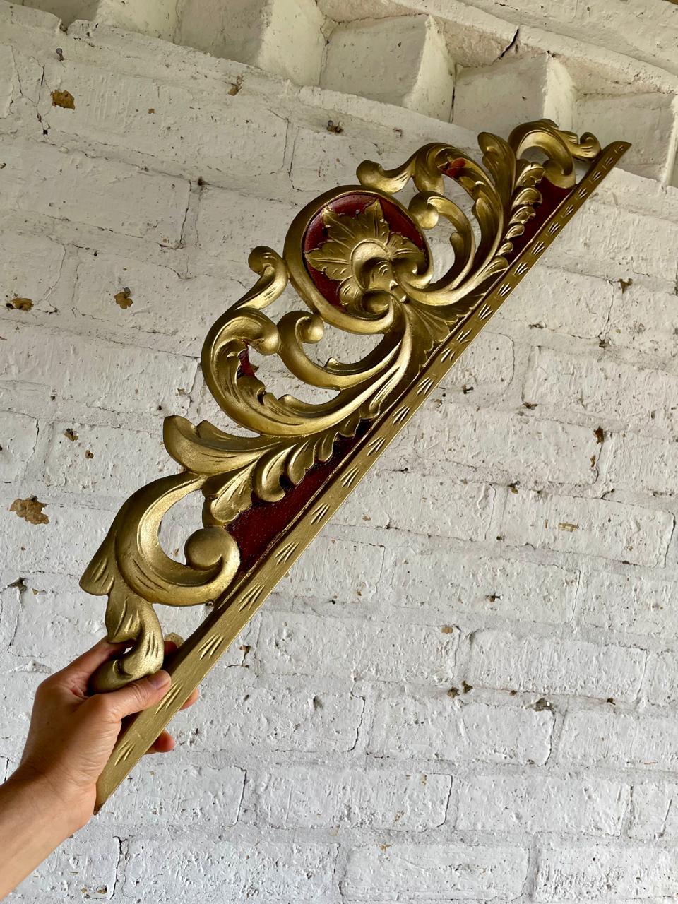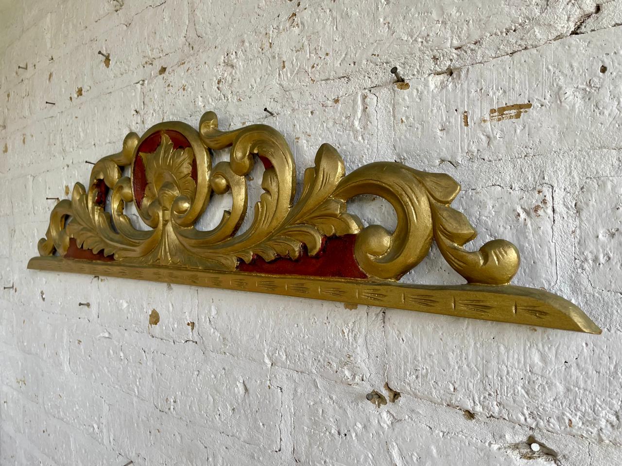 Friso antiguo tallado en madera decorado en tono dorado y rojo. Se encuentra en buen estado libre de termitas.