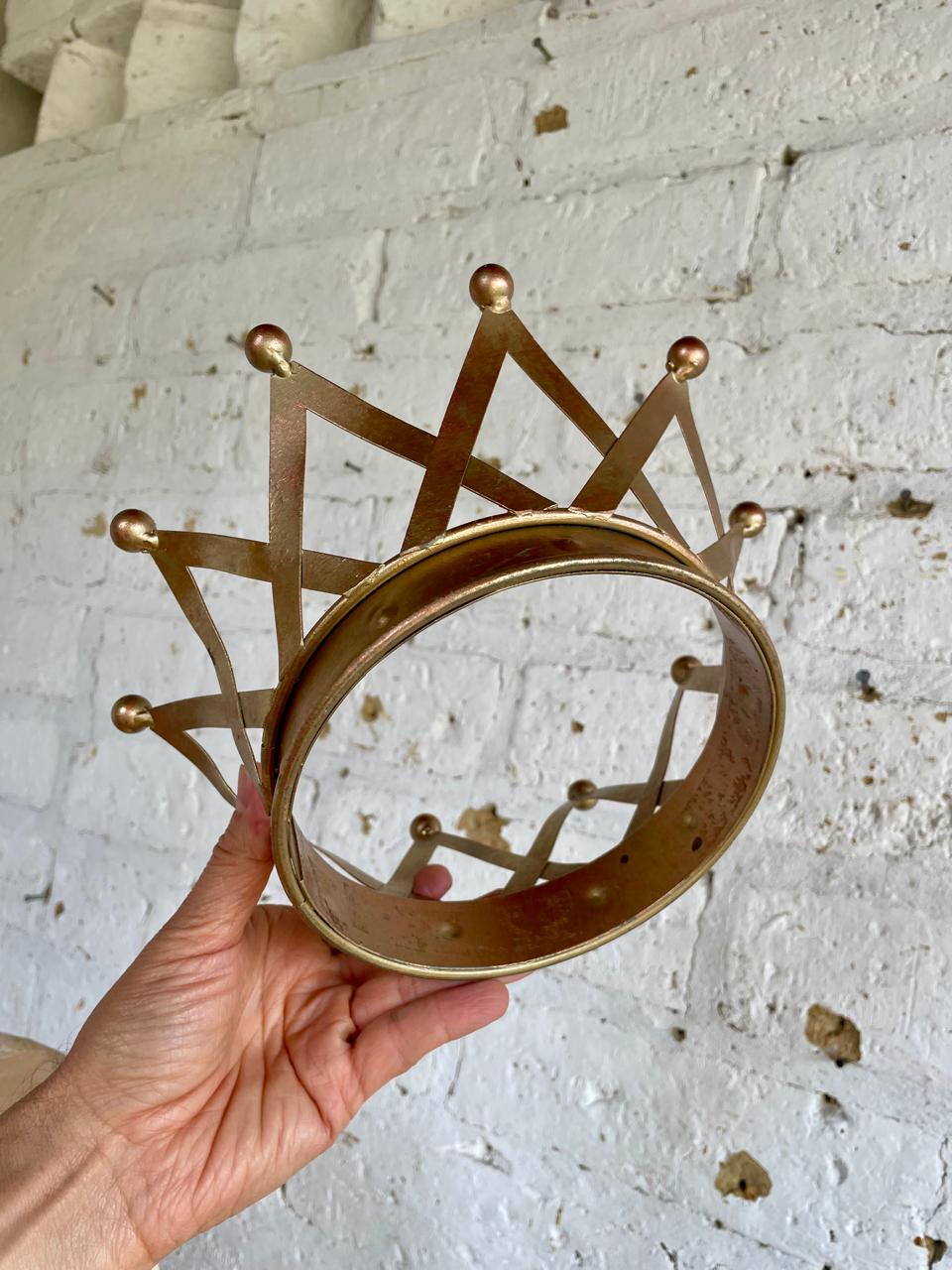 Corona decorativa de diseño clásico de 10 puntas triangulares simétricas rematadas con esferas, elaborada artesanalmente en lámina metálica guresa, el anillo de la base está decorado con pequeños relieves circulares.