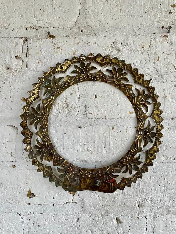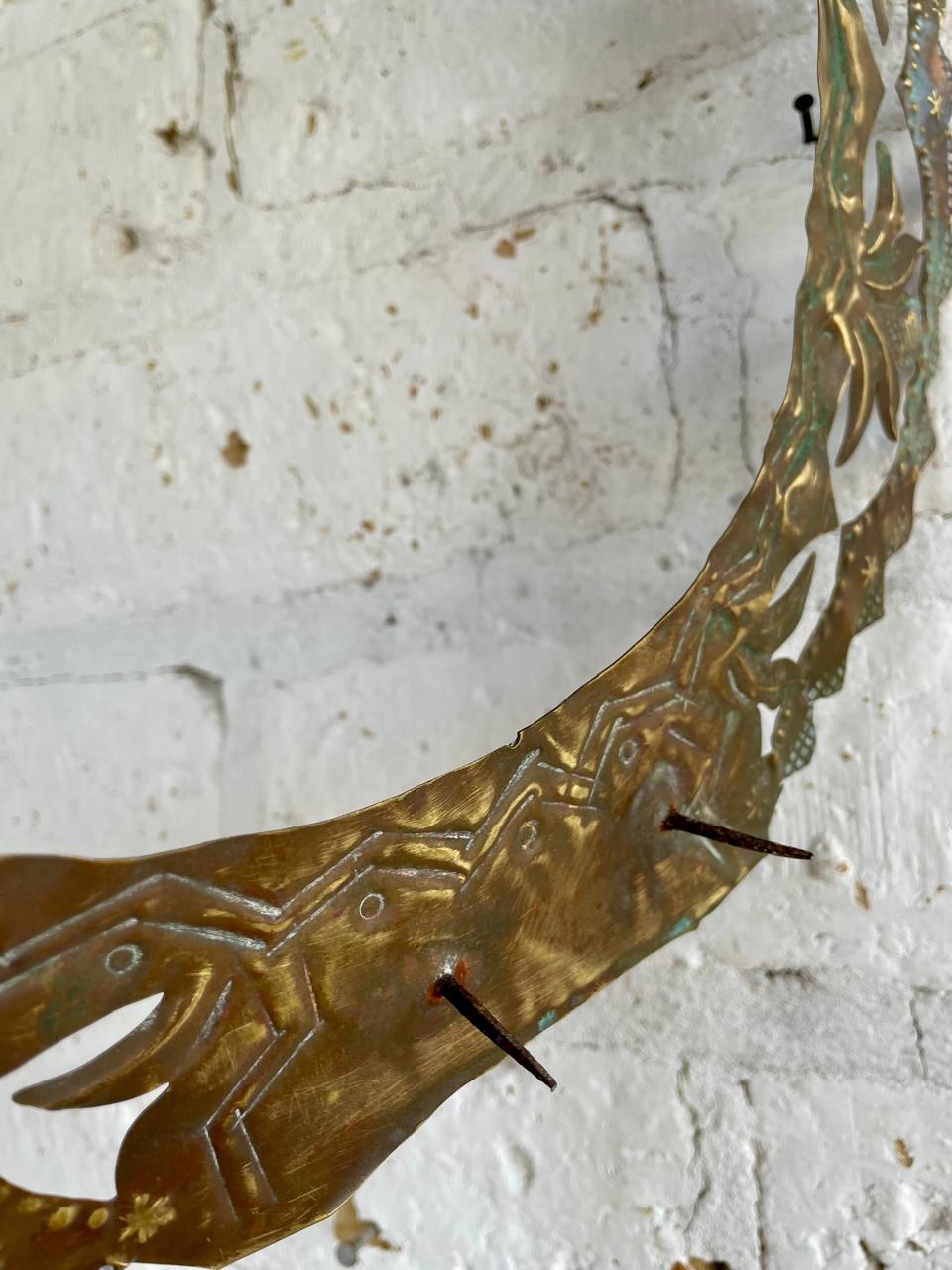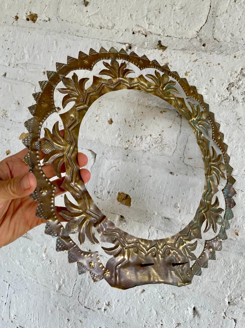 Aurelola elaborada artesanalmente en lámina gruesa de bronce repujado pertenecía a una imagen religiosa traída de Francia a inicios del S XX. En la base tiene dos clavos que permiten sujetarla a la cabeza de la imagen.
