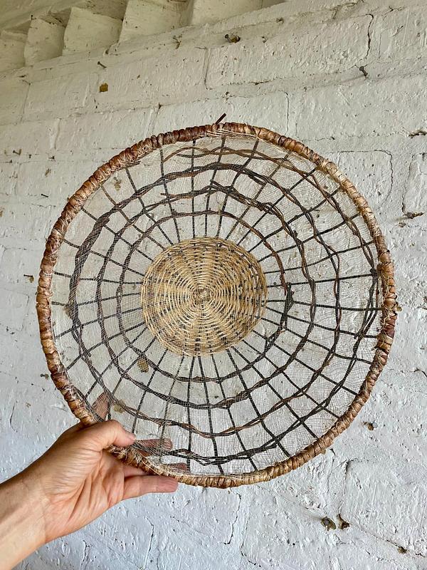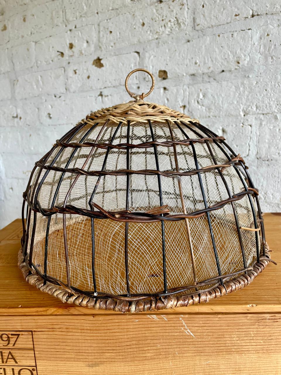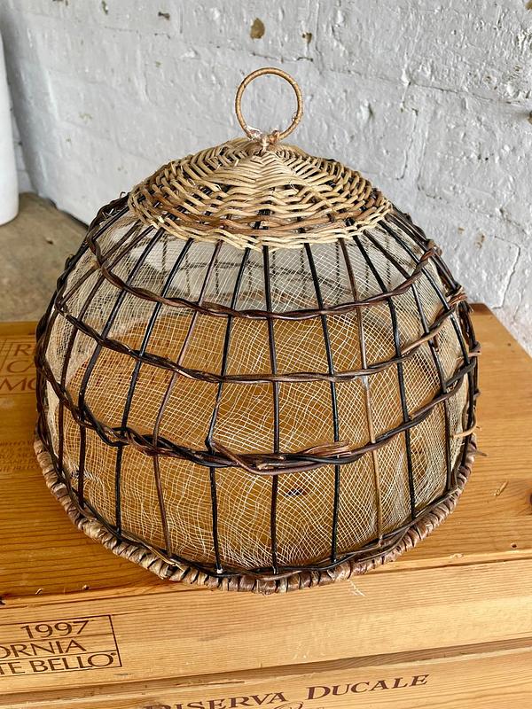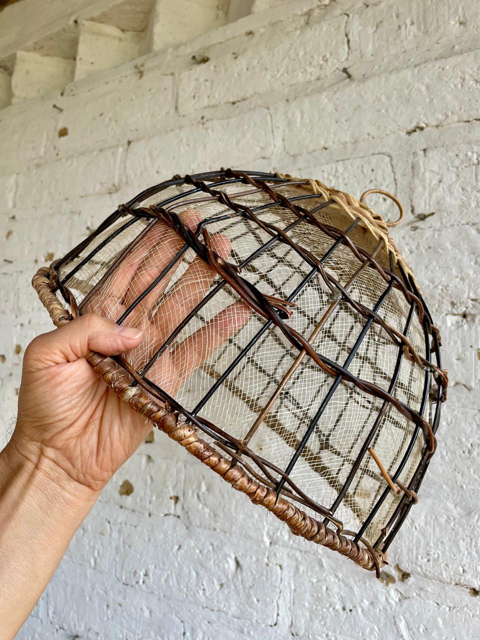 Cúpula de cocina y mesa diseñada para proteger los alimentos de elementos externos. Elaborada a mano con una estructura metálica forrada en mimbre y malla de sinamay. Se utiliza comúnmente para cubrir pan, pasteles, frutas, queso u otros postres en fiestas, picnics o mesas de comedor especialmente en exteriores donde los alimentos pueden estar expuestos a insectos. Una artesanía contemporánea de gran utilidad. La belleza de la sencillez.