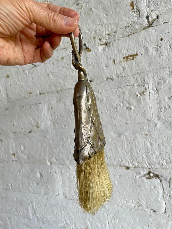Escobilla antigua de mesa estilo Art Nouveau, francesa de mediados del S XX. Elaborado en bronce, con un acabado que sugiere un baño de plata que ha sido desgastado con el uso y el paso del tiempo, revelando el metal base. El mango tiene un diseño intrincado en forma de hoja o pétalo de flor, con detalles cincelados y un anillo superior para colgarlo. El diseño es elegante y curvo, típico de la época. Se utilizaba para limpiar migas u otros pequeños residuos de una superficie de mesa o tocador. Las cerdas son de color claro, probablemente de pelo natural, y están firmemente sujetas en la base del cuerpo metálico.