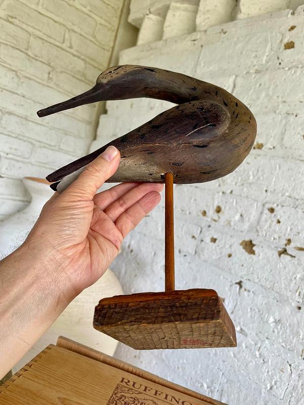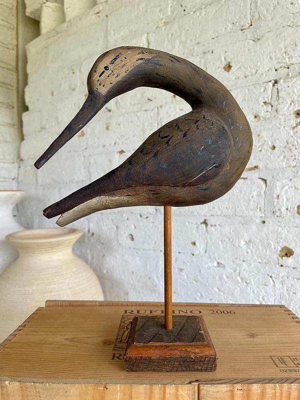 Talla artesanal rústica de madera de un zarapito, ave migratoria que se reproduce en el emisferio norte: tundra ártica, Alaska, Canadá, norte de Europa y Asia durante el verano boreal y en el invierno, migran al hemisferio sur, incluyendo costas de Chile, Australia y África.