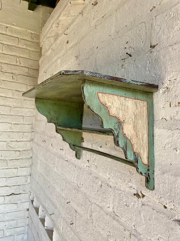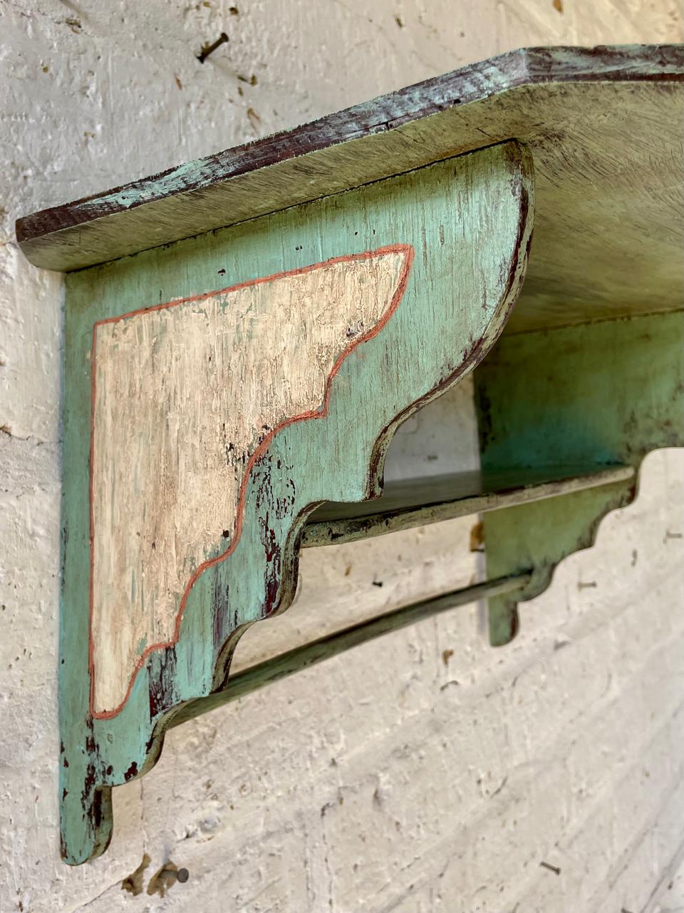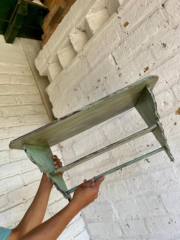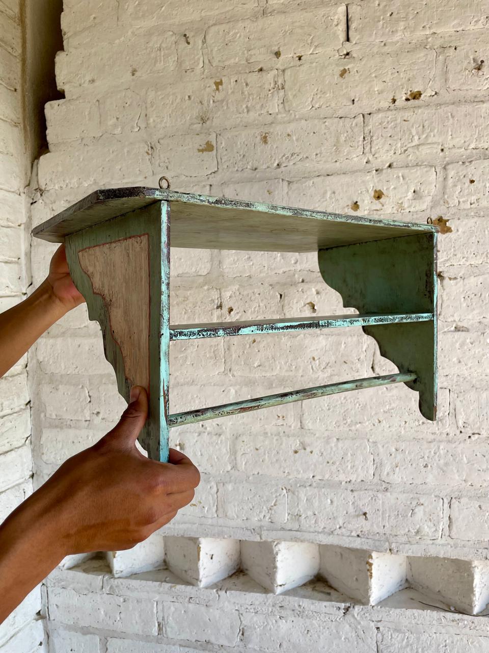 Repisa en madera de los años setenta, la madera se encuentra en buen estado, la pintura original presenta desgastes y peladuras.