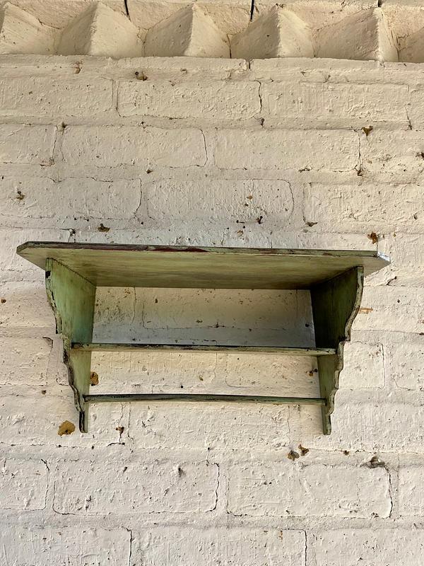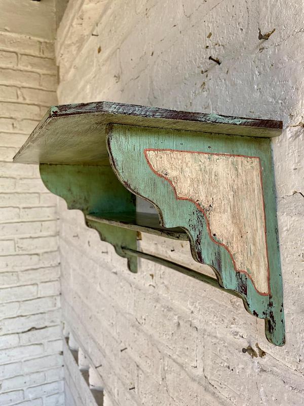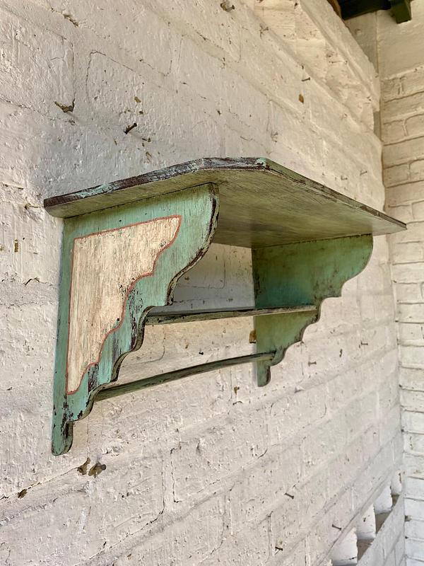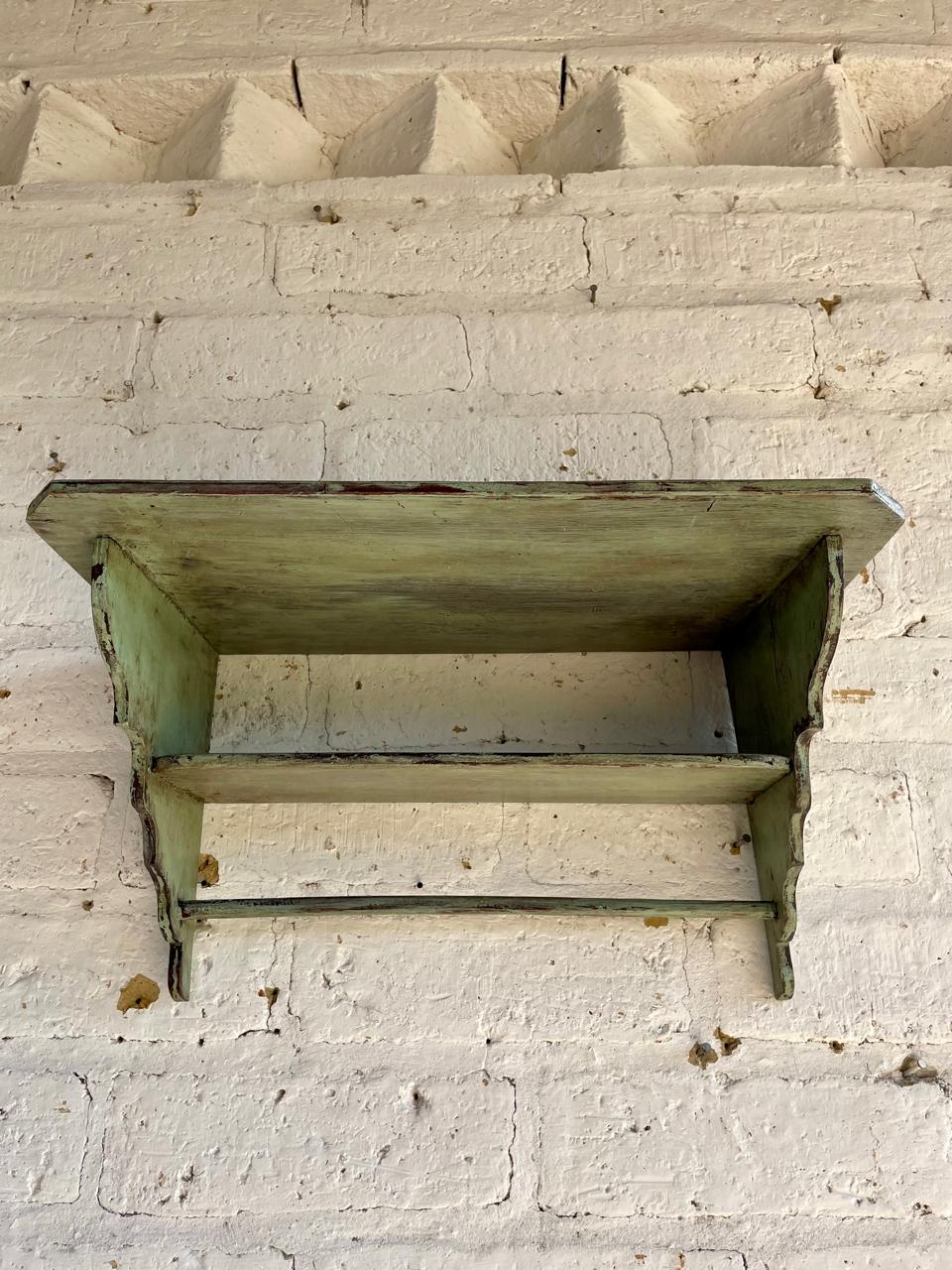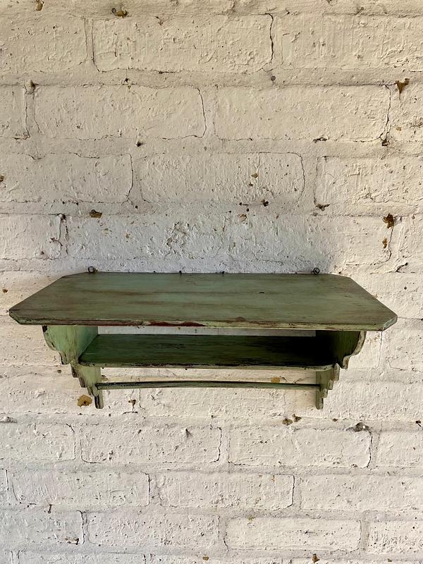 Repisa en madera de los años setenta, la madera se encuentra en buen estado, la pintura original presenta desgastes y peladuras.