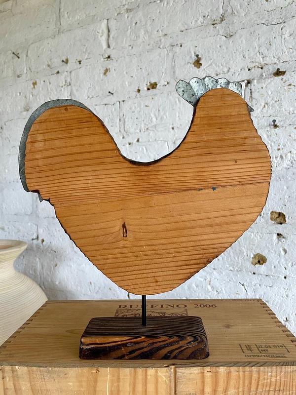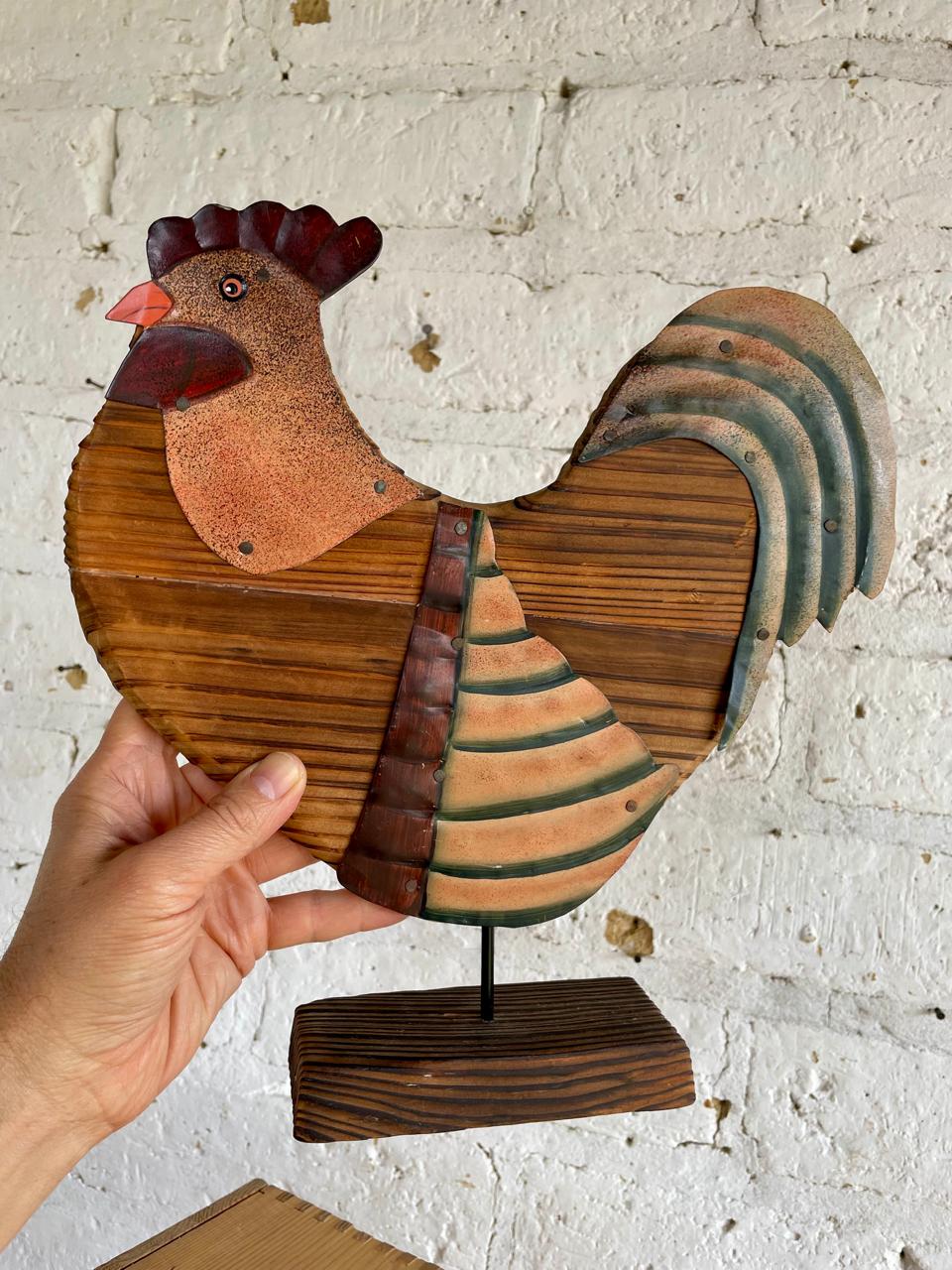 Figura de gallo en tabla de madera con pedestal decorado con láminas de aluminio pintadas.