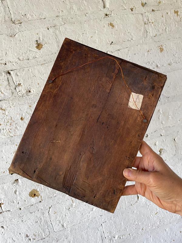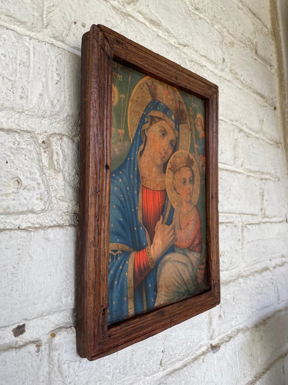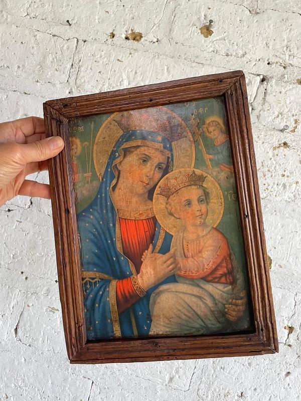 Cuadro campesino de la Virgen del Perpetuo Socorro, elaborado con una imagen impresa en cartón grueso pegada sobre una tabla tosca enmarcada con moldura burda de madera. Estas láminas eran traidas de Europa por los Frailes Dominicos, los campesinos las aquirían en la Basílica de Chiquinquirá y la enmarcaban rústicamente generando esta iconografía religiosa popular de la primera mitad del S XX, conservándolas en las casas rurales de los abuelos hasta nuestros días. La lámina se encuentra en buen estado con manchas de humo y residuos adquiridos a través del tiempo. La madera libre de termitas presenta desgastes y desastilladuras.