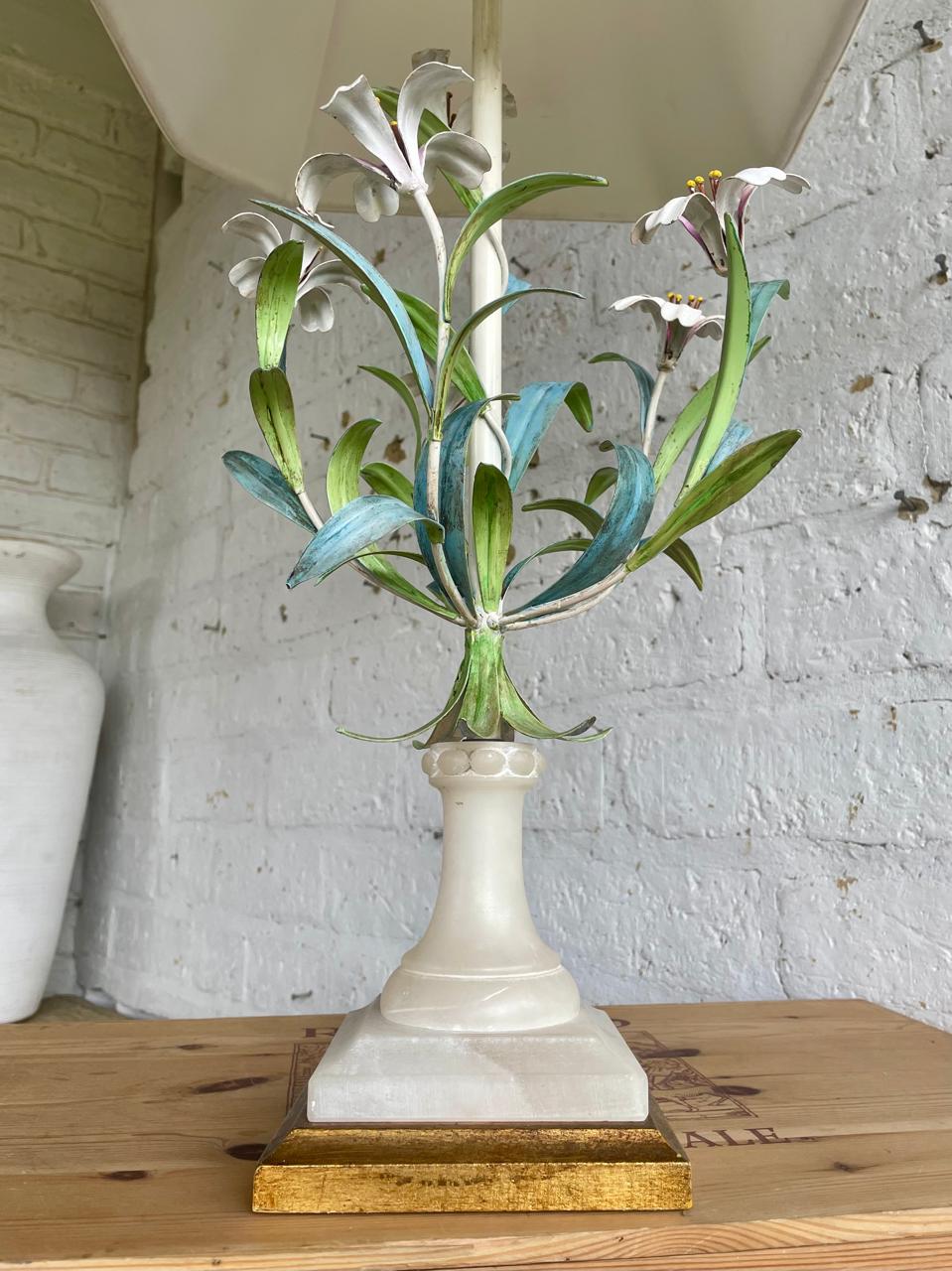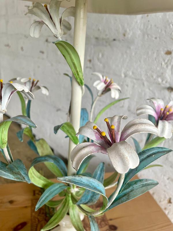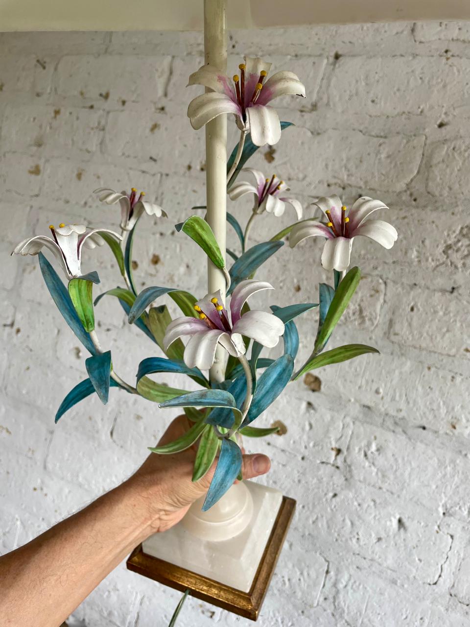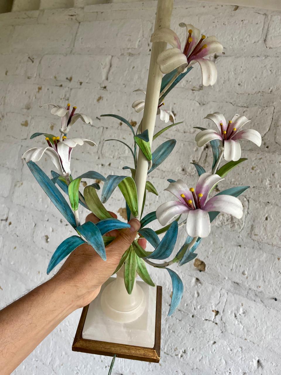 Lámpara italiana elaborada artesanalmente en los años sesenta. La base es en madera con cuello esculpido en alabastro, el eje central está adornado con 6 lirios y hojas en lámina metálica gruesa decorados con barníz patinado en colores pastel. Se le ha puesto una caperuza nueva en lino forrada. El sistema eléctrico funciona bien. La base está marcada MADE IN ITALY.