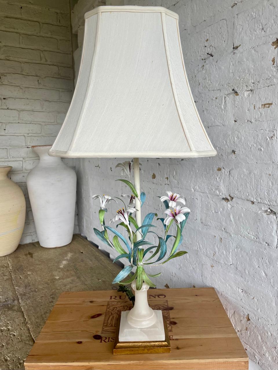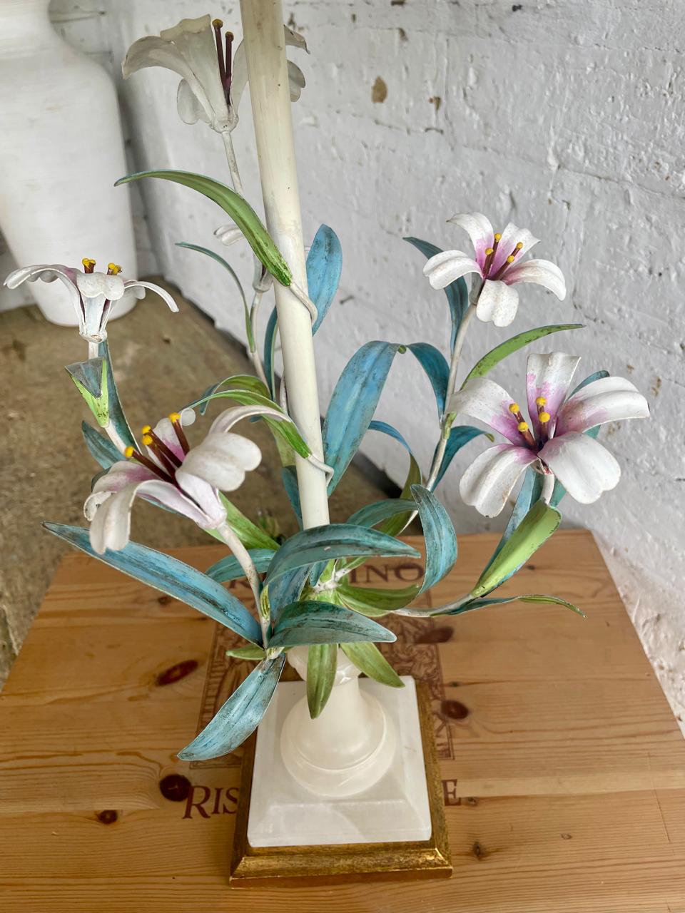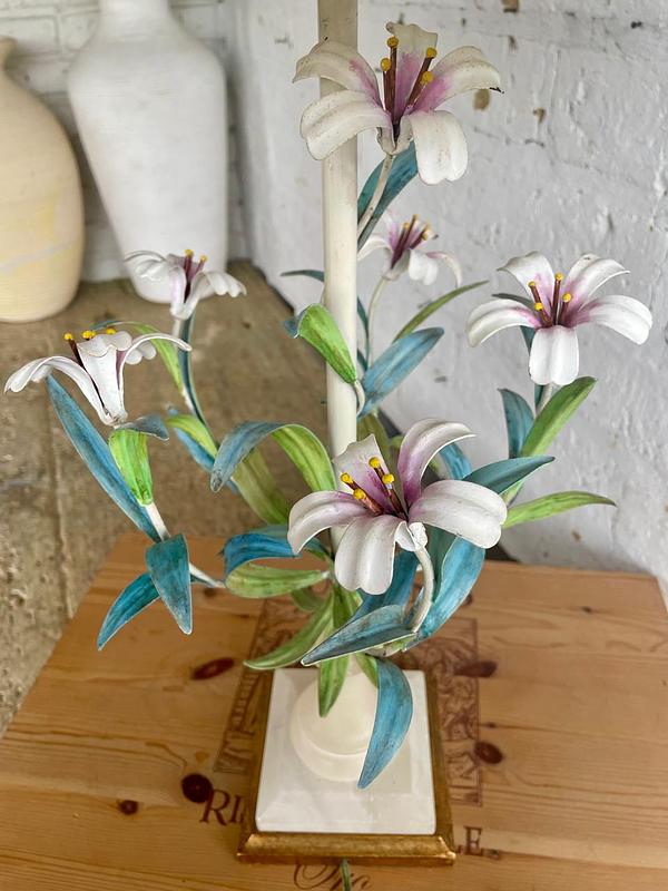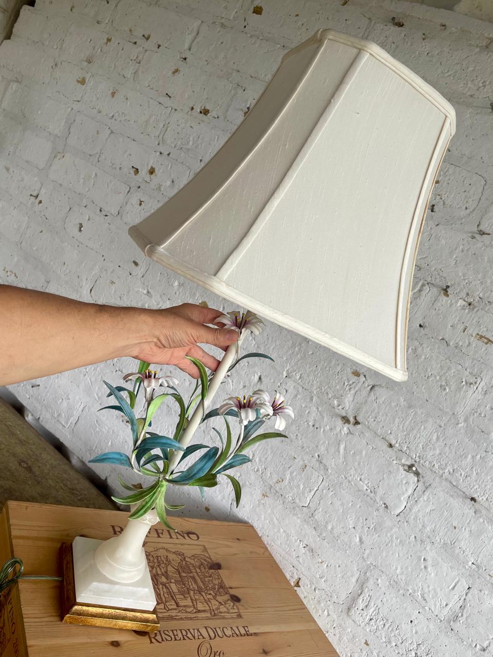Lámpara italiana elaborada artesanalmente en los años sesenta. La base es en madera con cuello esculpido en alabastro, el eje central está adornado con 6 lirios y hojas en lámina metálica gruesa decorados con barníz patinado en colores pastel. Se le ha puesto una caperuza nueva en lino forrada. El sistema eléctrico funciona bien. La base está marcada MADE IN ITALY.