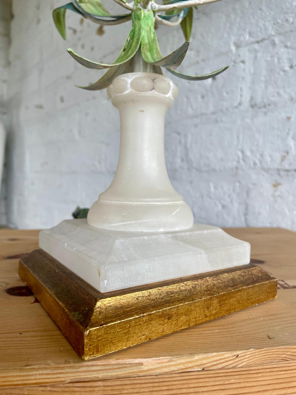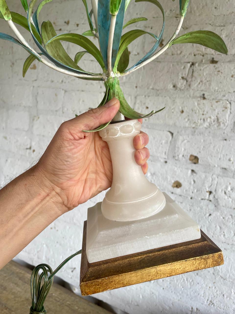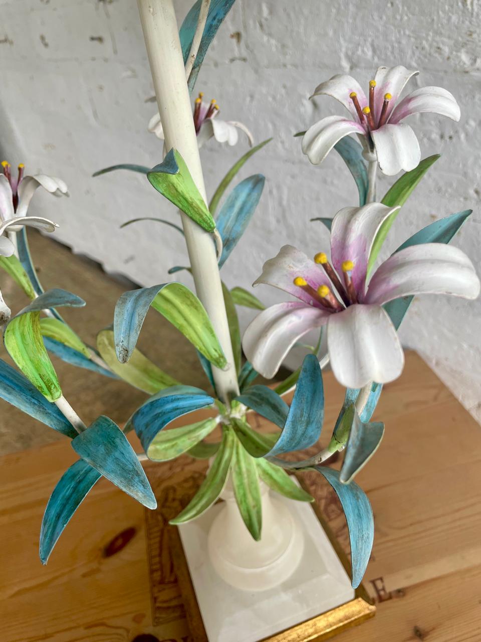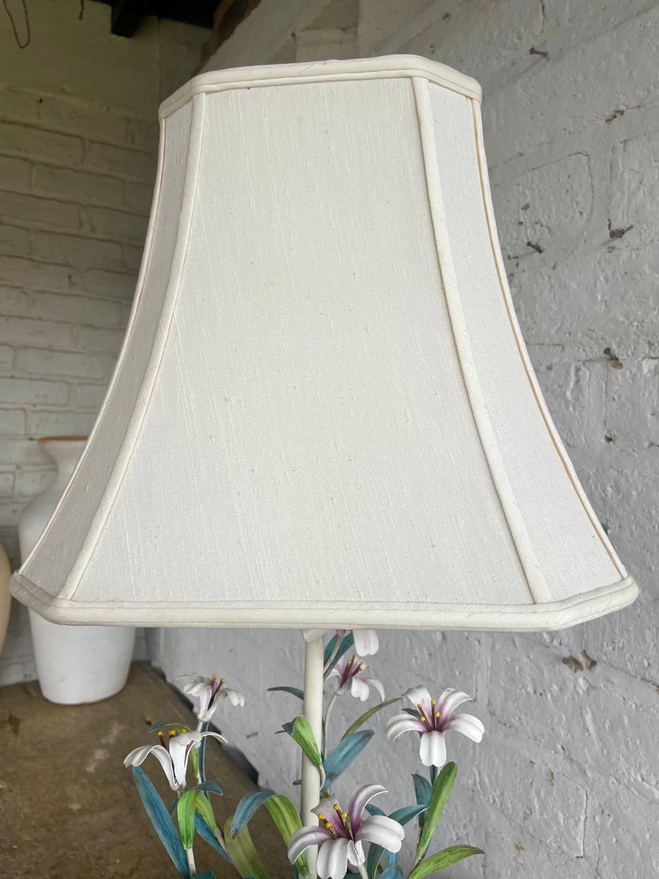 Lámpara italiana elaborada artesanalmente en los años sesenta. La base es en madera con cuello esculpido en alabastro, el eje central está adornado con 6 lirios y hojas en lámina metálica gruesa decorados con barníz patinado en colores pastel. Se le ha puesto una caperuza nueva en lino forrada. El sistema eléctrico funciona bien. La base está marcada MADE IN ITALY.