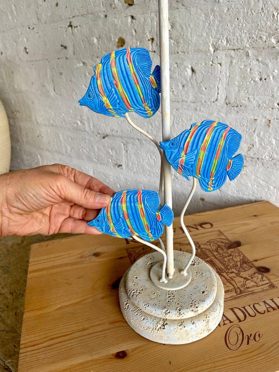 Lámpara con base en resina extrafuerte y apariencia de piedra coralina, el eje central de tubo metálico, los peces son de lámina metálica gruesa y la caperuza es de lino forrada con cuentas sintéticas como fleco. Utiliza bombillo de rosca E 24.