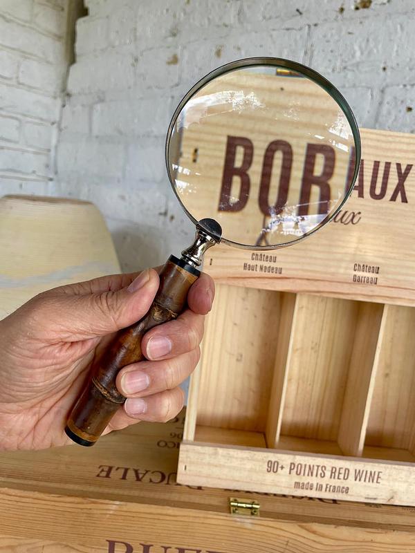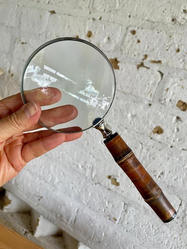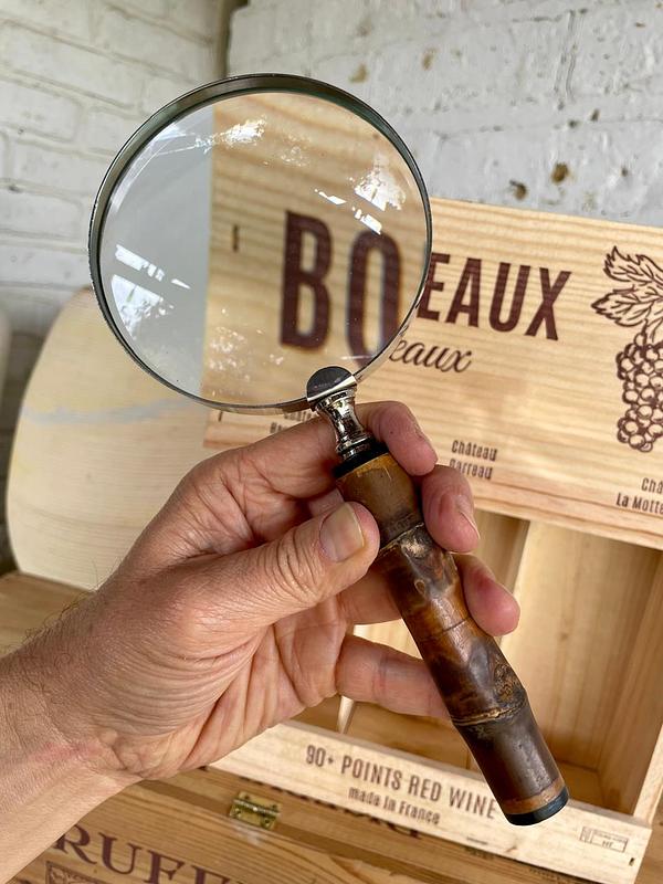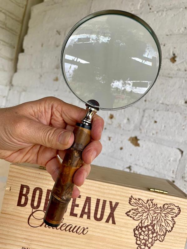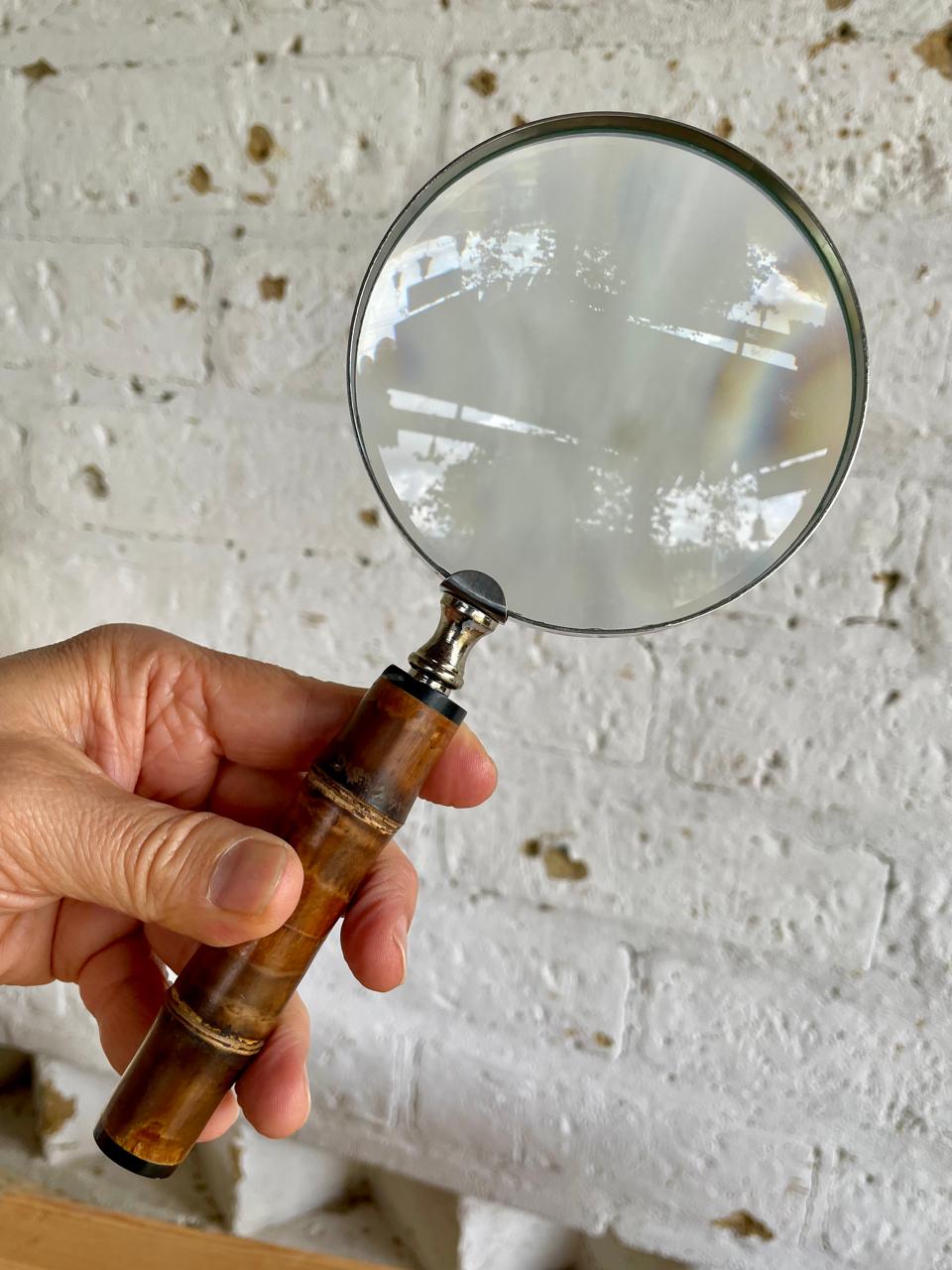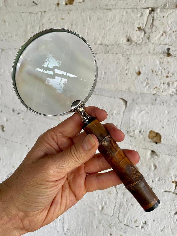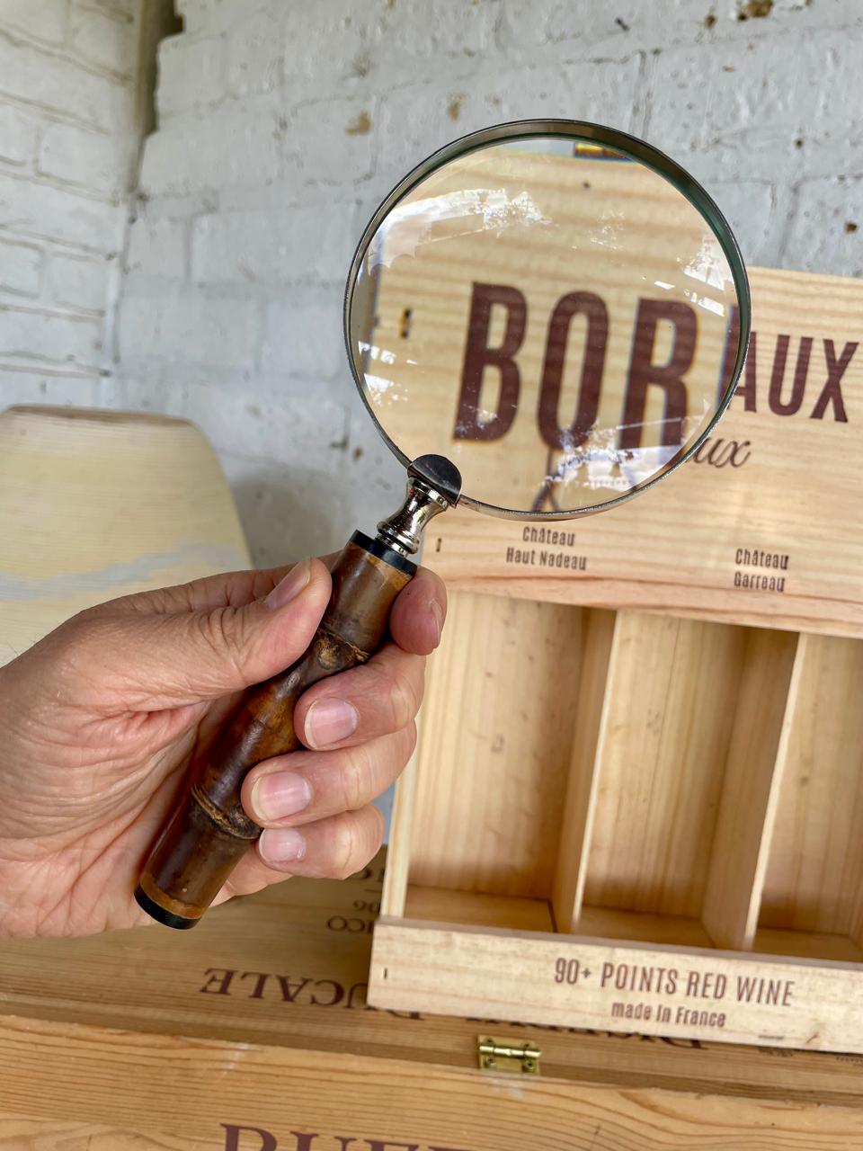 Lupa de mano lente de vidrio 10X, mango de madera y marco en acero inoxidable.